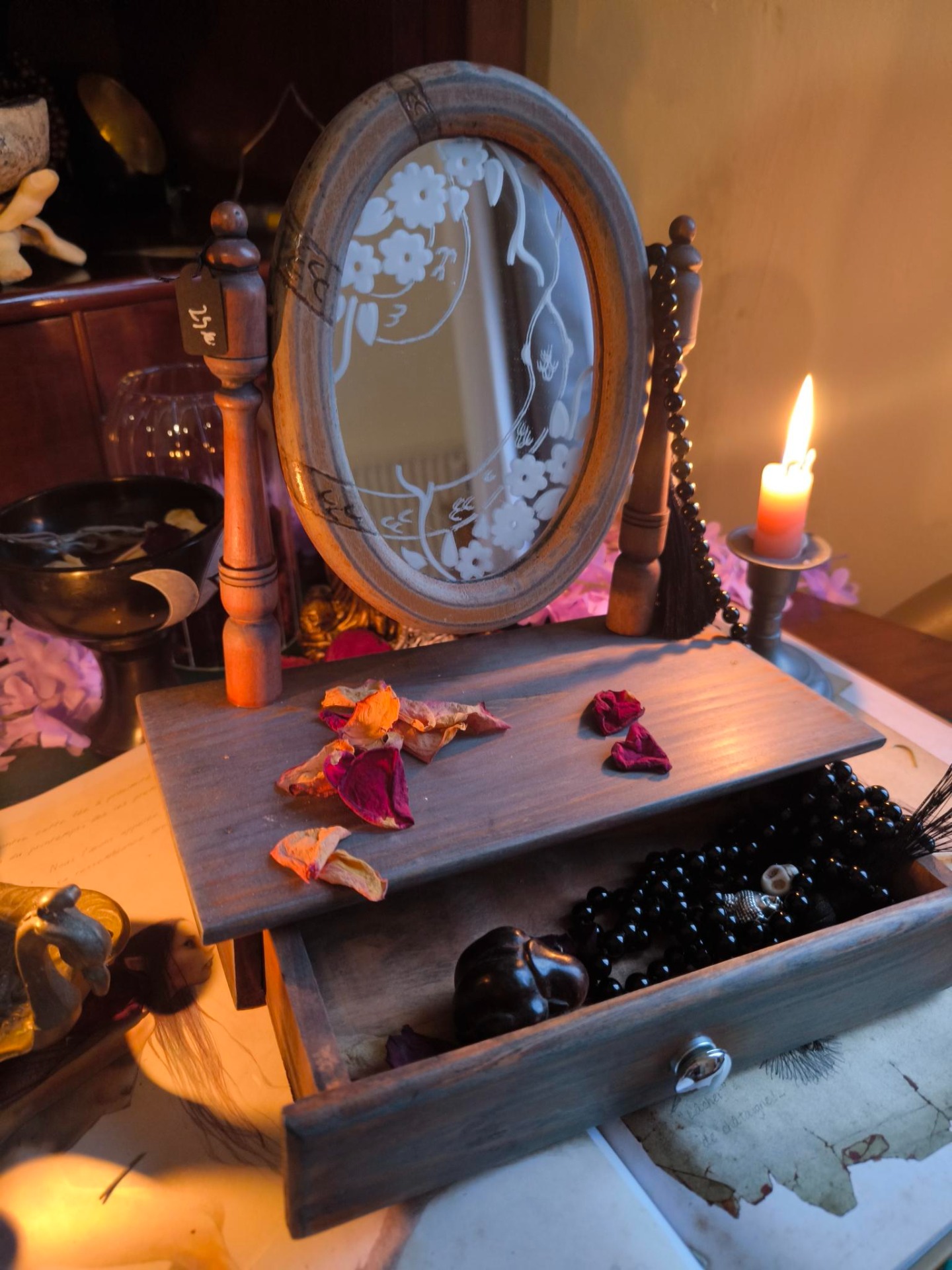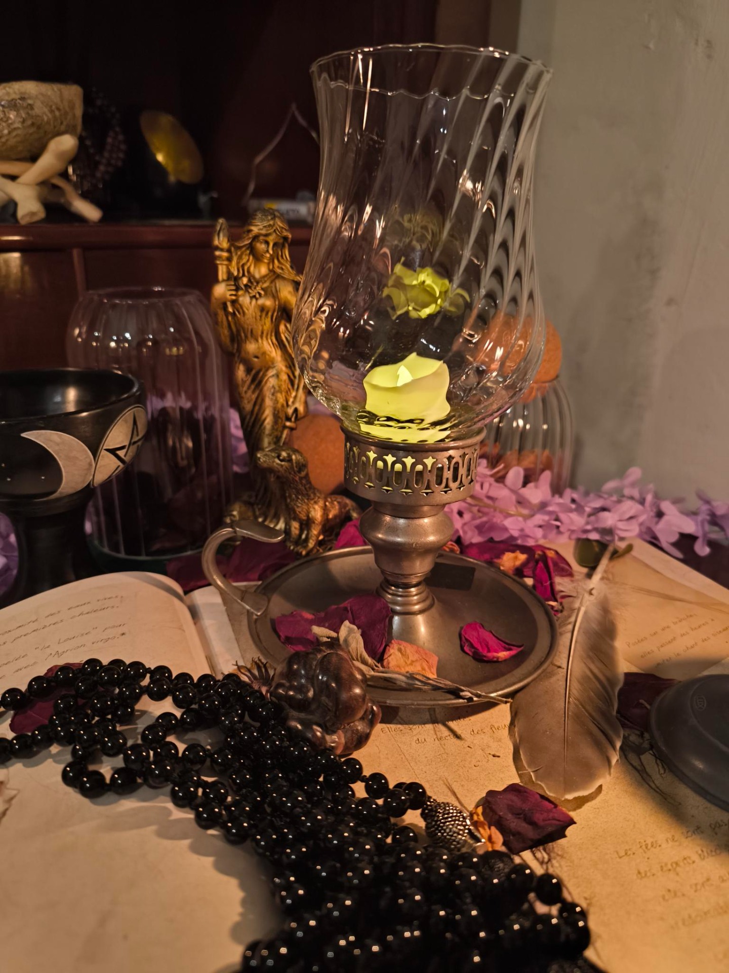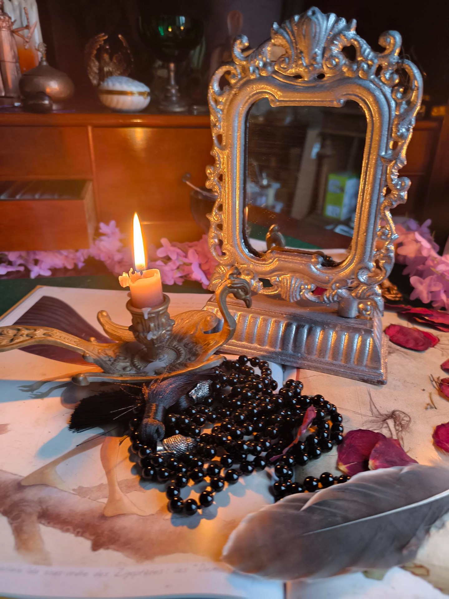 Rien n'est vide, rien n'est neutre : chaque pièce a déjà vécu, chaque objet a son passé. Arrivés chez moi, ils sont purifiés, bénis, enveloppés de lumière afin d'être prêts à reprendre leur voyage et à trouver leur place sur vos autels, dans vos rituels, vos offrandes,vos libations. vos élans de passion.