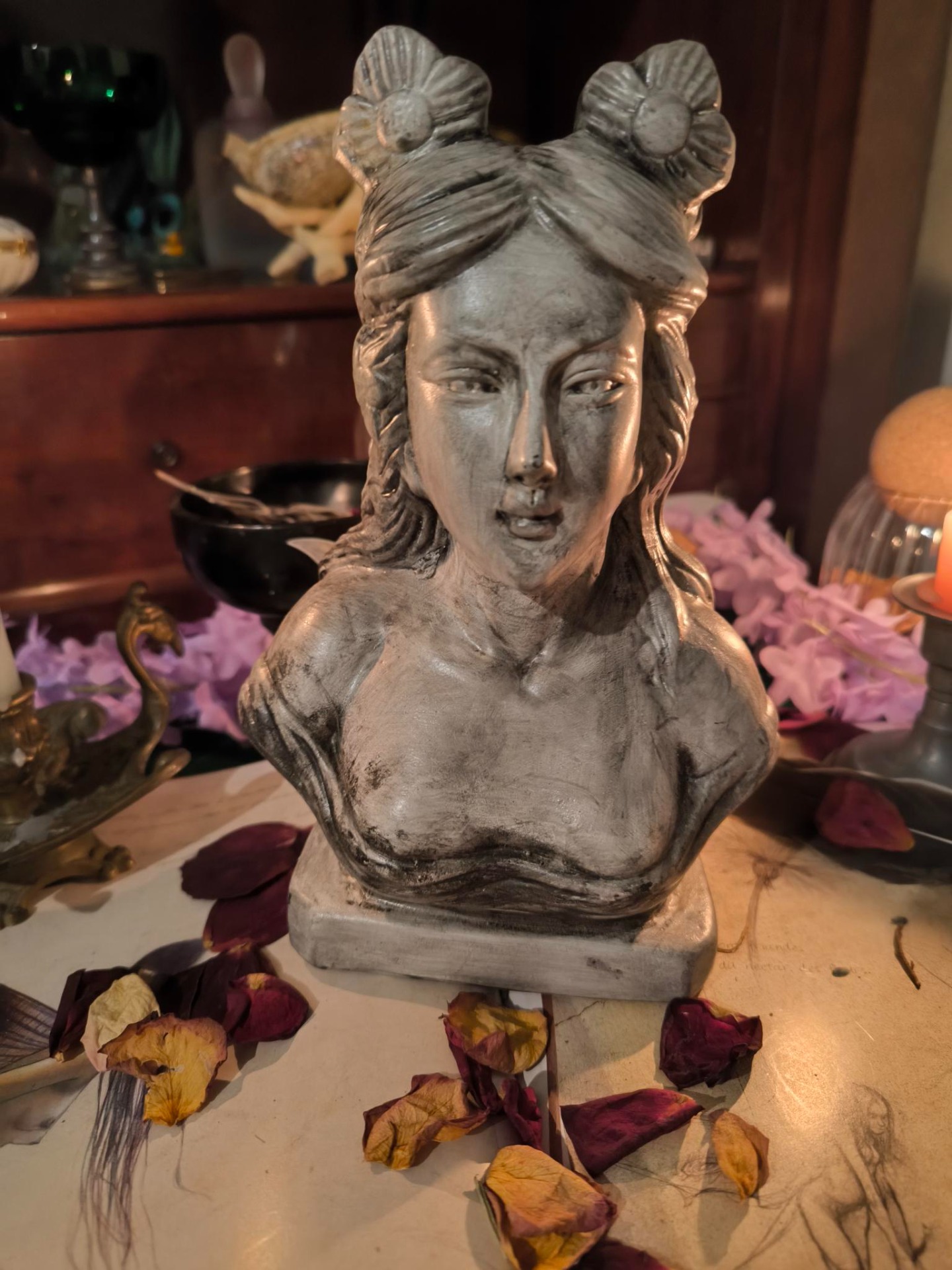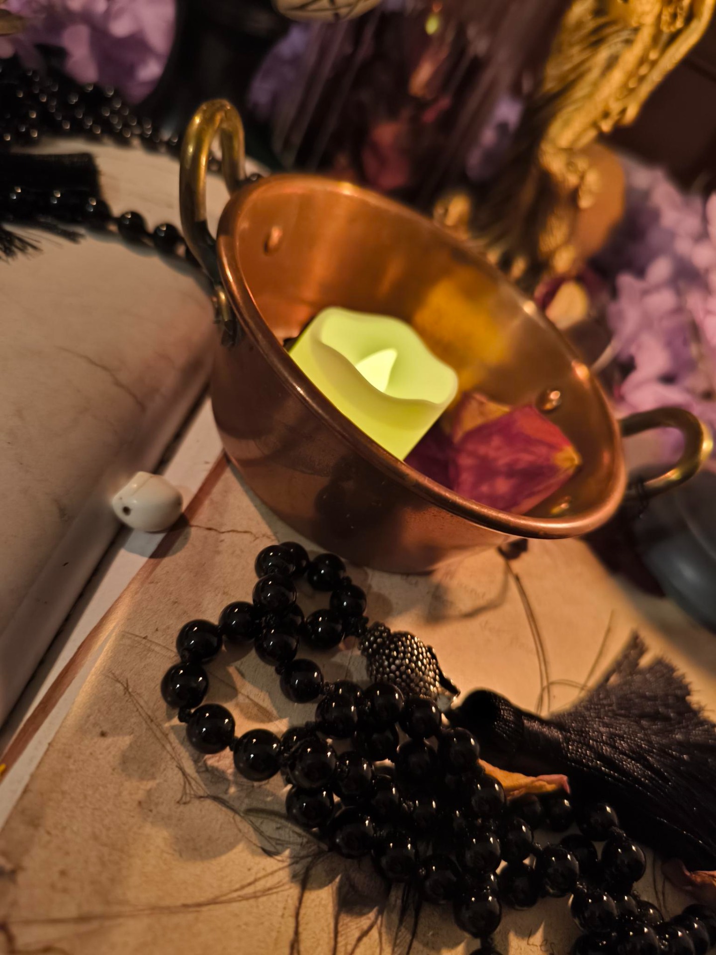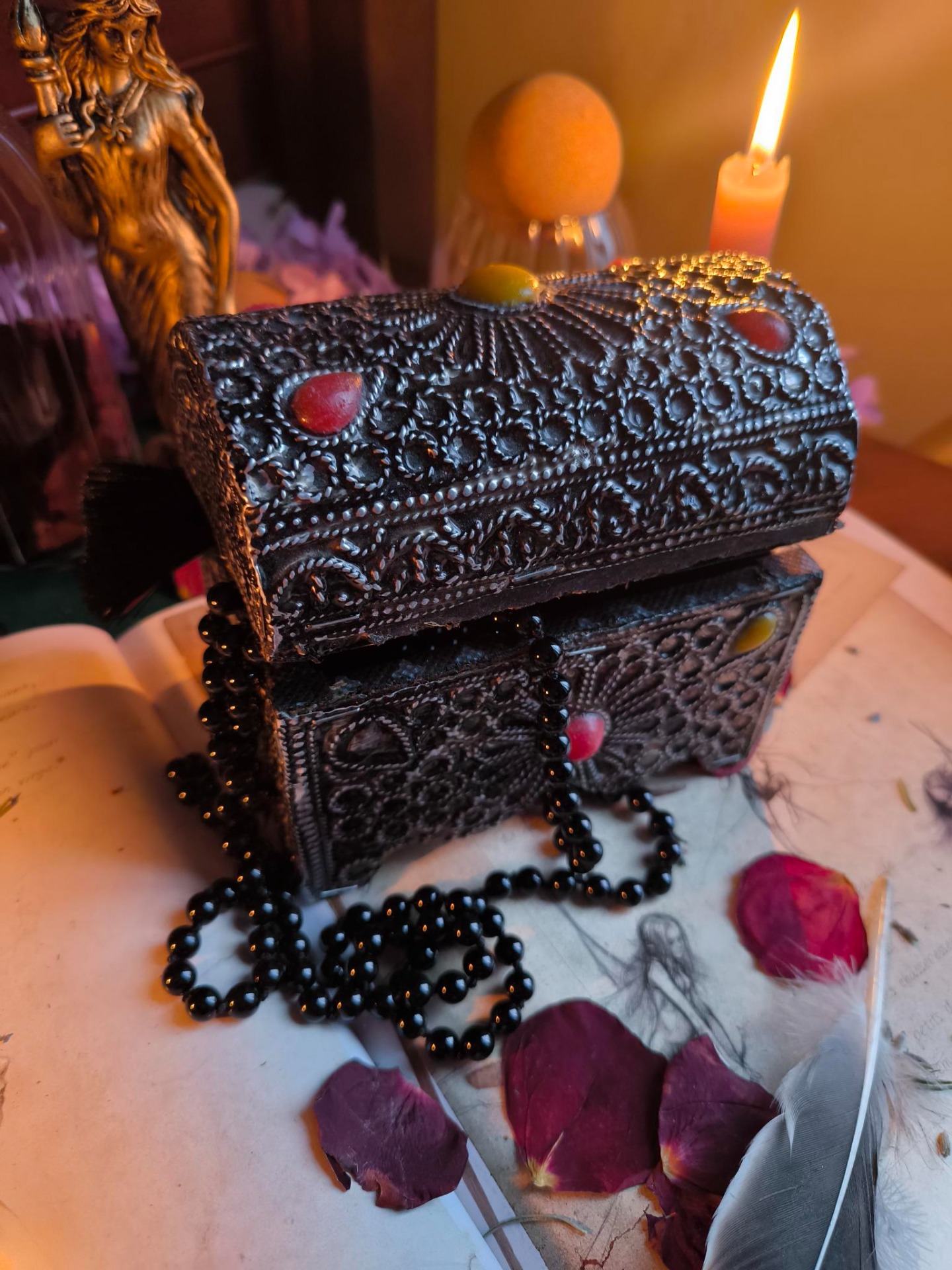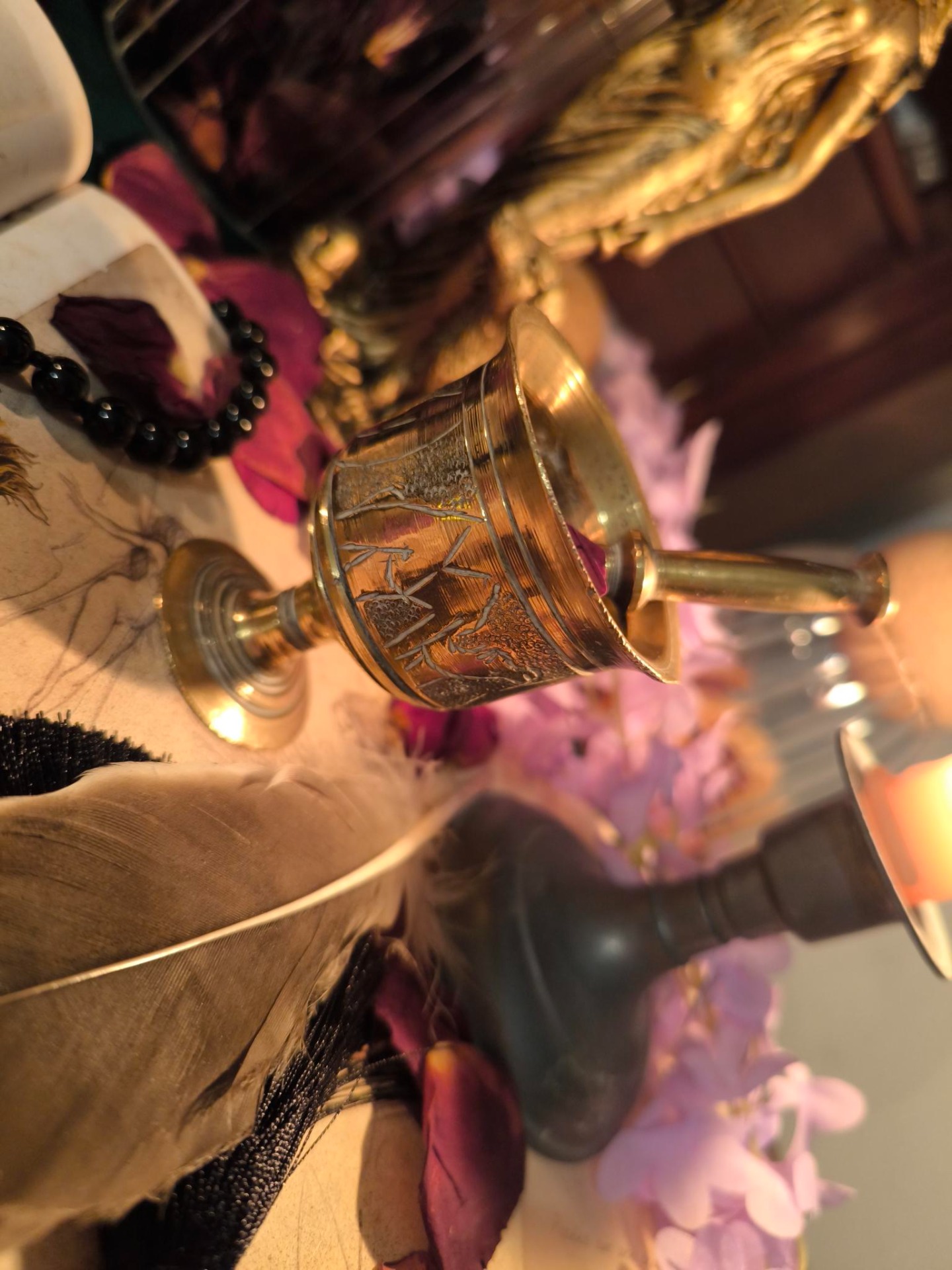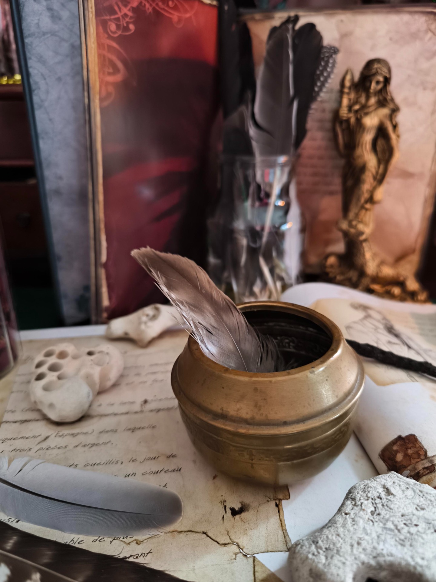 Rien n'est vide, rien n'est neutre : chaque pièce a déjà vécu, chaque objet a son passé. Arrivés chez moi, ils sont purifiés, bénis, enveloppés de lumière afin d'être prêts à reprendre leur voyage et à trouver leur place sur vos autels, dans vos rituels, vos offrandes,vos libations. vos élans de passion.