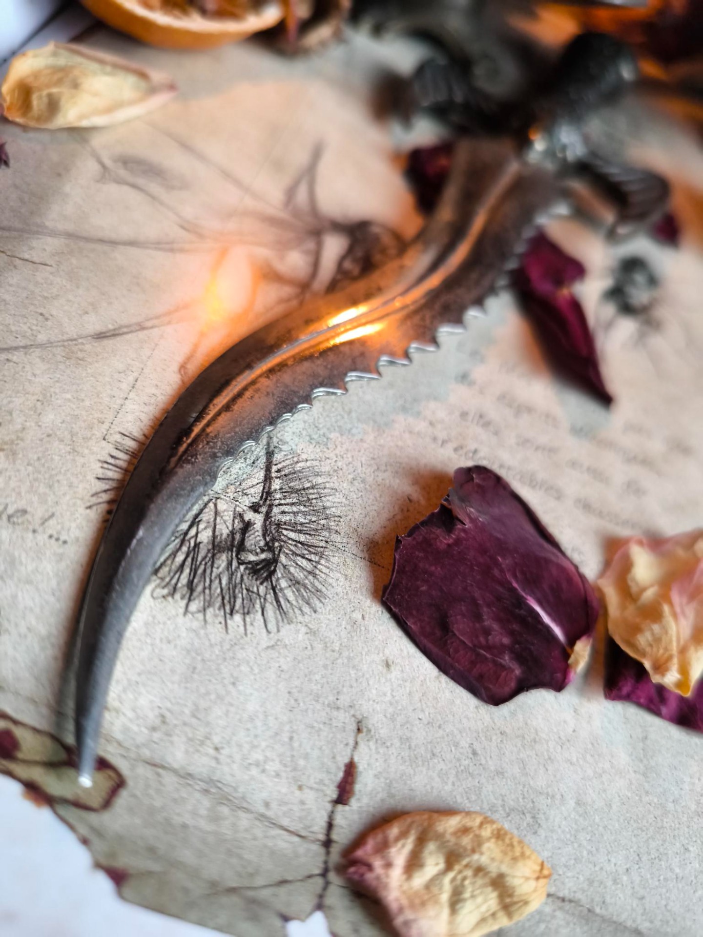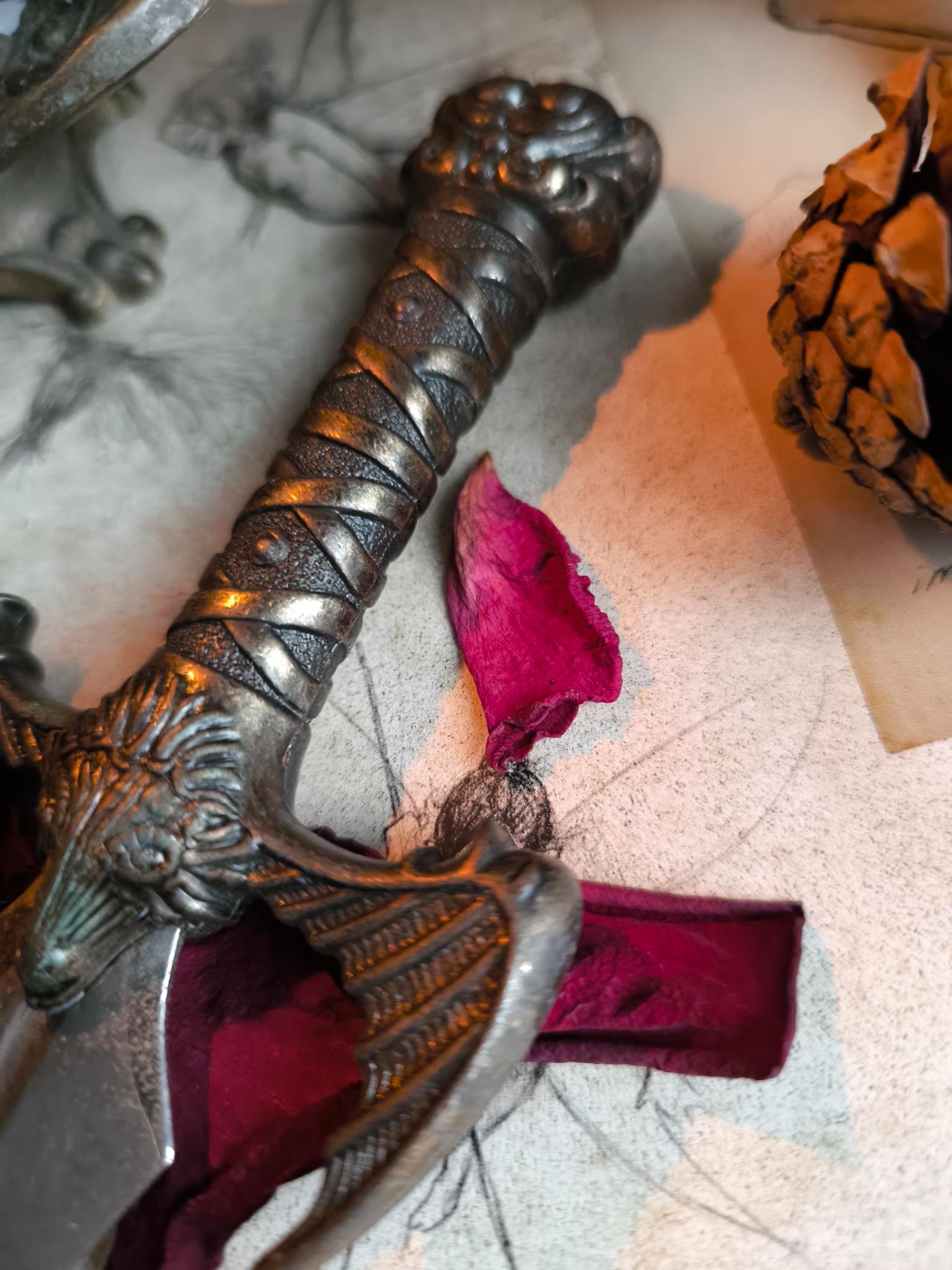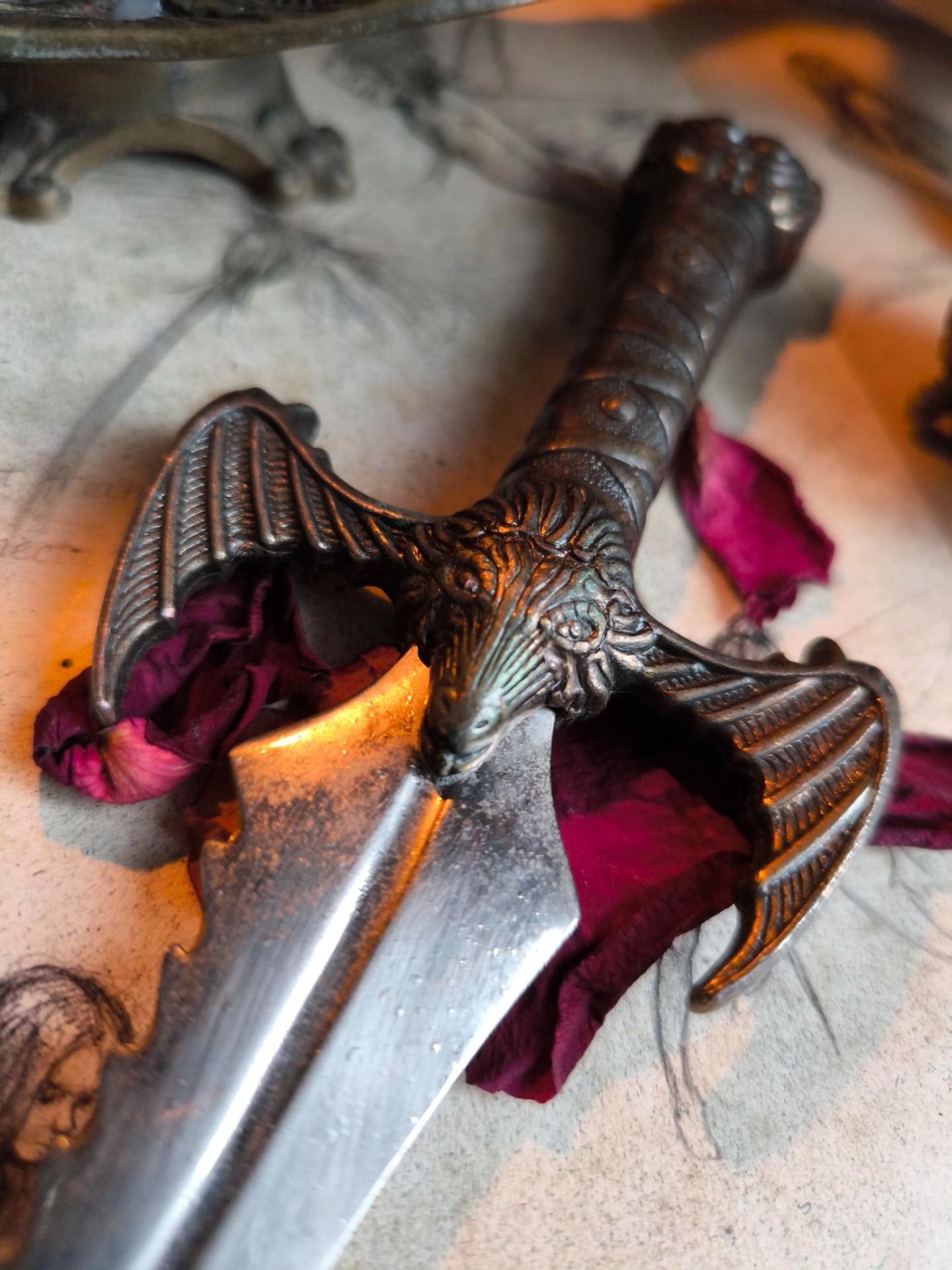 Son manche, orné d'ailes de dragon, évoque les gardiens du feu primordial,