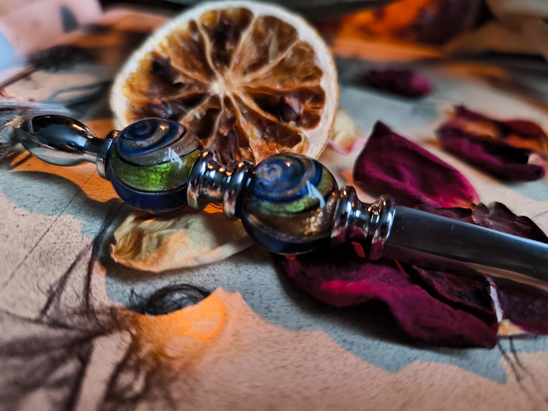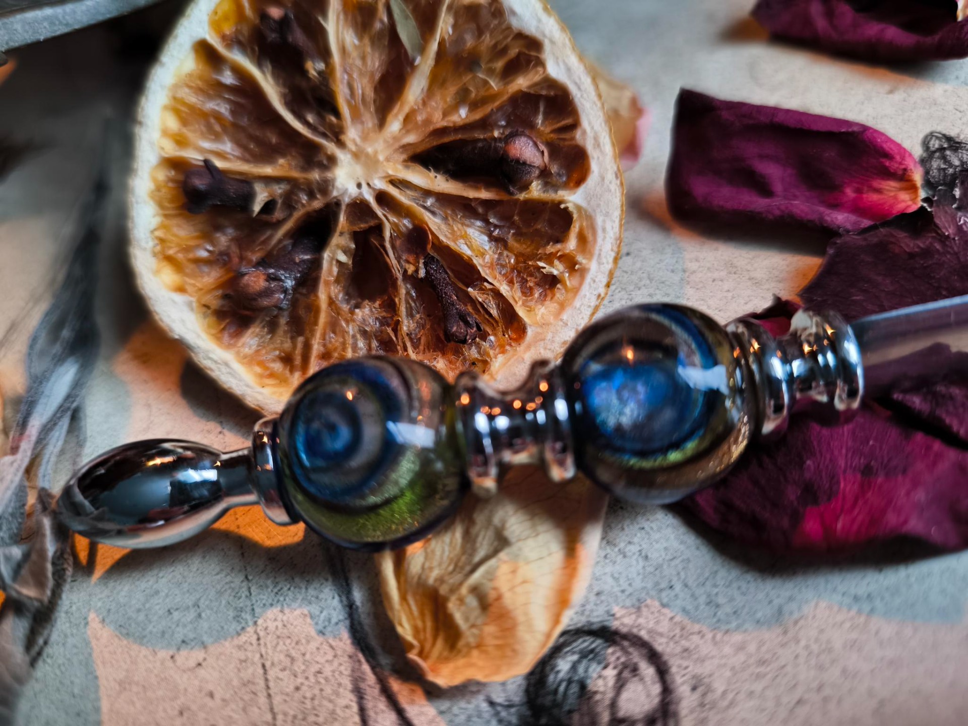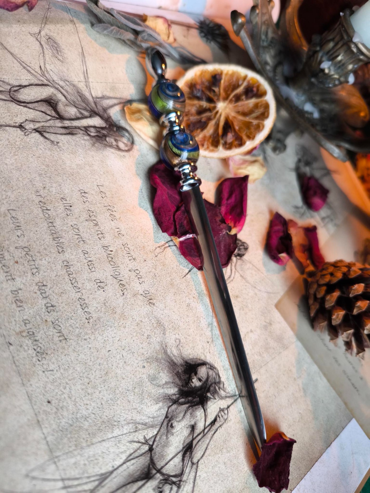 Son manche, orné de deux sphères de verre, évoque les fioles anciennes, les creusets, les expériences menées entre matière et mystère.