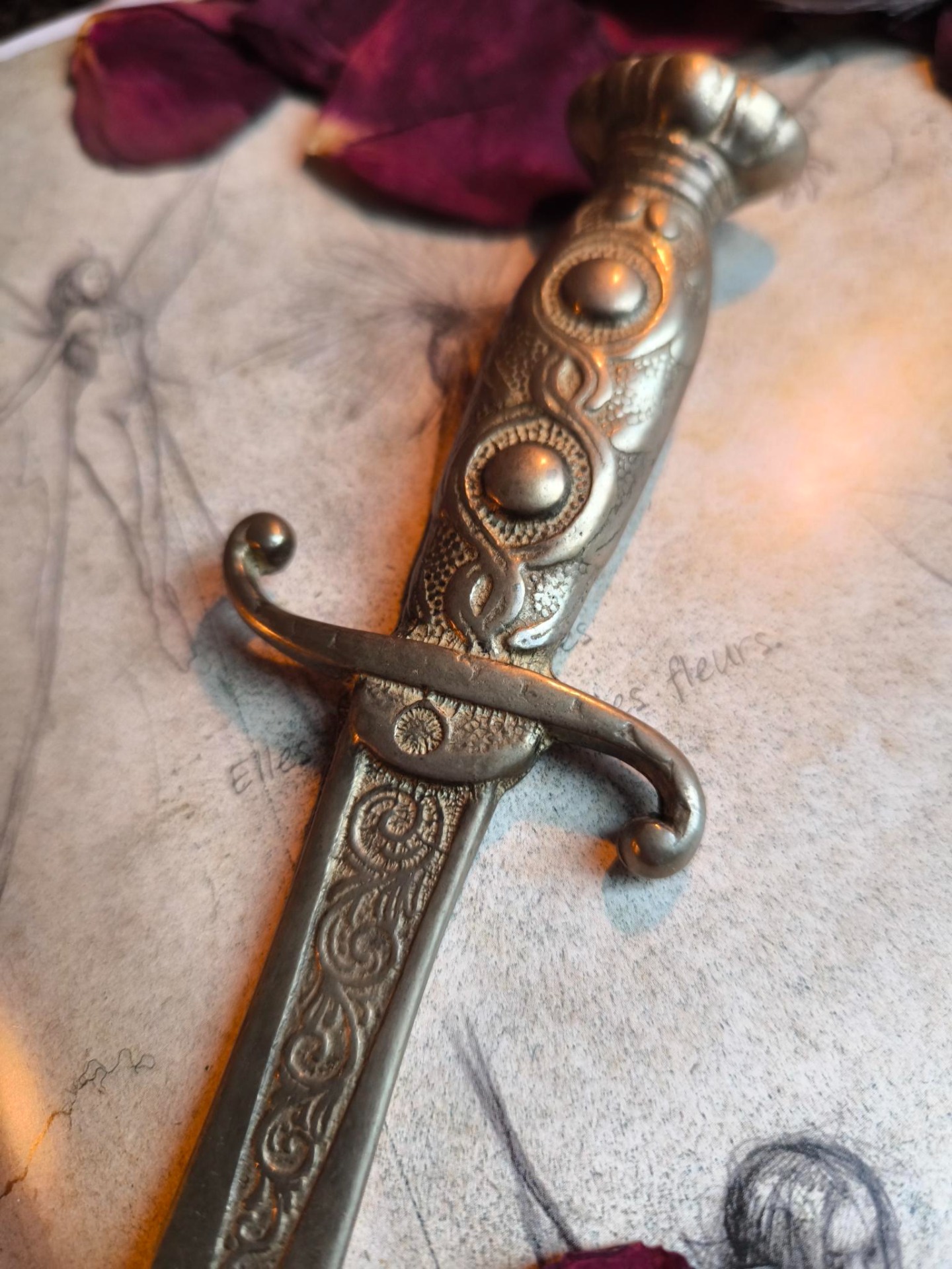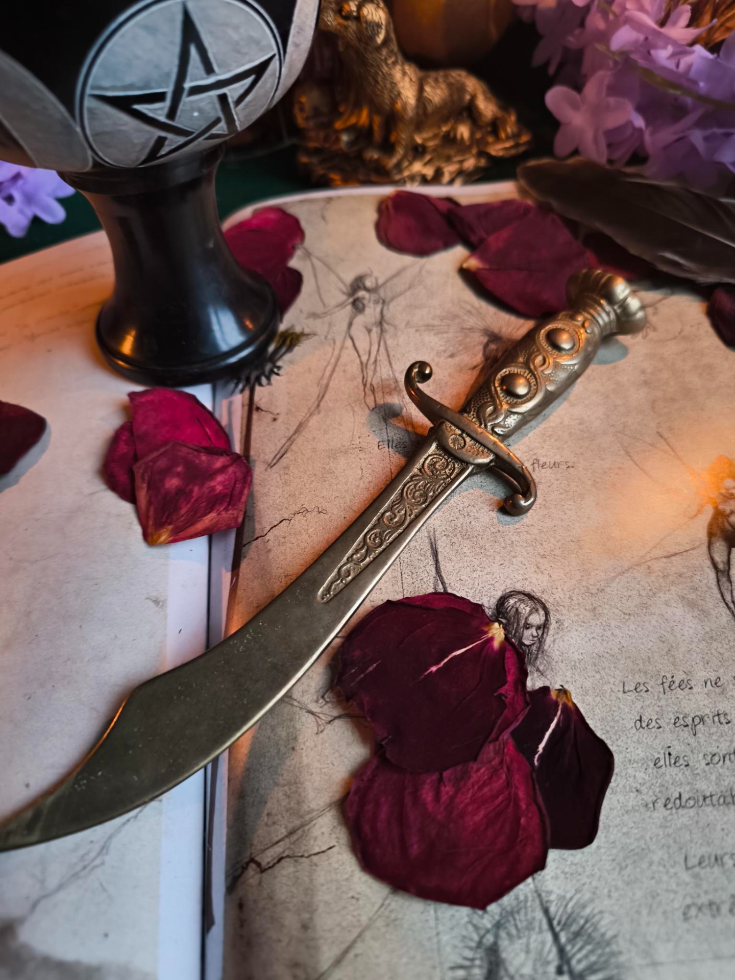 Cet athamé en laiton ancien, aux courbes délicatement orientales, semble avoir voyagé de longues routes avant d'arriver entre vos mains. Sa lame arquée évoque les armes cérémonielles des anciens royaumes du Levant, là où la magie se murmurait au rythme des lanternes et des encens chauds.