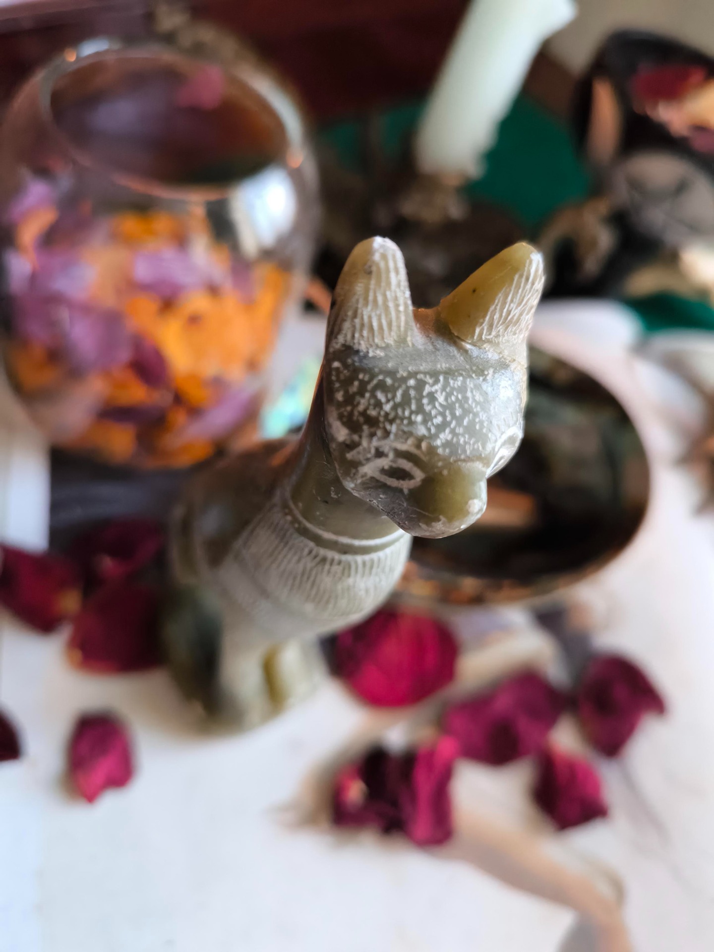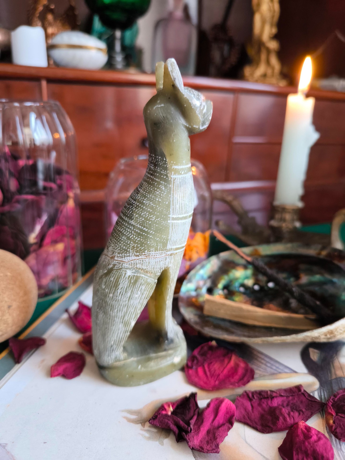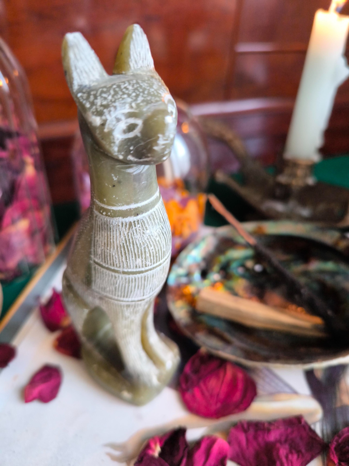 Dans la douceur du jade se dessine Bastet, la déesse-chat aux mille mystères.