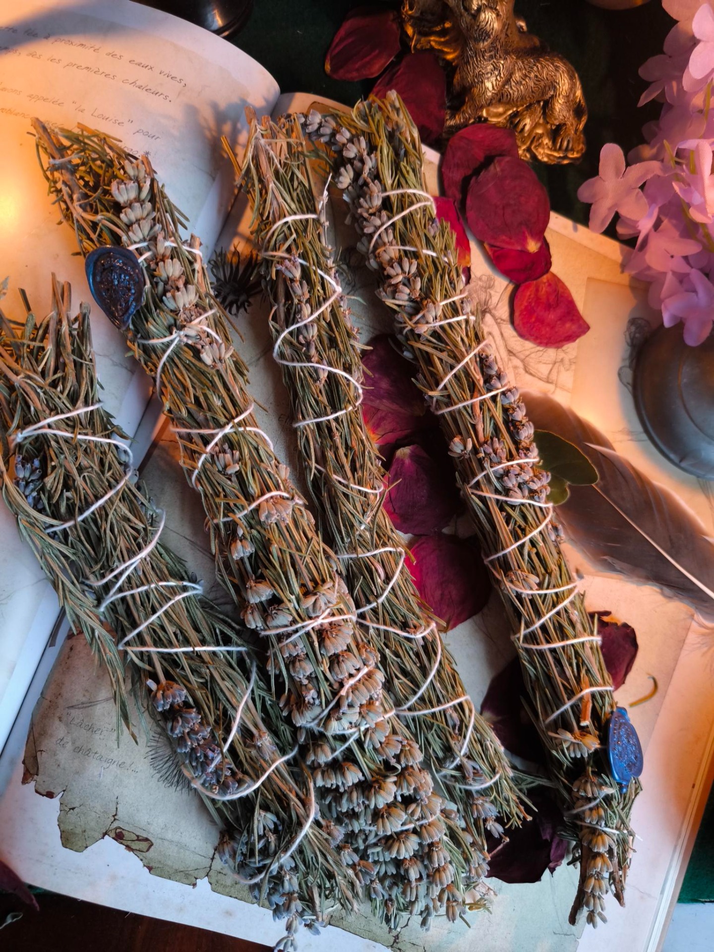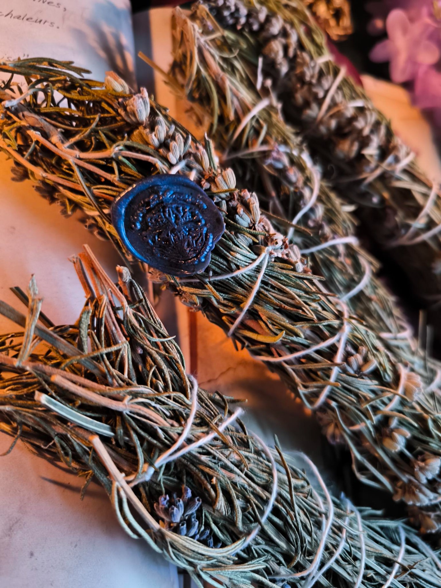 Tissé de mes propres récoltes, ce bâton de fumigation unit la force tranquille du romarin et la douceur apaisante de la lavande. Séchés sous le soleil et noués avec intention, ces brins portent en eux la lente respiration du jardin, la paix du vent du soir, et le chuchotement des abeilles qui butinaient tout près.