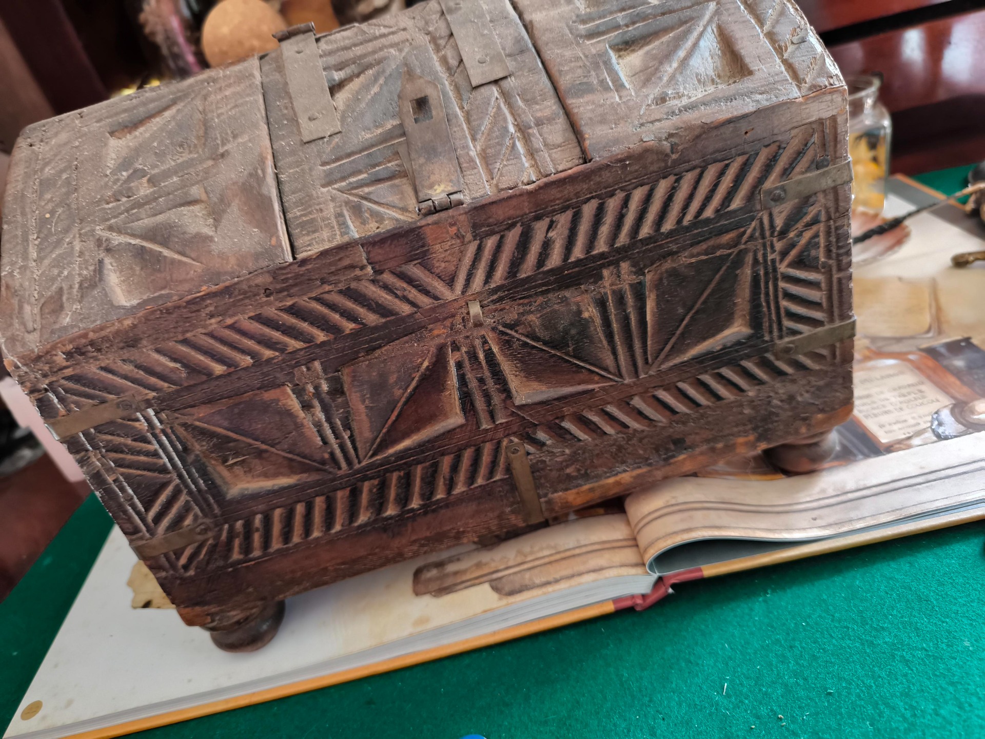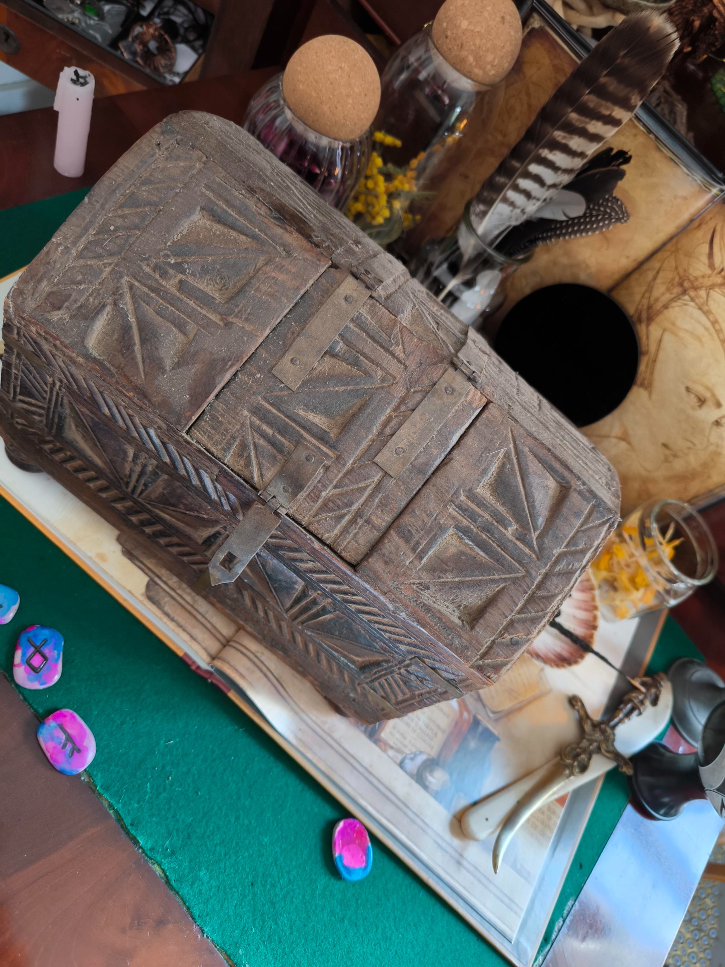 Ce coffre sculpté dans un bois sombre porte l’aura des reliquaires oubliés. Sa petite ouverture, presque secrète, laisse deviner qu’il fut créé pour abriter des mystères : talismans, écrits, offrandes ou confidences murmurées à la nuit. Plus qu’un simple objet, il devient une arche, gardienne des secrets et passage vers l’invisible. L’Arche Noire protège ce qui doit rester voilé, dans le silence des ombres.