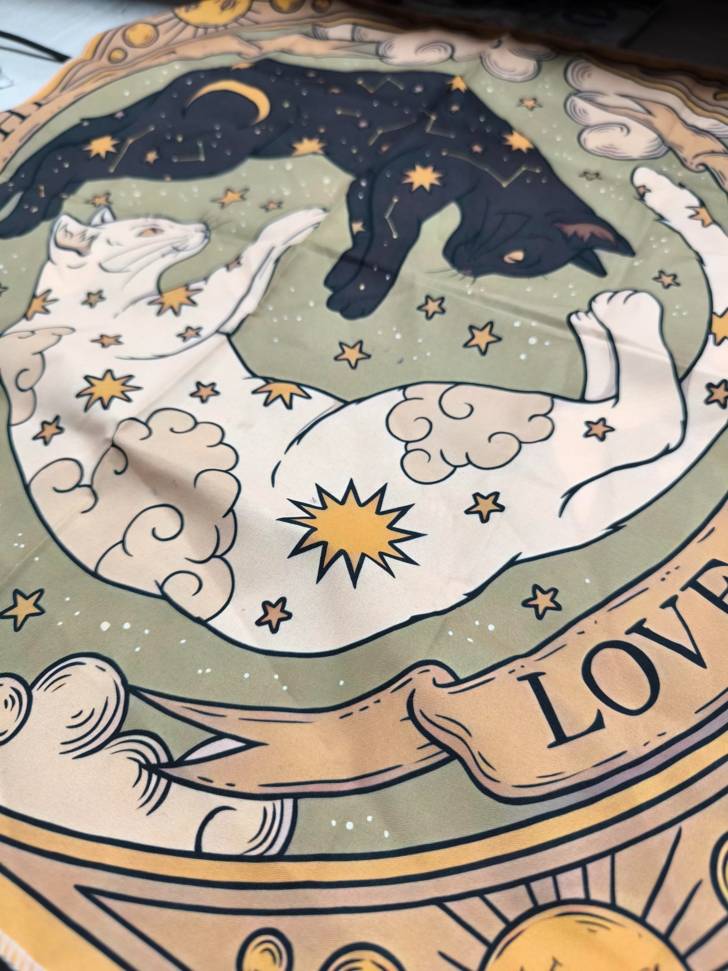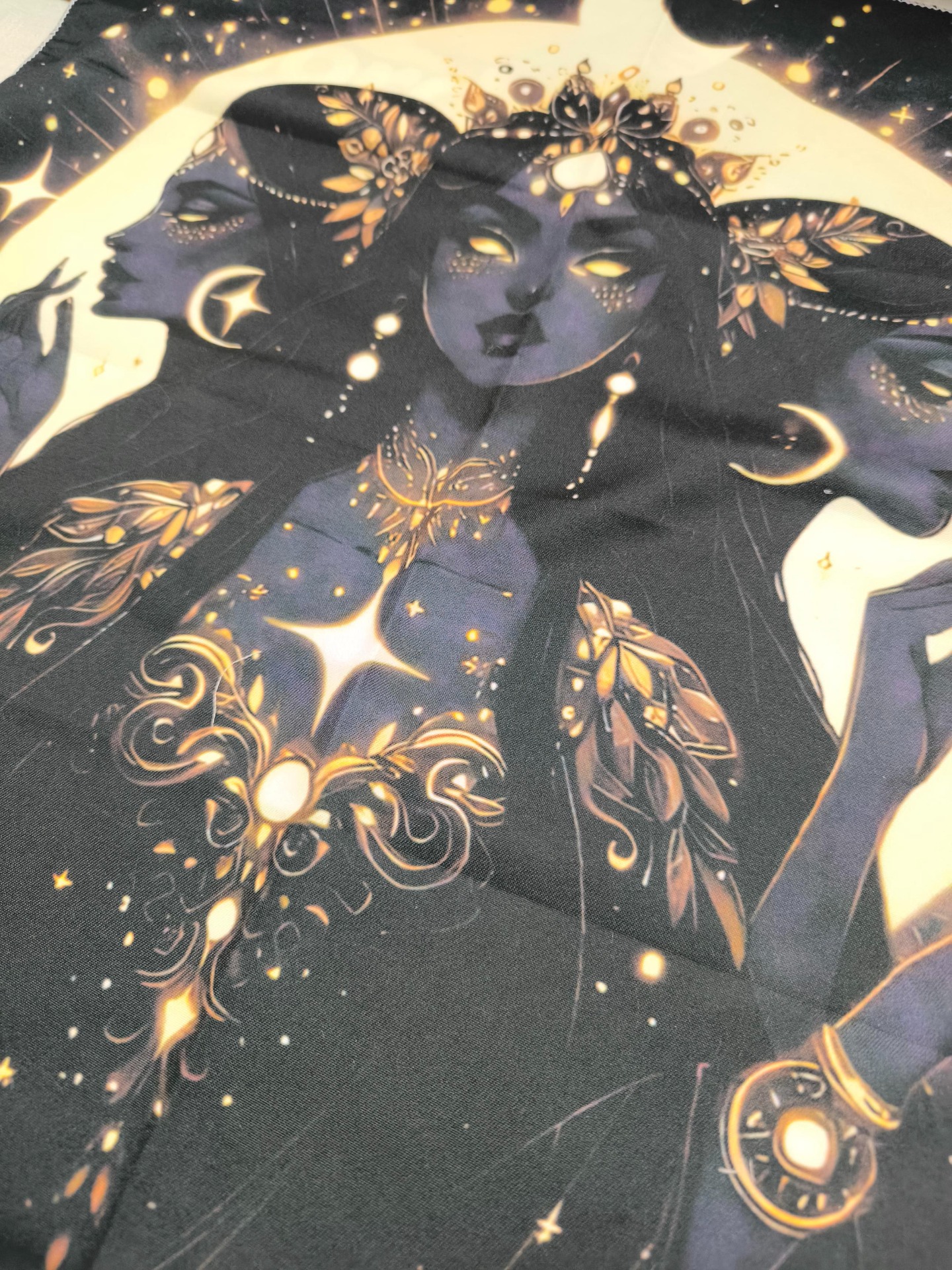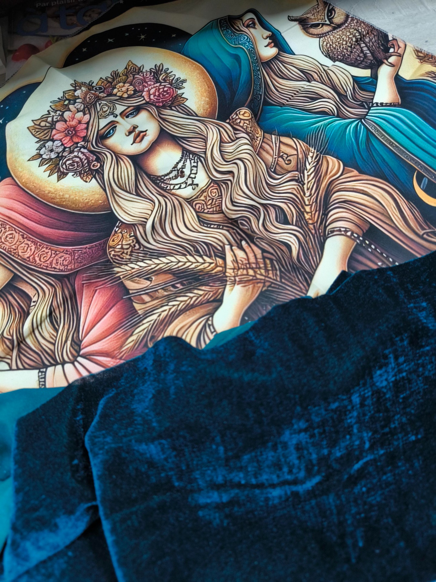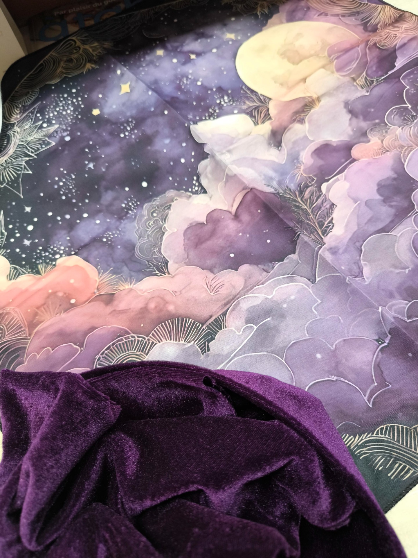 Tissée de velours et d’images sacrées, cette bourse se transforme en tapis de tirage. Elle protège vos cartes et déploie, en un geste, l’espace sacré de vos lectures.