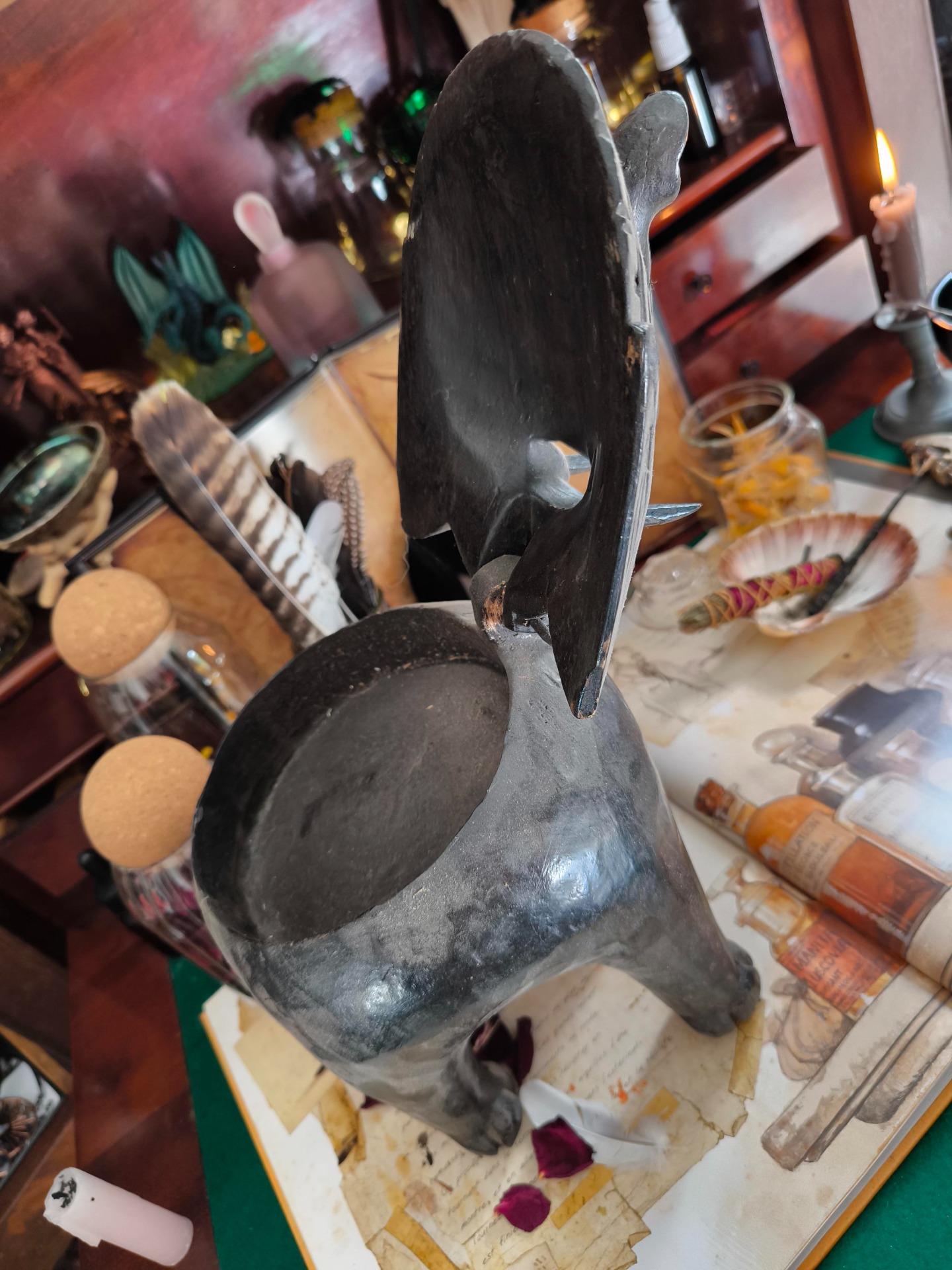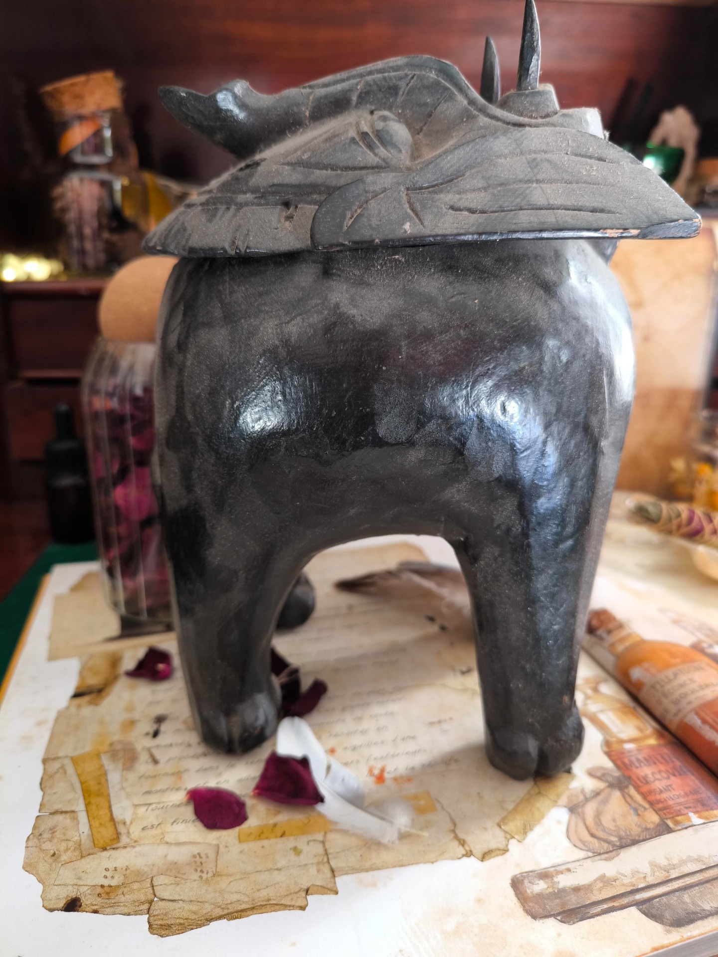 Ce coffret sculpté en forme d'éléphant porte la mémoire de Ganesh, le dieu qui écarte les obstacles et ouvre les chemins. Sa tête s'élève comme une porte sacrée, révélant un espace secret où déposer talismans, offrandes ou souhaits. L'Écrin de Ganesh n'est pas seulement un objet : il devient un gardien, un protecteur discret des trésors que vous lui confierez.