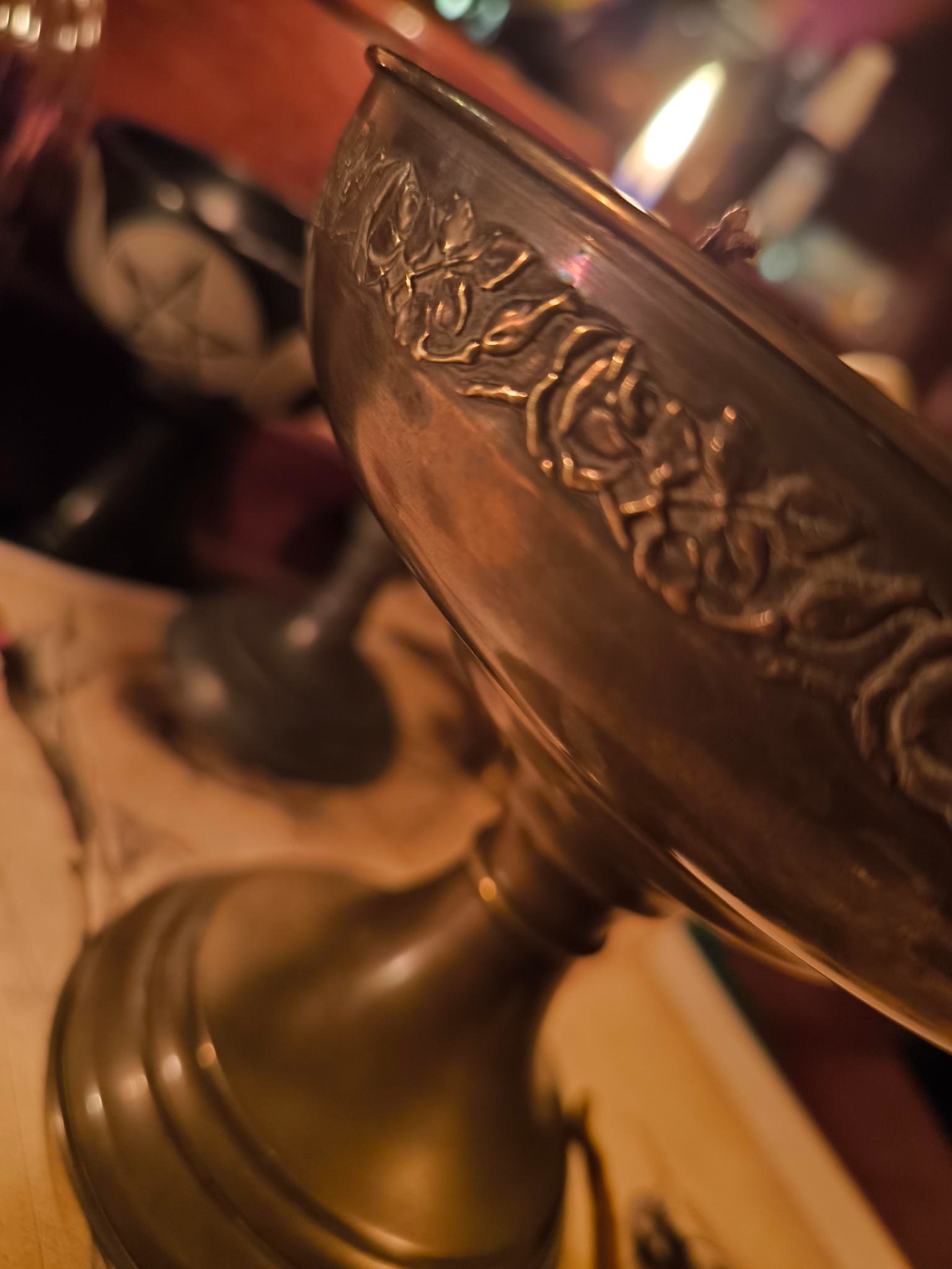 Façonnée dans un laiton patiné par le temps, cette coupe semble tout droit sortie d'un palais d'elfes. Son bord finement ciselé capture la lumière comme une prière murmurée, et son pied élancé lui confère une élégance presque mystique.