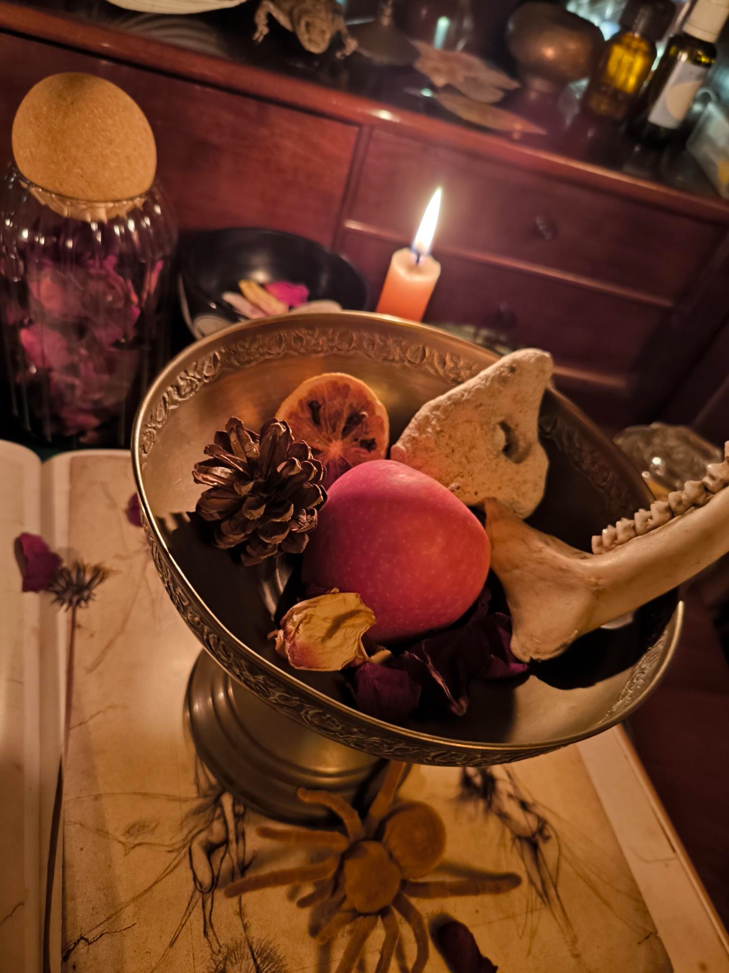 Elle accueillera fruits, fleurs séchées, pierres ou offrandes sacrées, devenant le centre d'un autel ou d'un rituel dédié à la gratitude et à l'abondance.