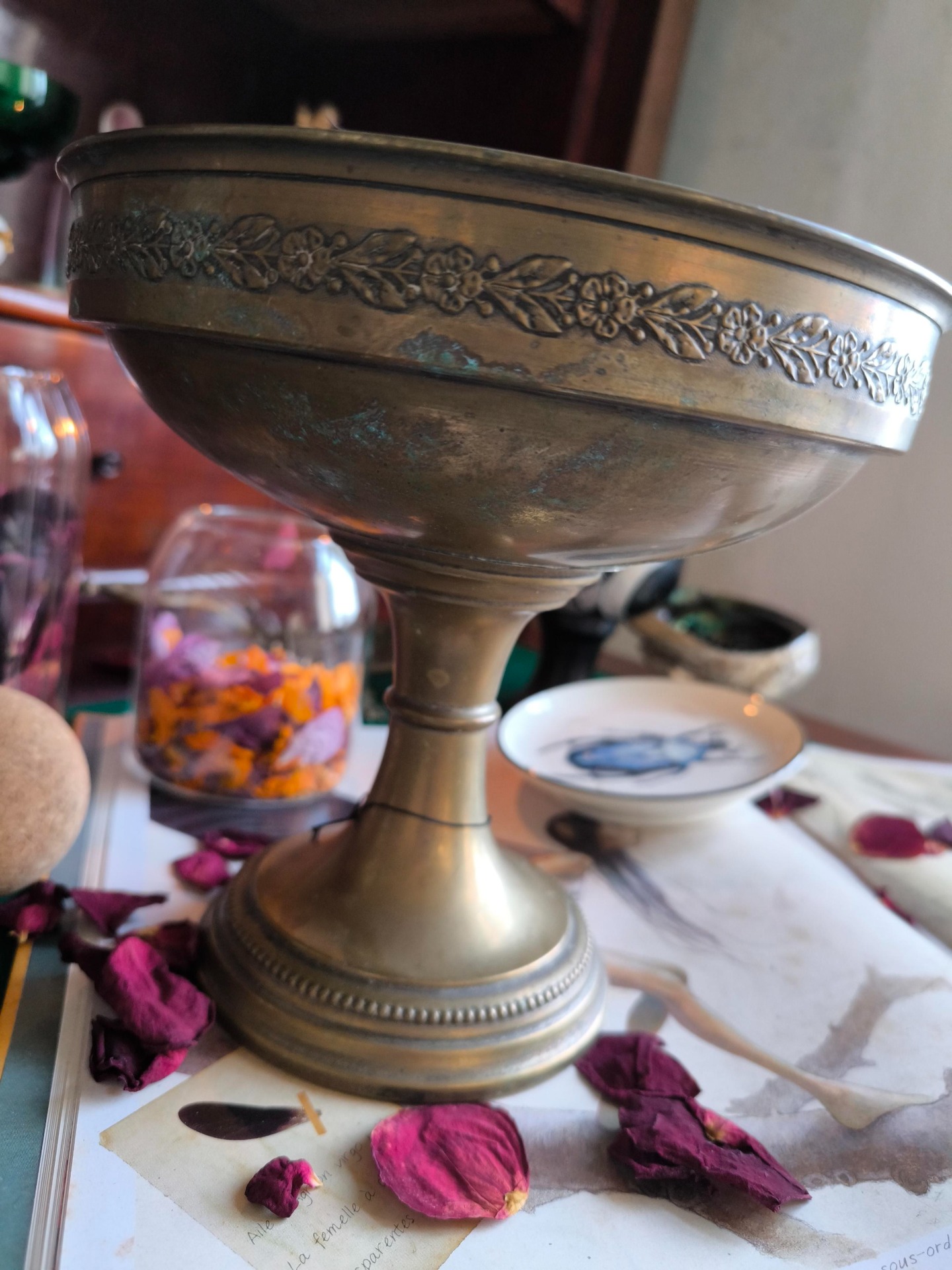 Une grande coupe en laiton, lourde, stable, marquée par les années comme par des lunes successives.