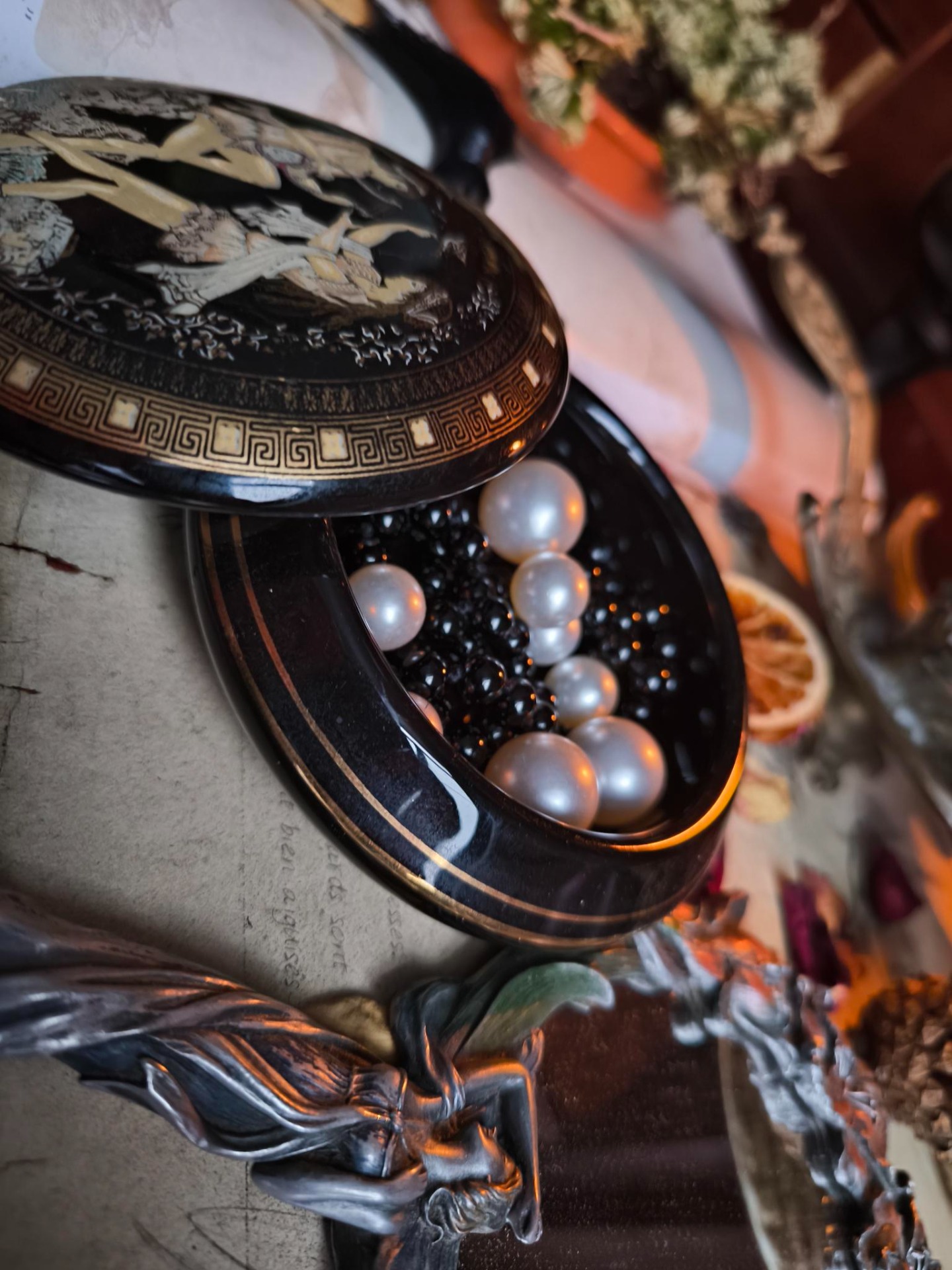 Façonné dans une porcelaine noire profonde, cet écrin semble venir d'un autre temps,