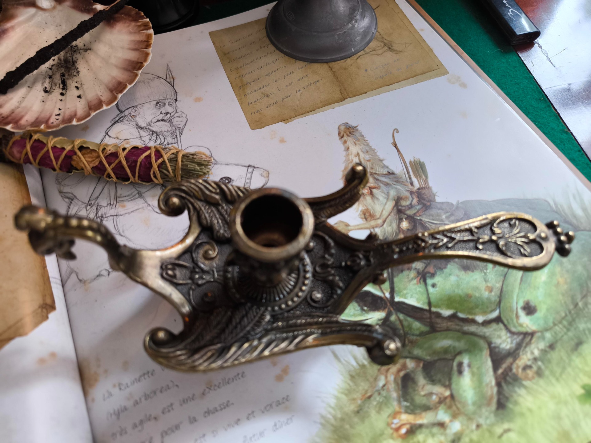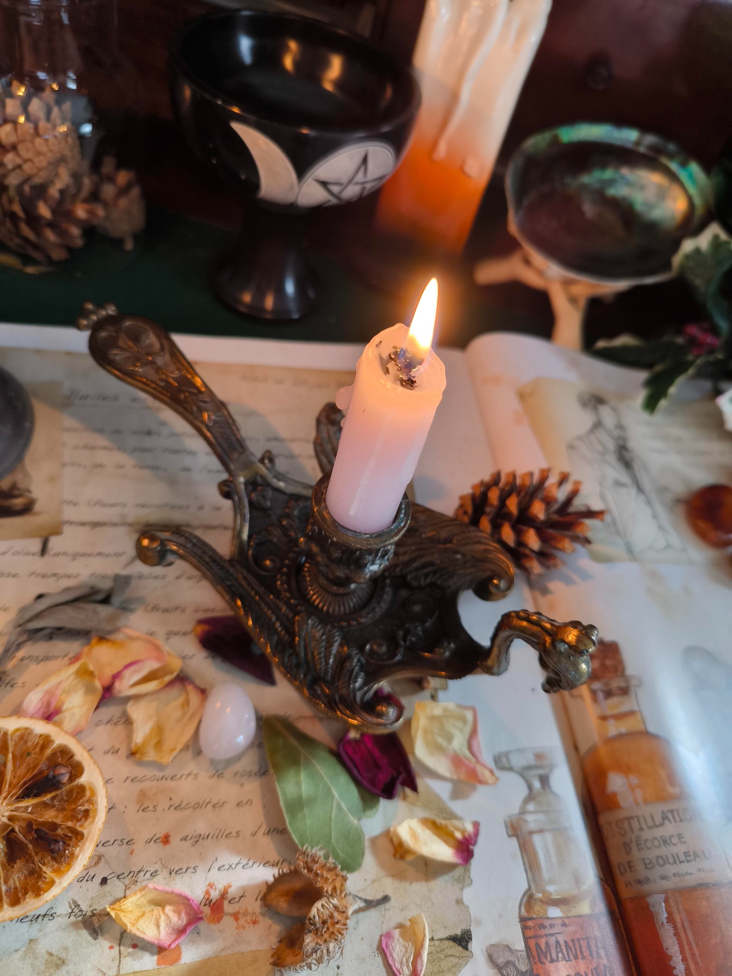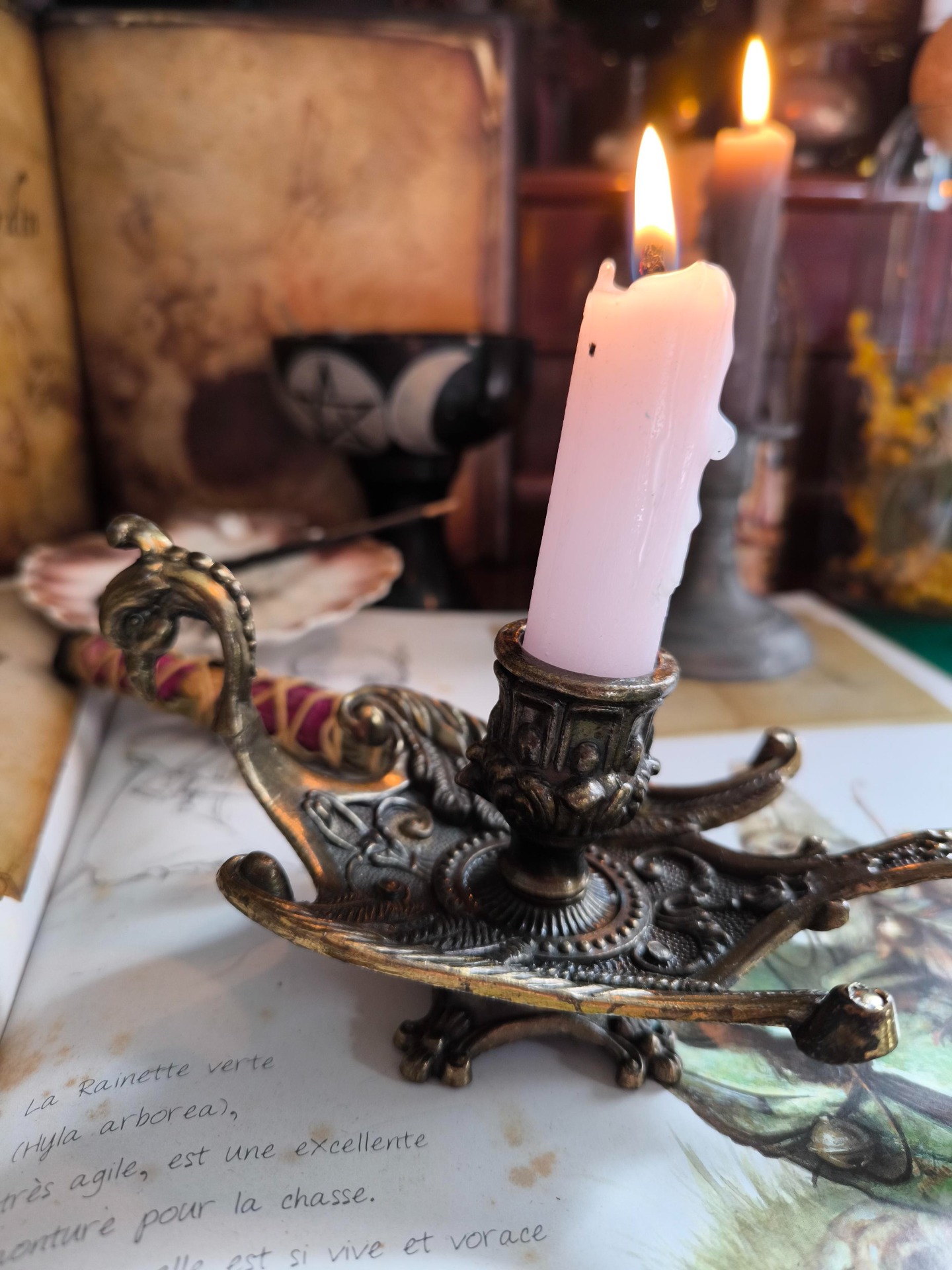 Ce chandelier ancien, façonné en forme de phénix, incarne la lumière éternelle et la renaissance. Sa flamme, posée entre les ailes de l'oiseau mythique, devient un symbole de transformation et de renouveau. Chaque bougie allumée rappelle la puissance du feu sacré : consumer l'ancien, purifier et faire surgir la clarté nouvelle. Un objet rituel et majestueux, gardien des flammes intérieures.