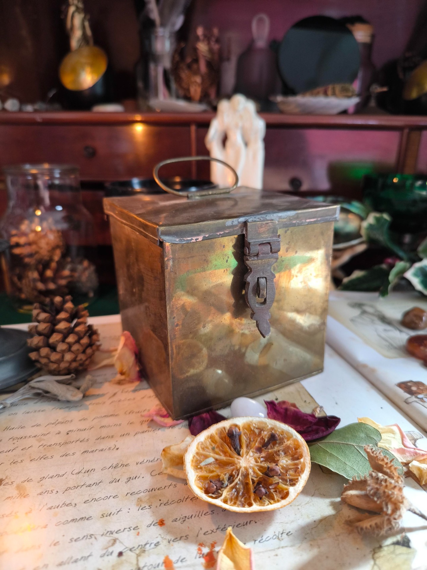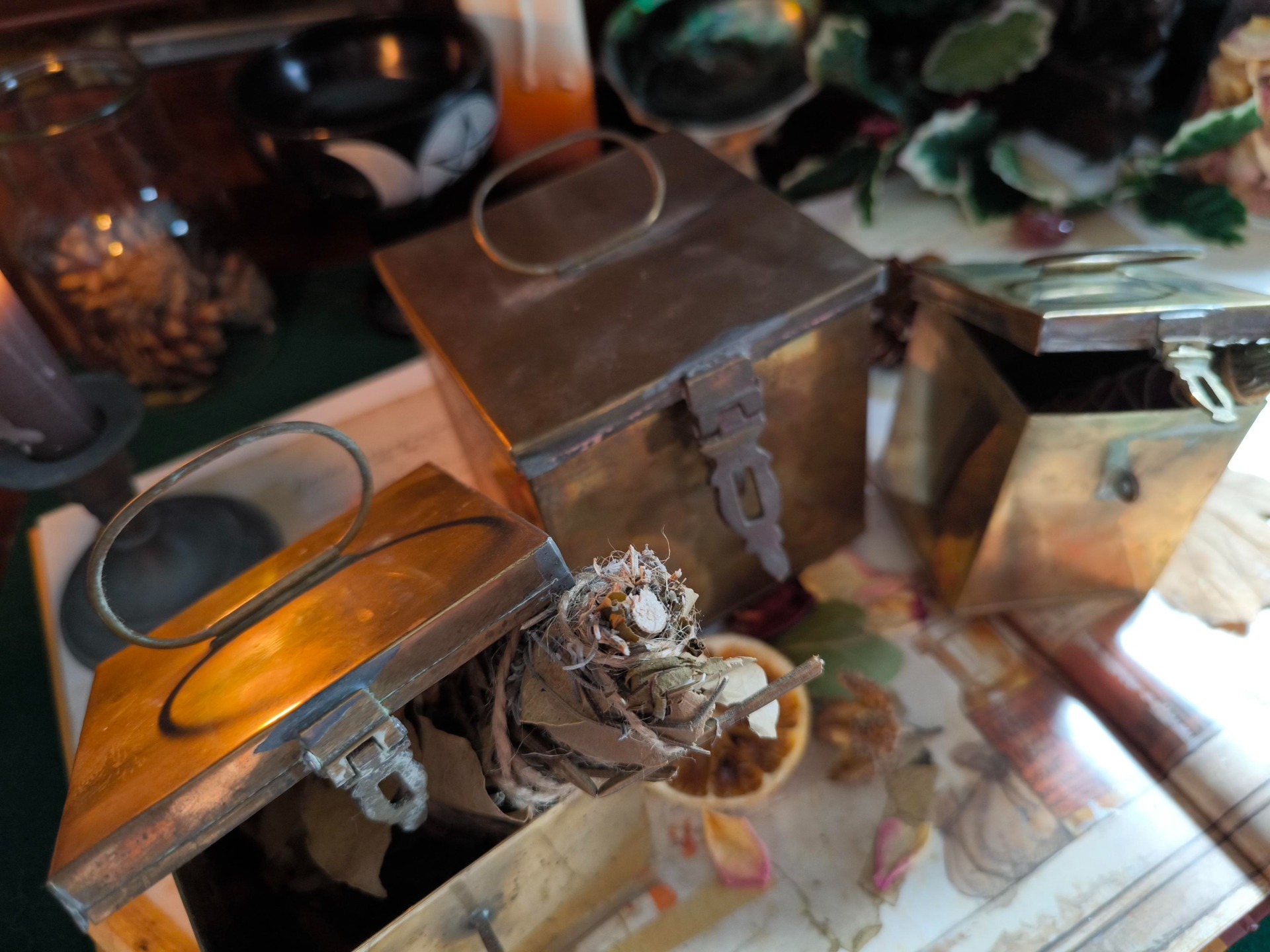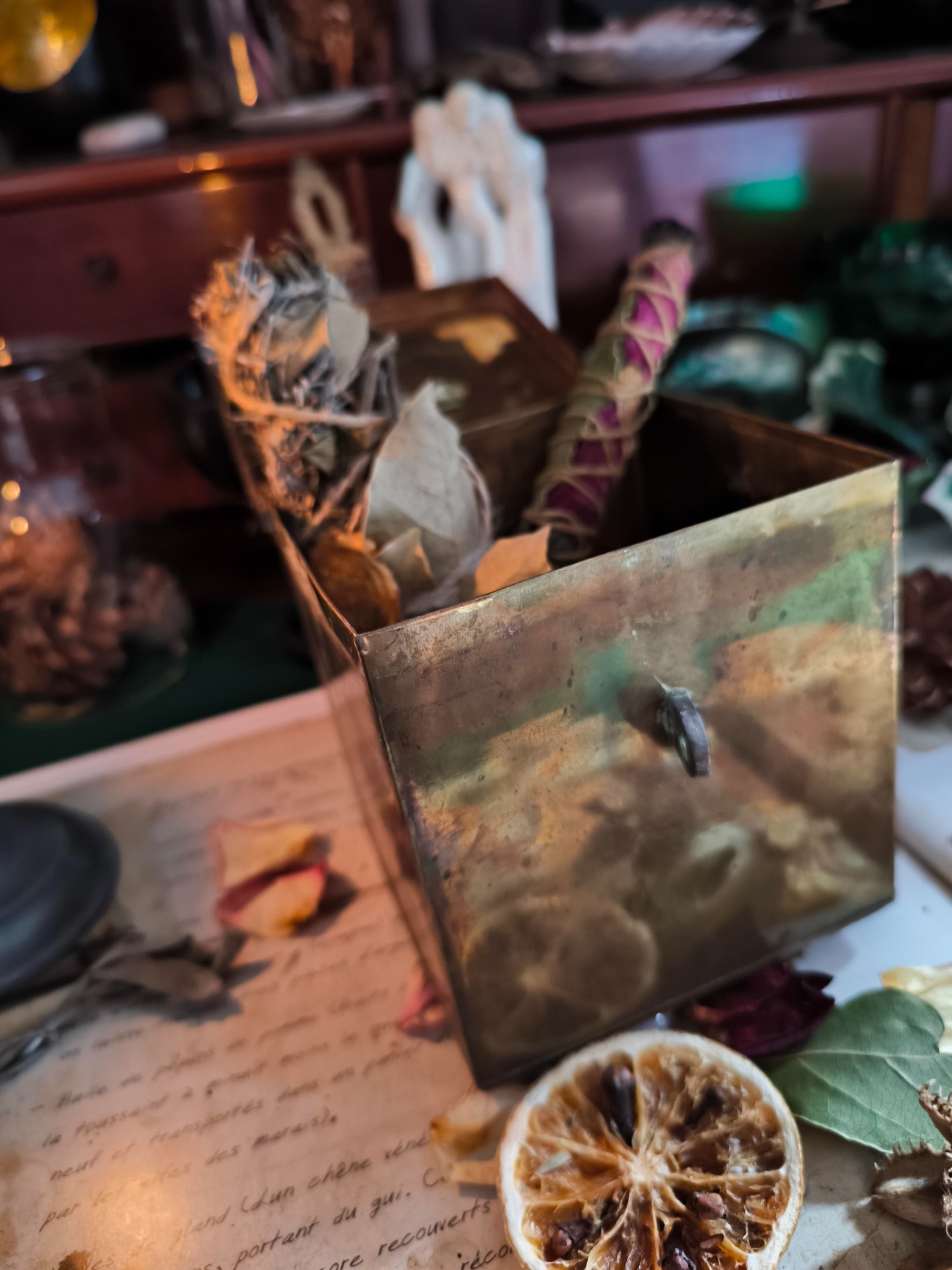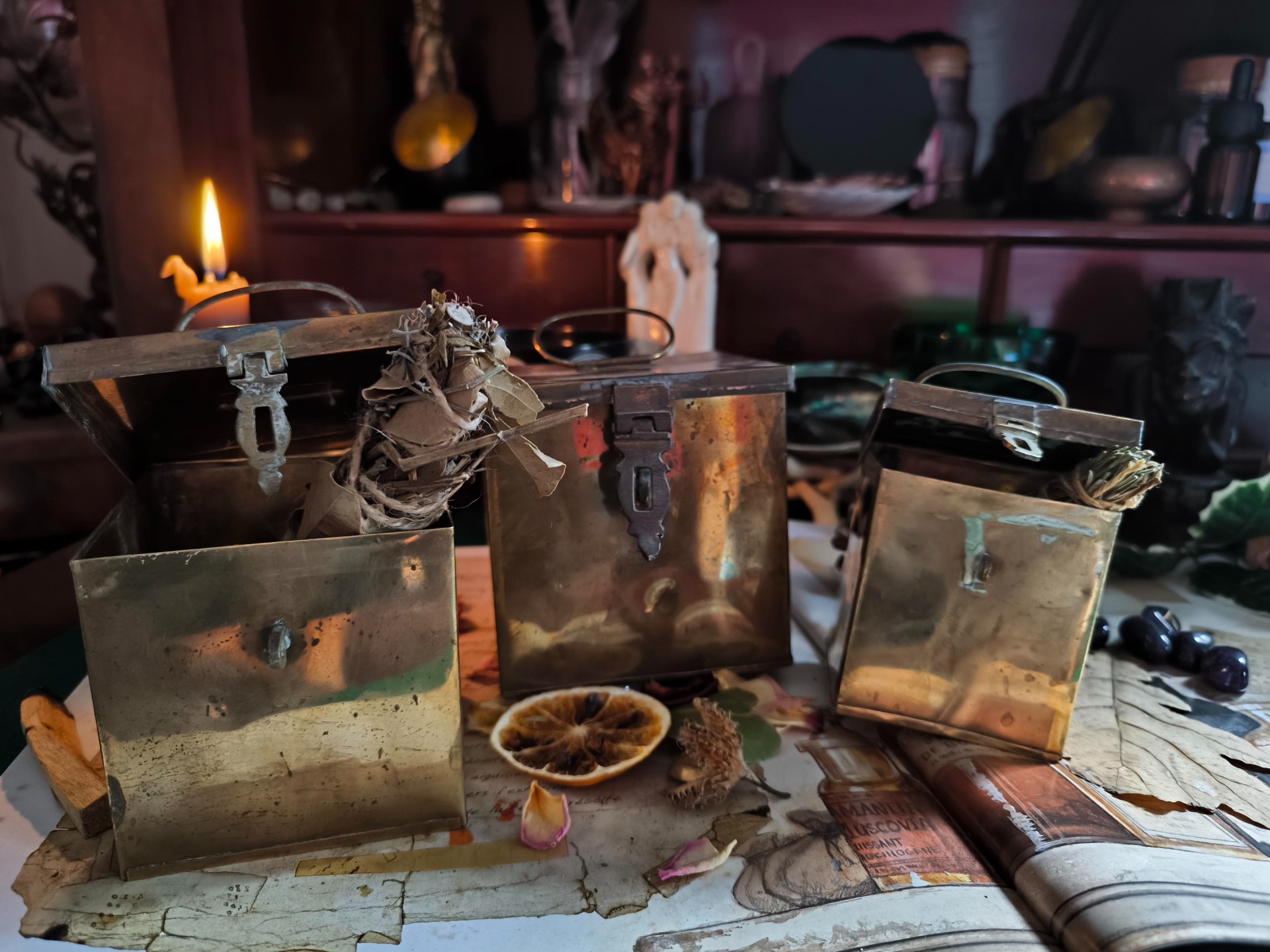 Ces trois boîtes de métal s’emboîtent l’une dans l’autre, comme des poupées de mystère. Elles évoquent les secrets cachés, les couches de l’âme, les trésors que l’on protège au fil du temps. Chacune peut contenir herbes, talismans ou petits objets précieux, mais ensemble, elles deviennent un jeu d’énigmes, une garde silencieuse des confidences et des rituels. Trois coffres, trois portes, trois secrets à révéler.