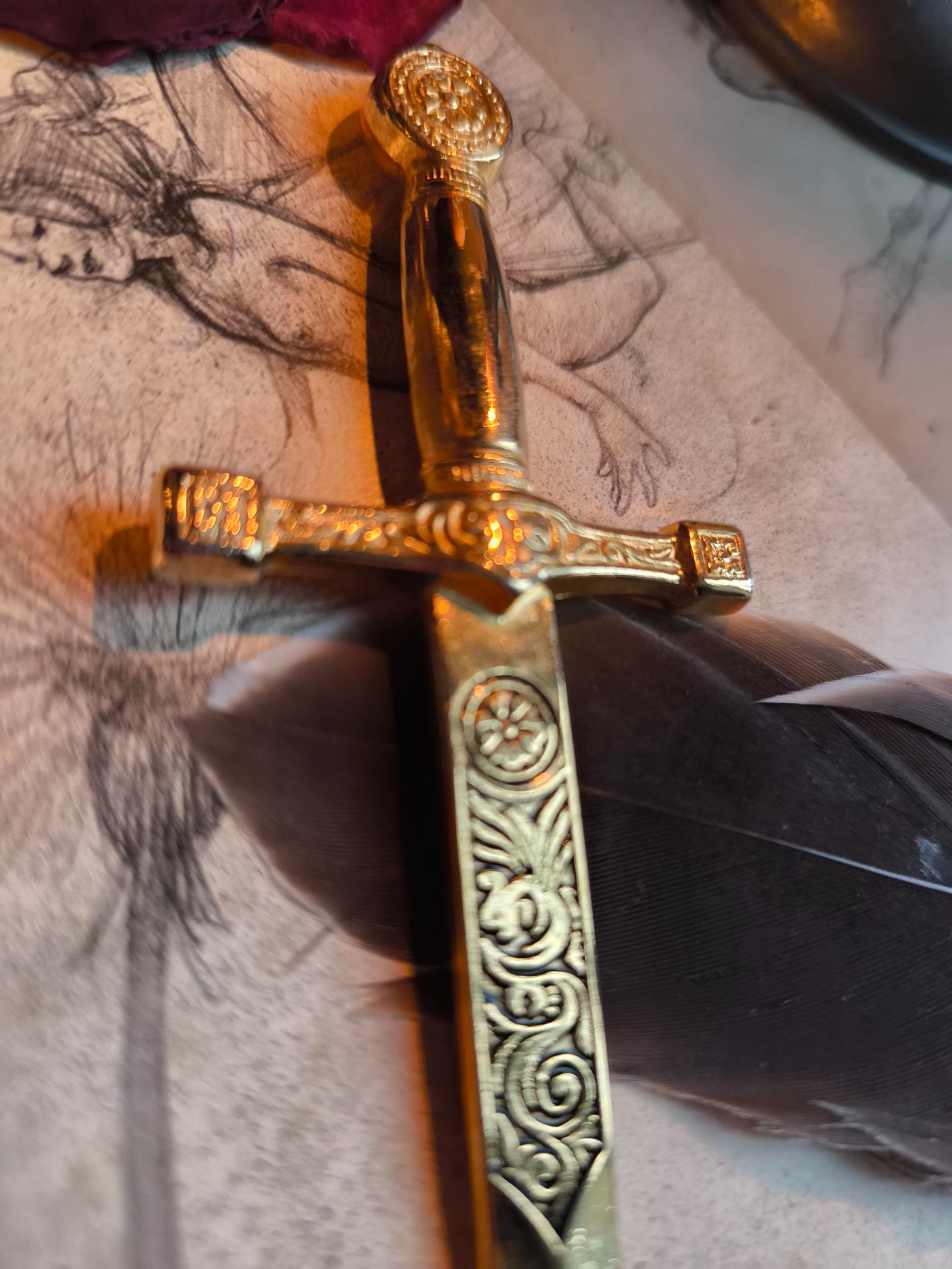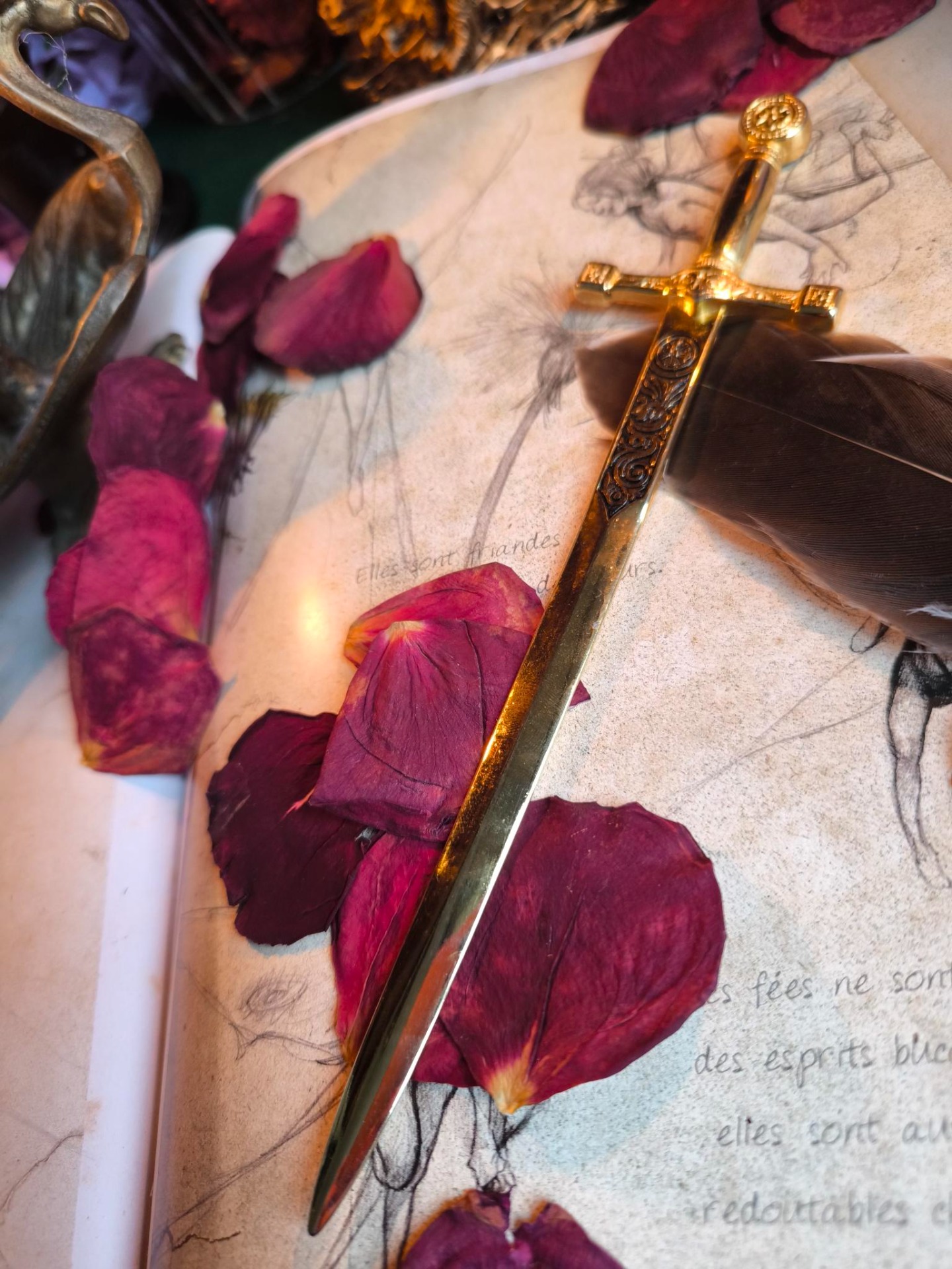 Fin comme un rayon d’aube, brillant comme une promesse, cet athamé en laiton ancien porte en lui l’élégance discrète des objets qui ont traversé les mondes. Sa lame dorée, longiligne et impeccable, semble avoir été coulée dans un éclat de soleil — un éclat apprivoisé, poli, chargé de symboles.