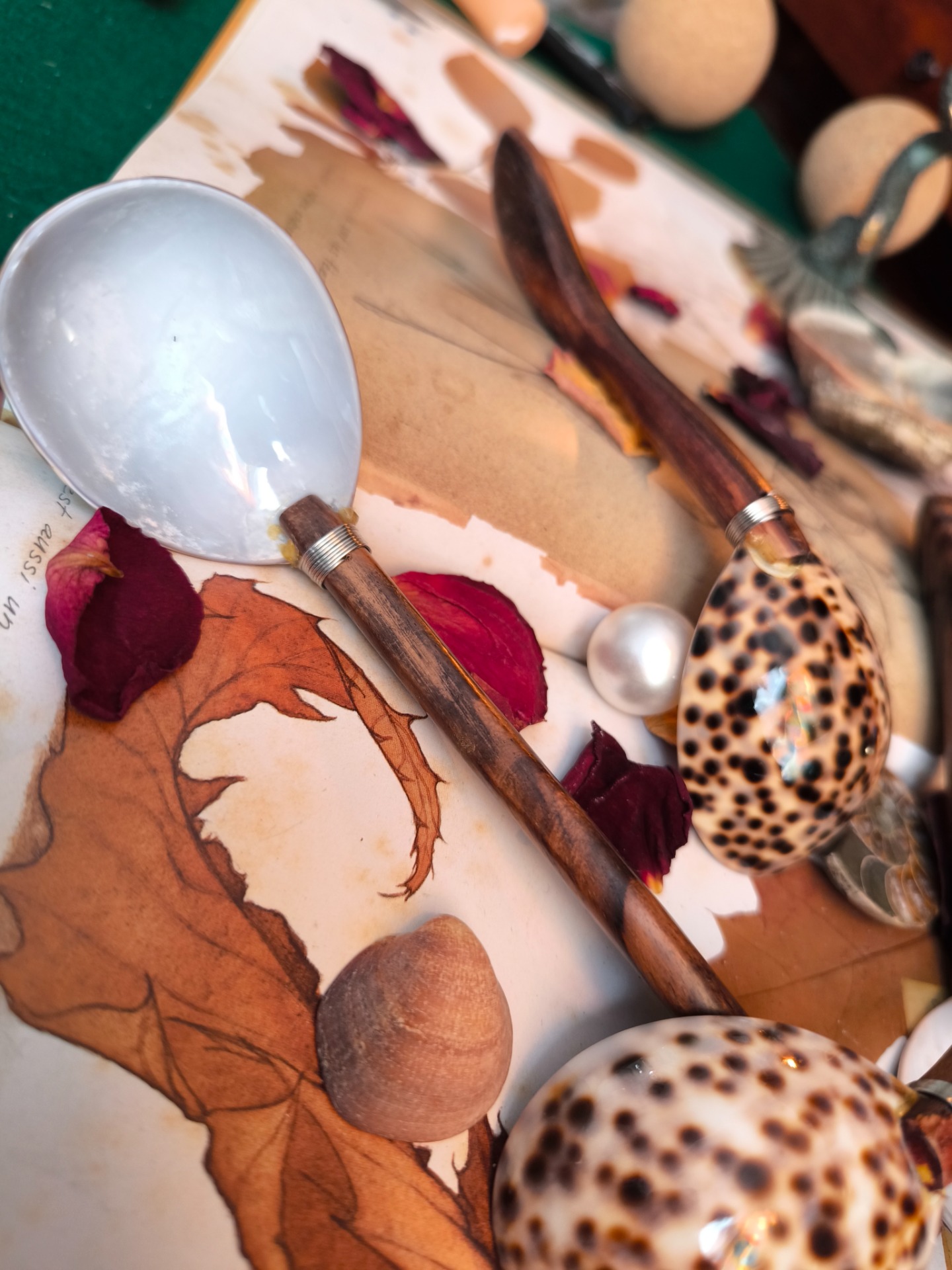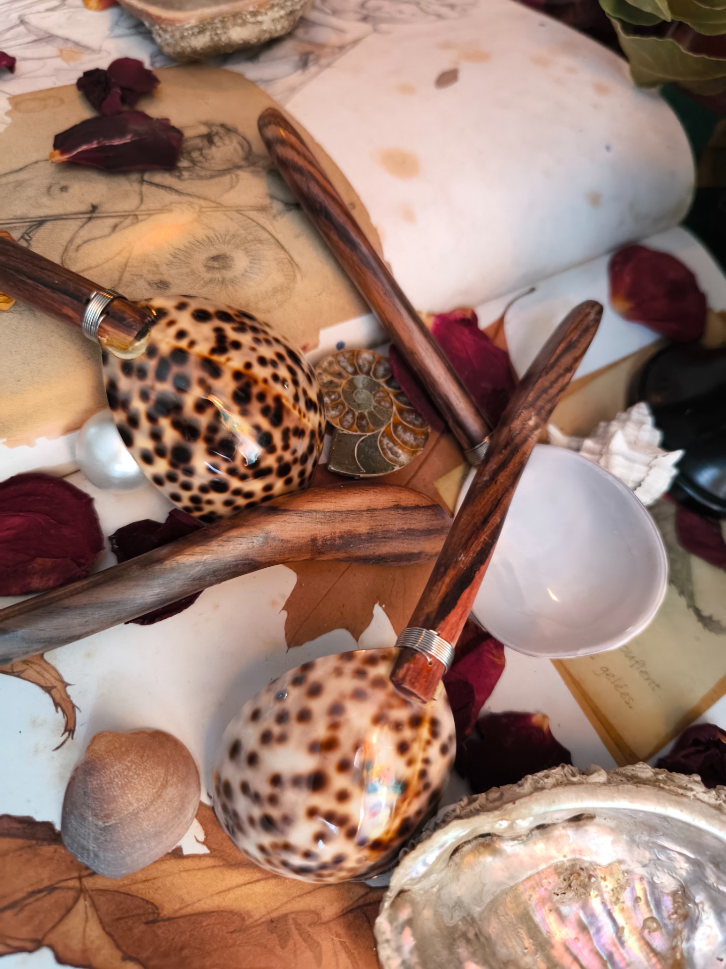 Façonnée à partir d'un coquillage poli par l'océan et d'un manche de bois naturel, cette cuillère semble être née là où la forêt rencontre la mer.