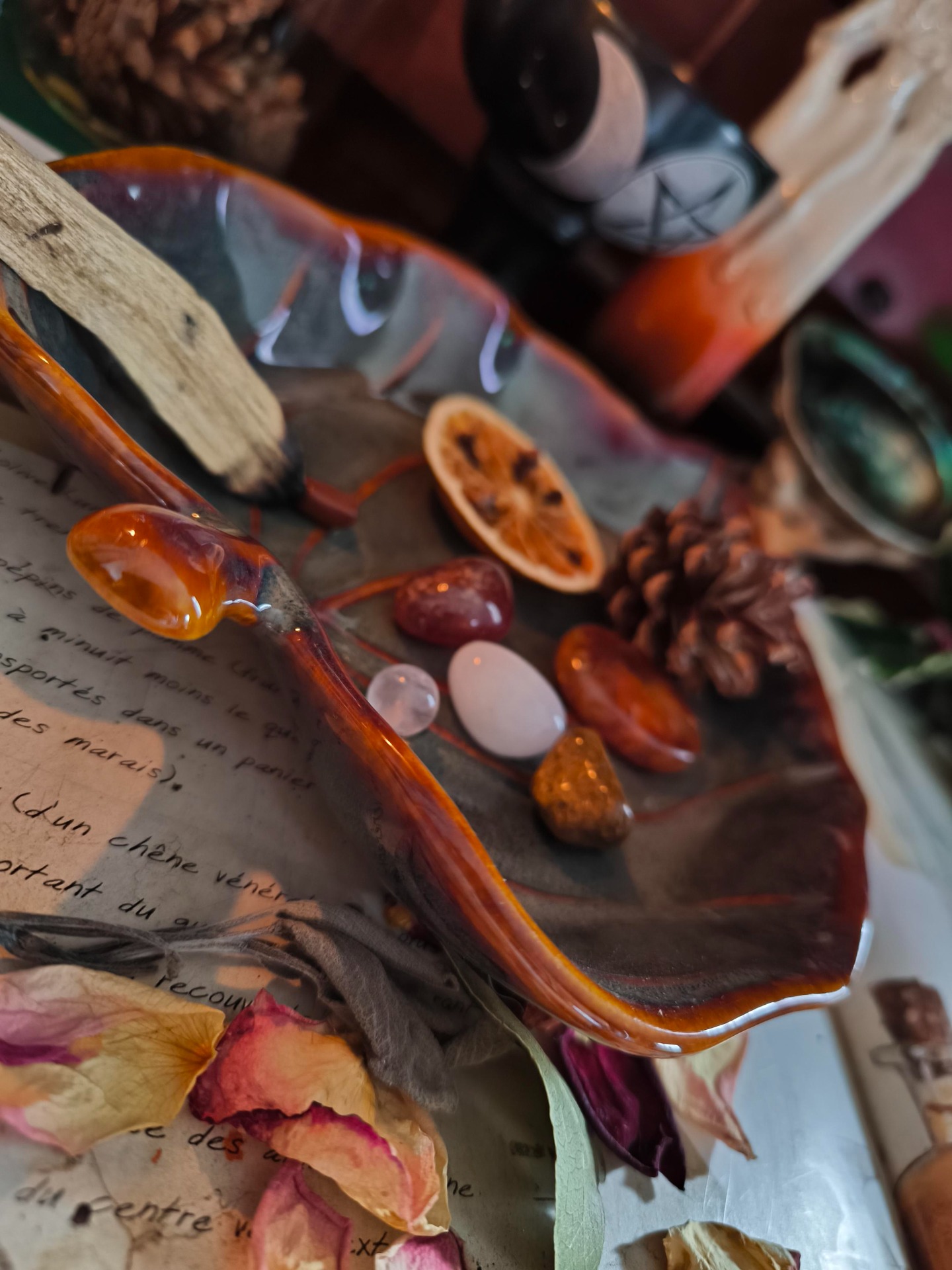 Ce plat en forme de feuille de lierre recueille avec grâce vos offrandes, pierres, herbes ou fleurs sacrées. Symbole d'éternité et de lien entre les mondes, le lierre accompagne la prière et la gratitude. Sa forme élégante et ses teintes chaudes en font un écrin naturel où chaque dépôt devient un geste sacré, une passerelle entre la terre et le spirituel.