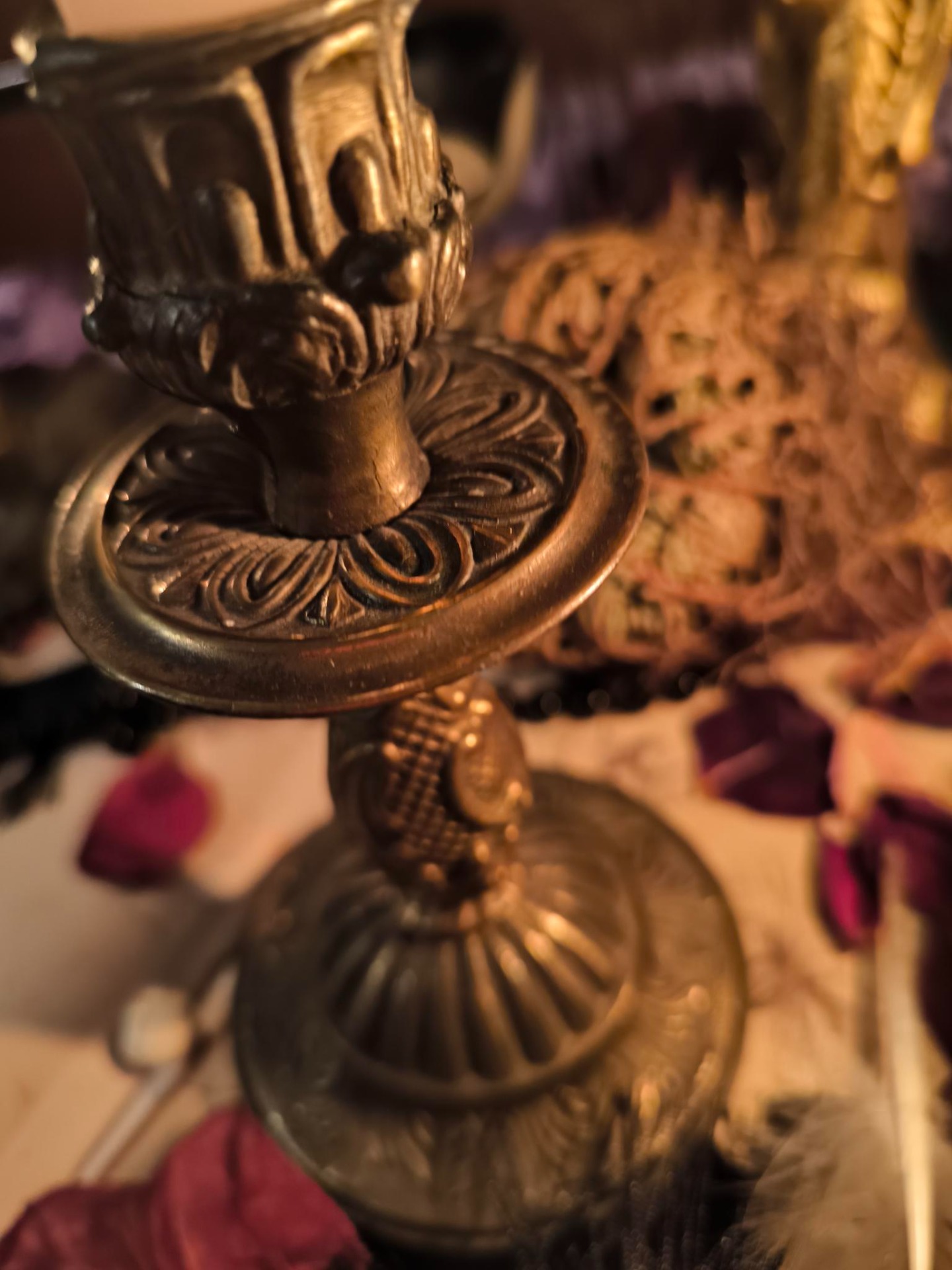 Chandelier ancien finement ouvragé, semblant tout droit sortis d'un château elfique ou d'une salle de bal d'un autre monde. Sa forme délicate et ses arabesques dorées captent la lumière comme un sortilège, révélant des reflets d'or et d'ombre, comme si chaque flamme allumée ouvrait un passage vers le merveilleux.