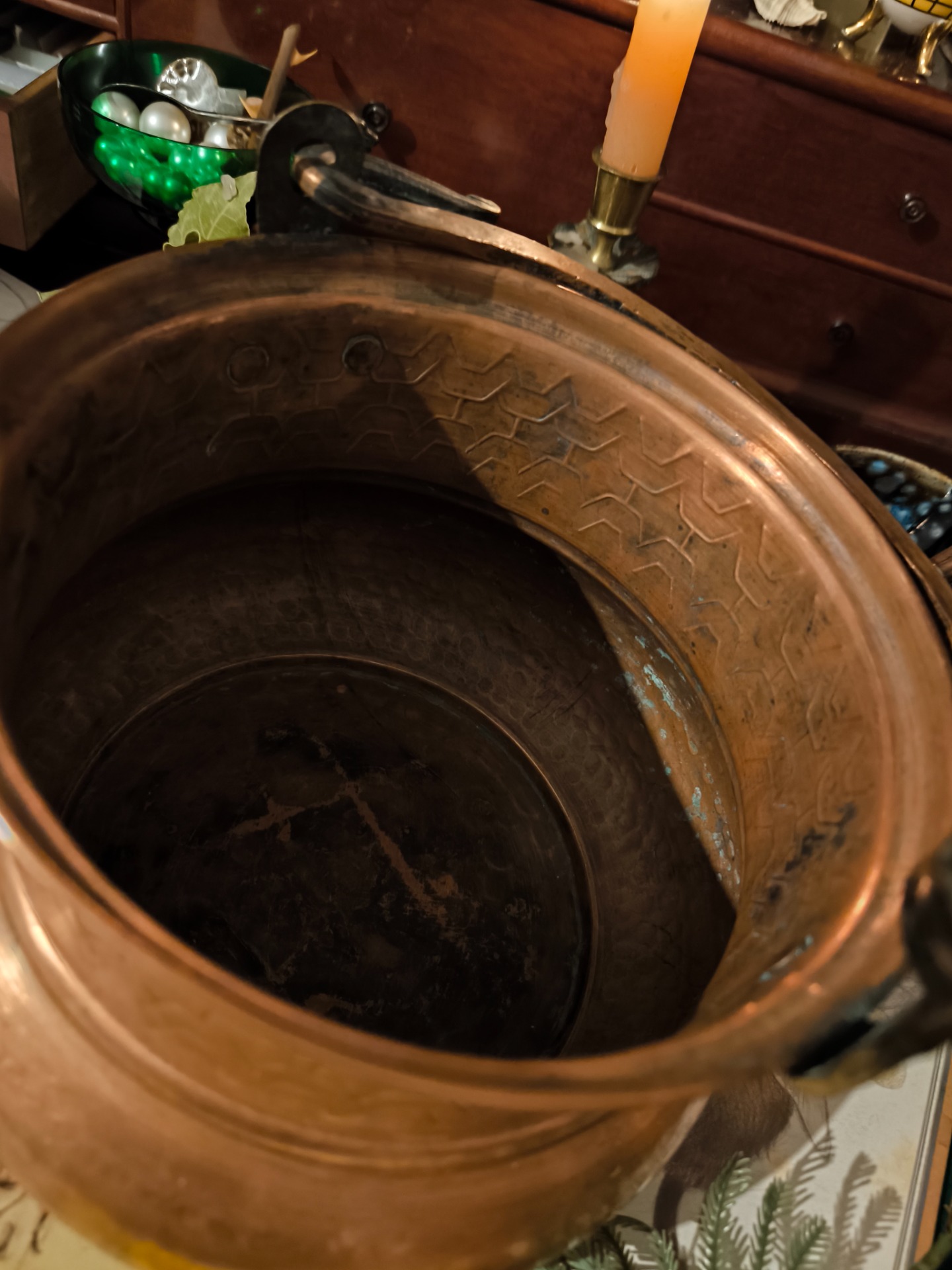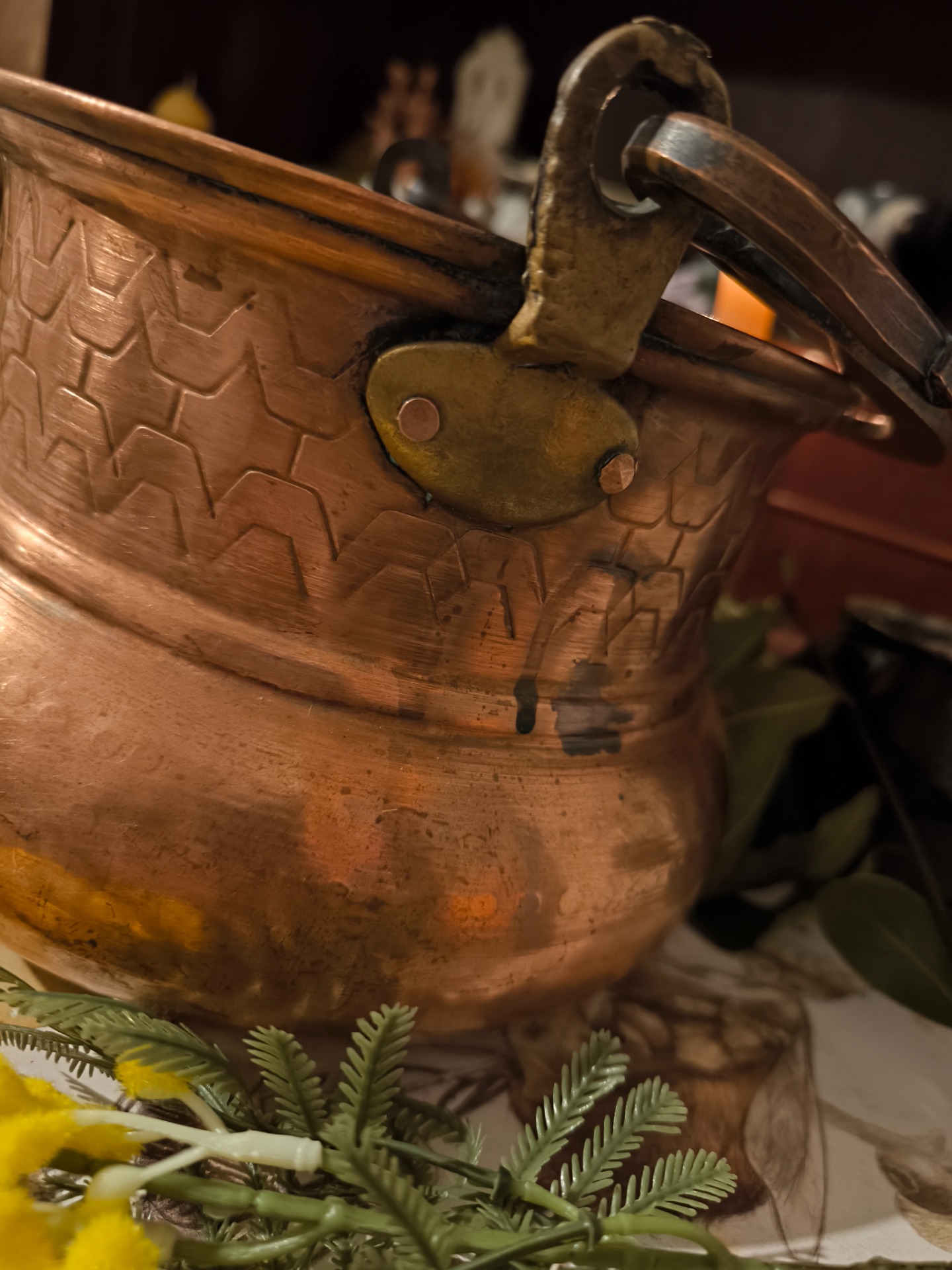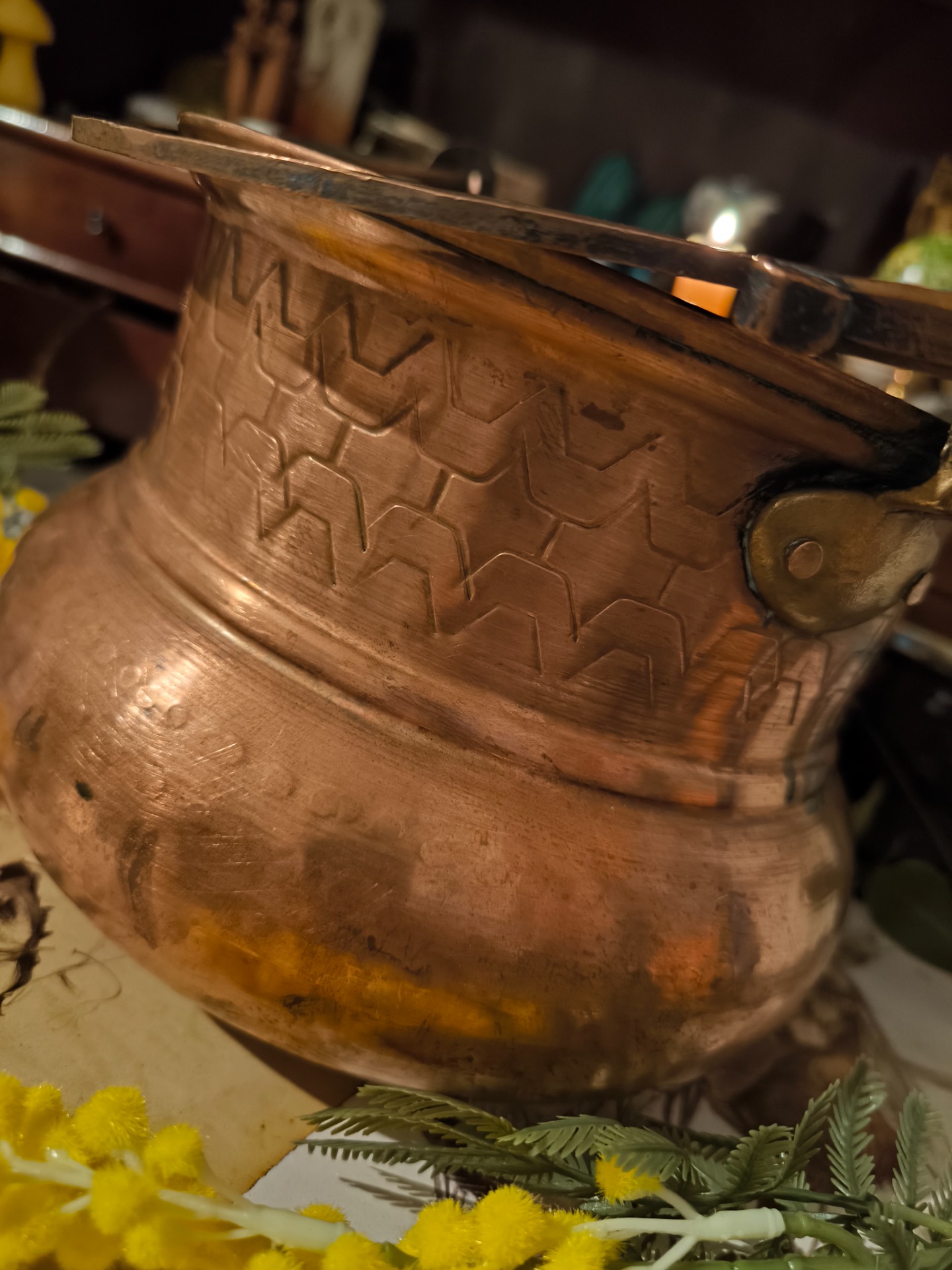 Son cuivre gravé porte des traces, des lignes, des symboles discrets,