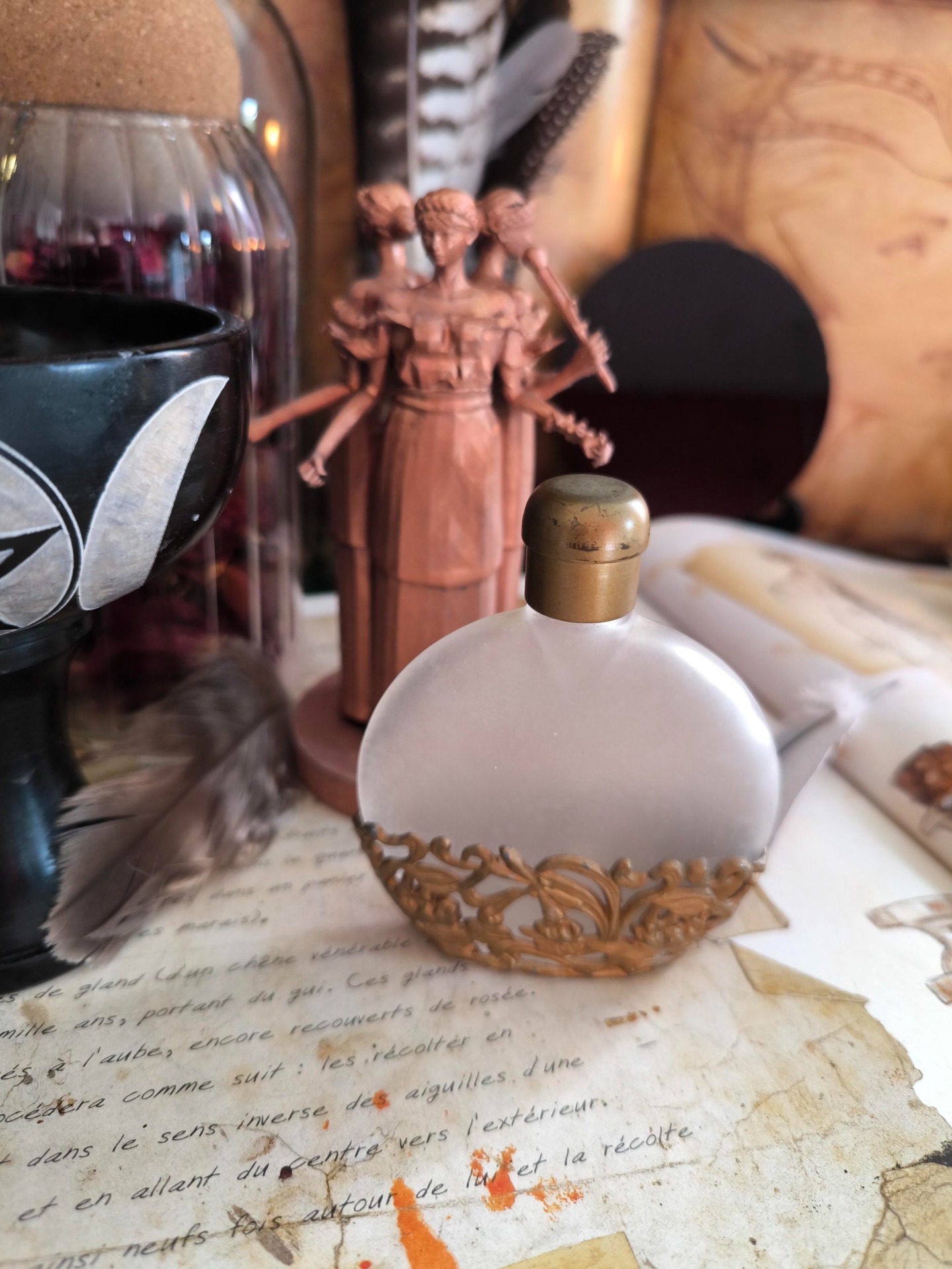 Ce flacon rond et délicat, voilé d'opalescence, porte en son corps la danse légère de la libellule. Créature des métamorphoses, elle invite à la légèreté de l'esprit, au passage des illusions vers la clarté. Parfait pour contenir des eaux lunaires ou des huiles consacrées à la transformation, il guide l'âme vers l'équilibre entre ombre et lumière.