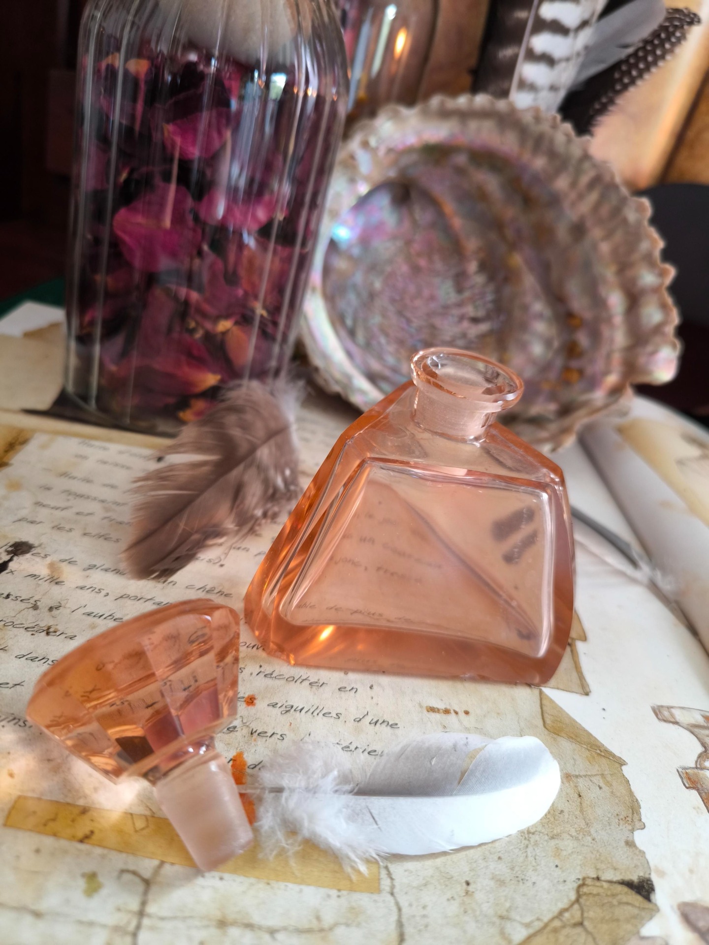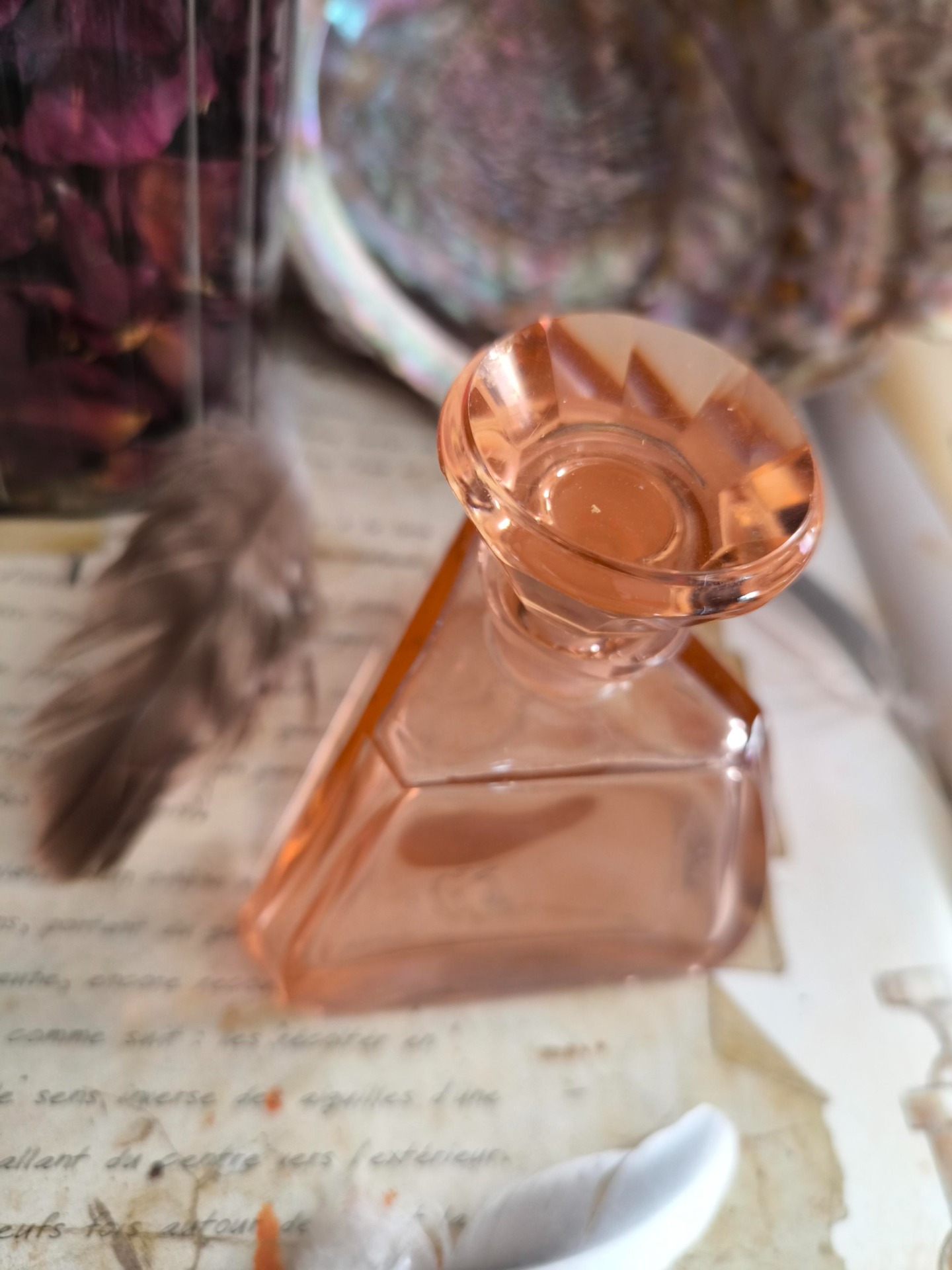 Verre rose délicat taillé en triangle, ce flacon incarne la puissance des trois visages de la Déesse : Vierge, Mère et Ancienne. Sa forme géométrique en fait un réceptacle idéal pour des eaux lunaires consacrées aux rituels de passage, d'équilibre ou de transformation.