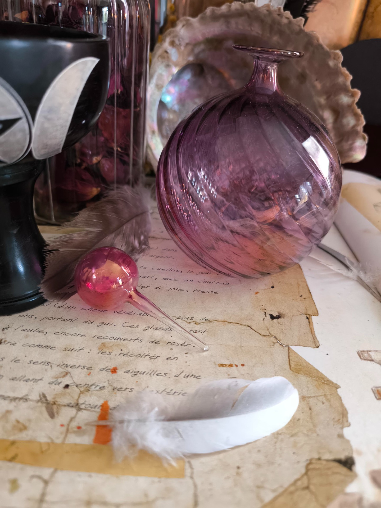 Petit globe cristallin aux reflets violets, ce flacon semble né d'un rêve alchimique. Il accueille les eaux lunaires et les essences qui ouvrent la porte aux songes, aux intuitions et aux révélations subtiles. Chaque goutte déposée en son sein devient murmure d'améthyste, caresse d'étoile et passage vers l'invisible.