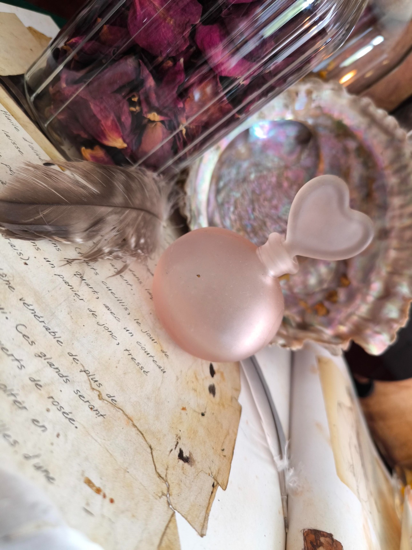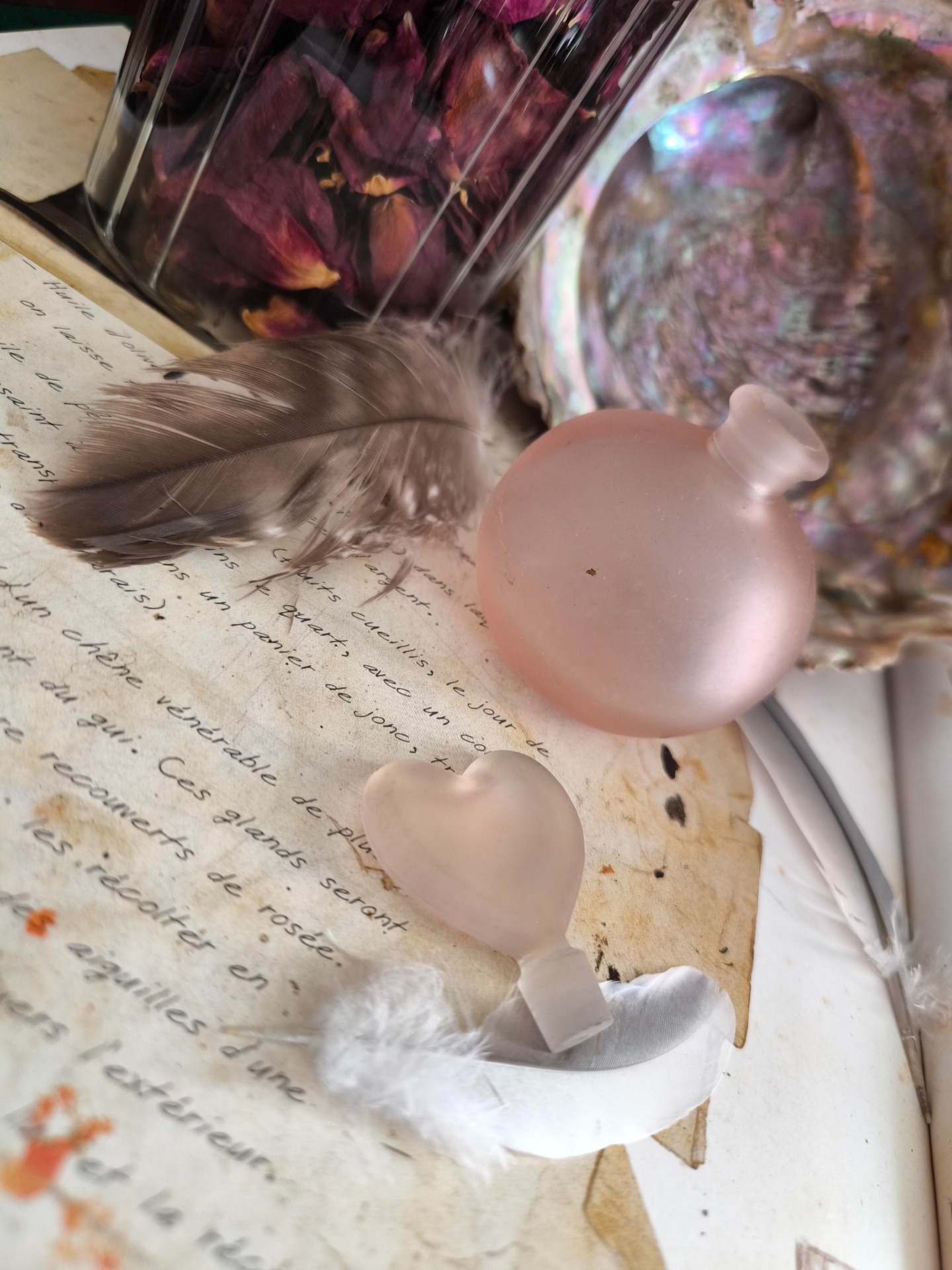 Sphère délicate en verre rose givré, son bouchon en forme de cœur scelle les élans les plus tendres. Il est l'écrin des eaux lunaires consacrées à l'amour, à la guérison du cœur et aux rituels d'union.