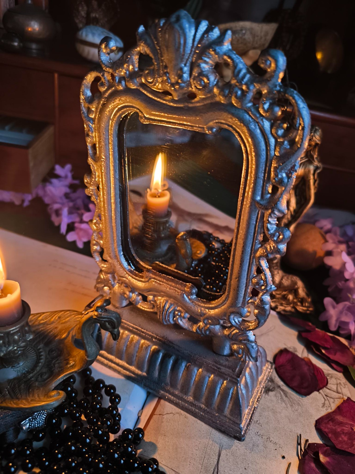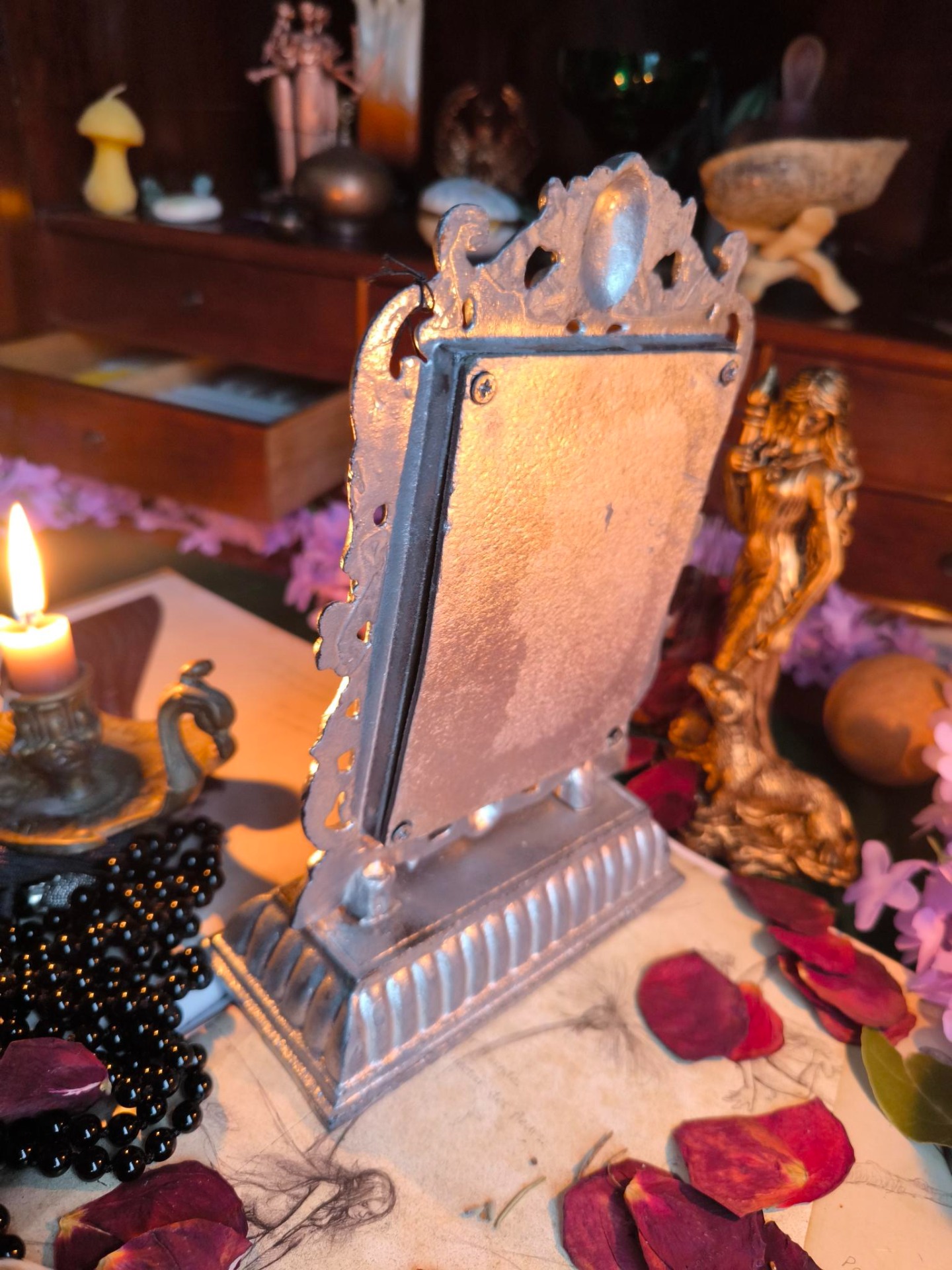 Dans les traditions magiques, l'argent symbolise la lune, l'intuition et les rêves. Ce miroir est donc un compagnon parfait pour les pratiques de vision intérieure, la méditation ou les rituels nocturnes.