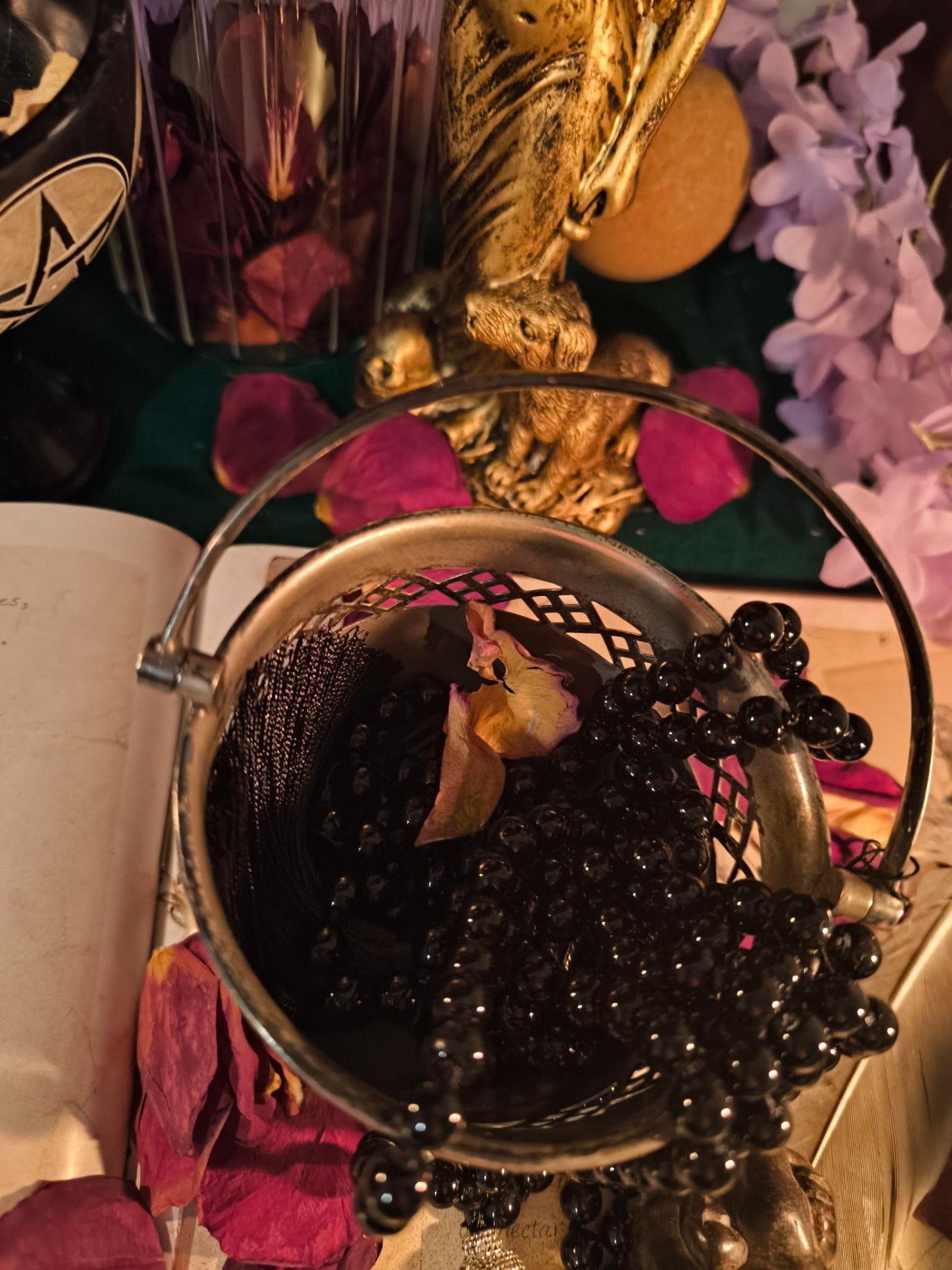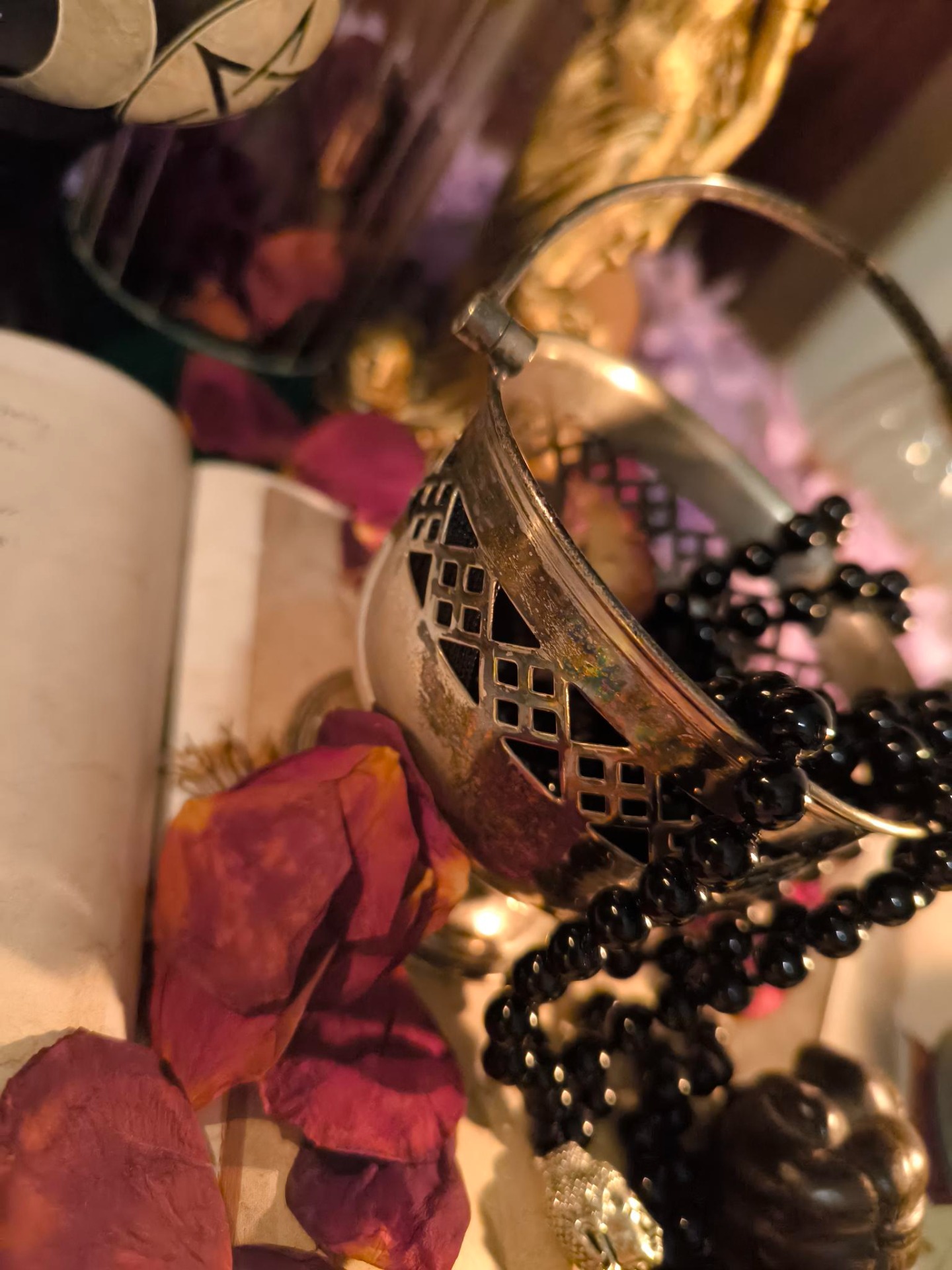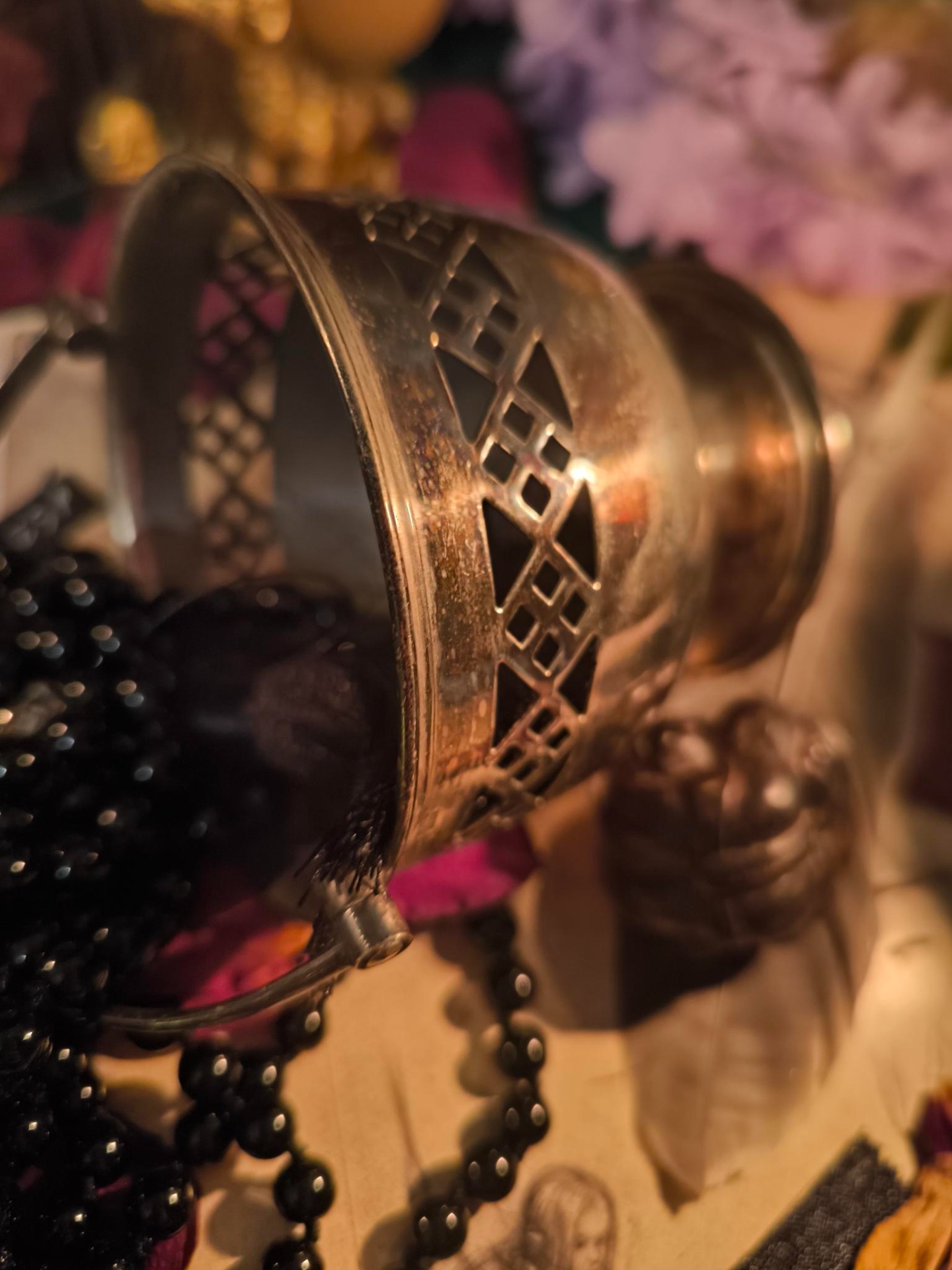 Sa dentelle de métal laisse danser la lumière comme une prière silencieuse, et son anse délicate invite à le porter avec respect.