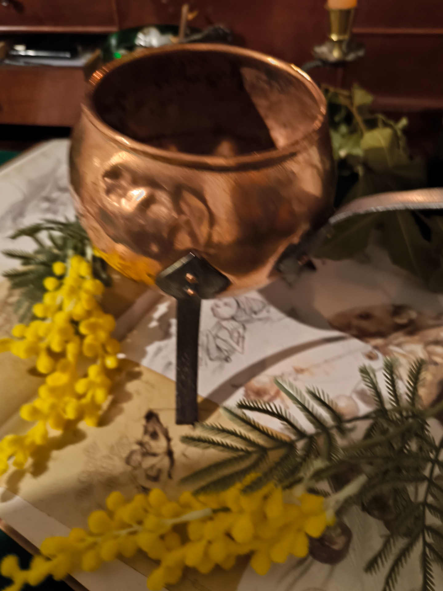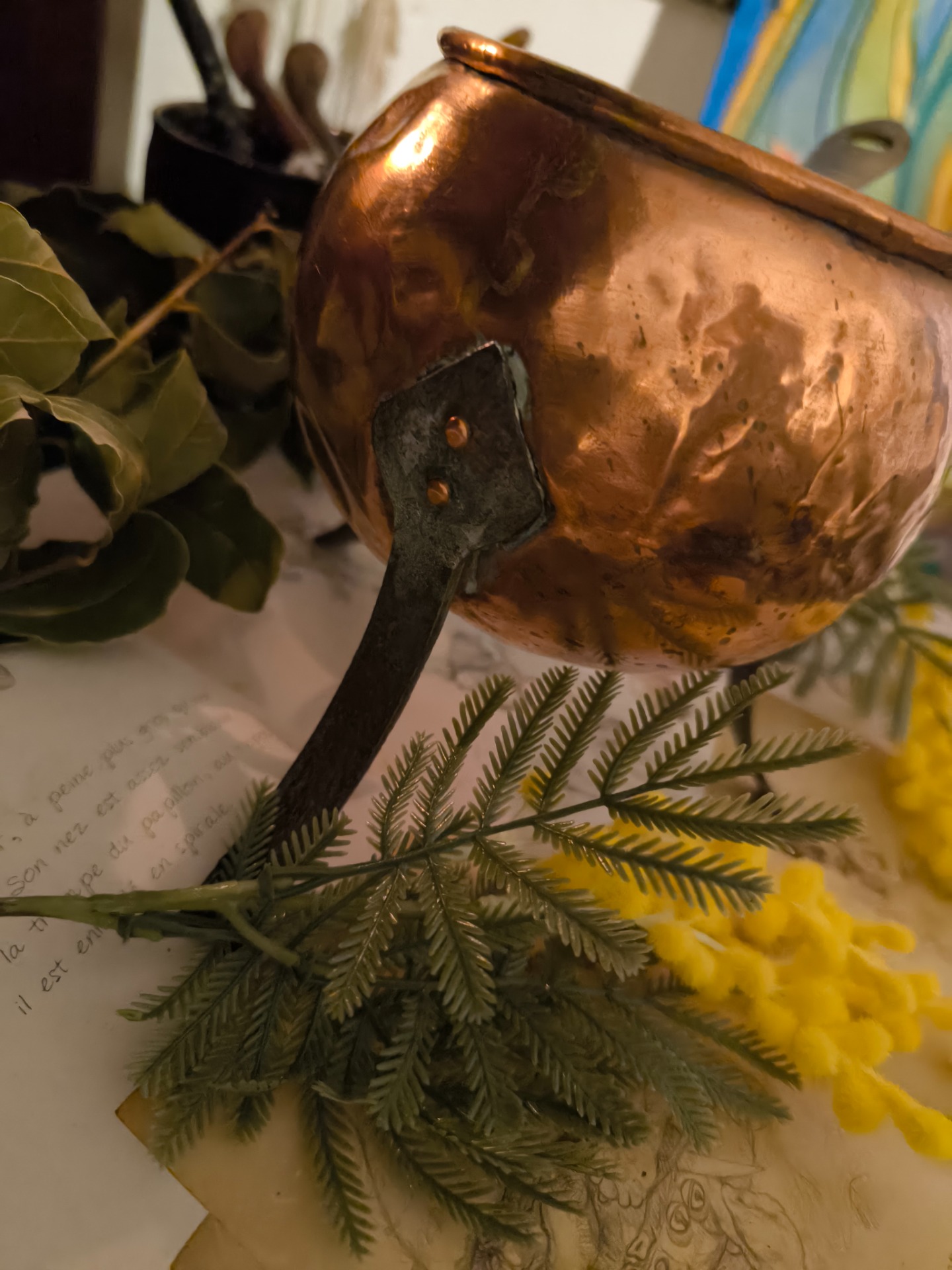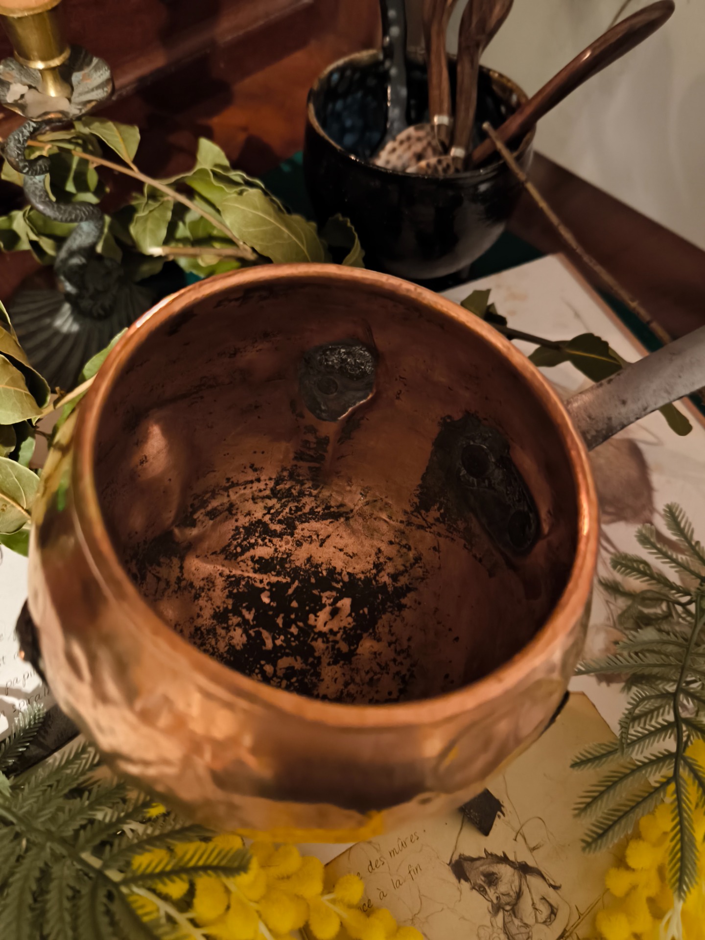 Ce petit chaudron de cuivre, dressé sur ses trois grands pieds de fer, semble attendre le retour d'une sorcière au crépuscule.