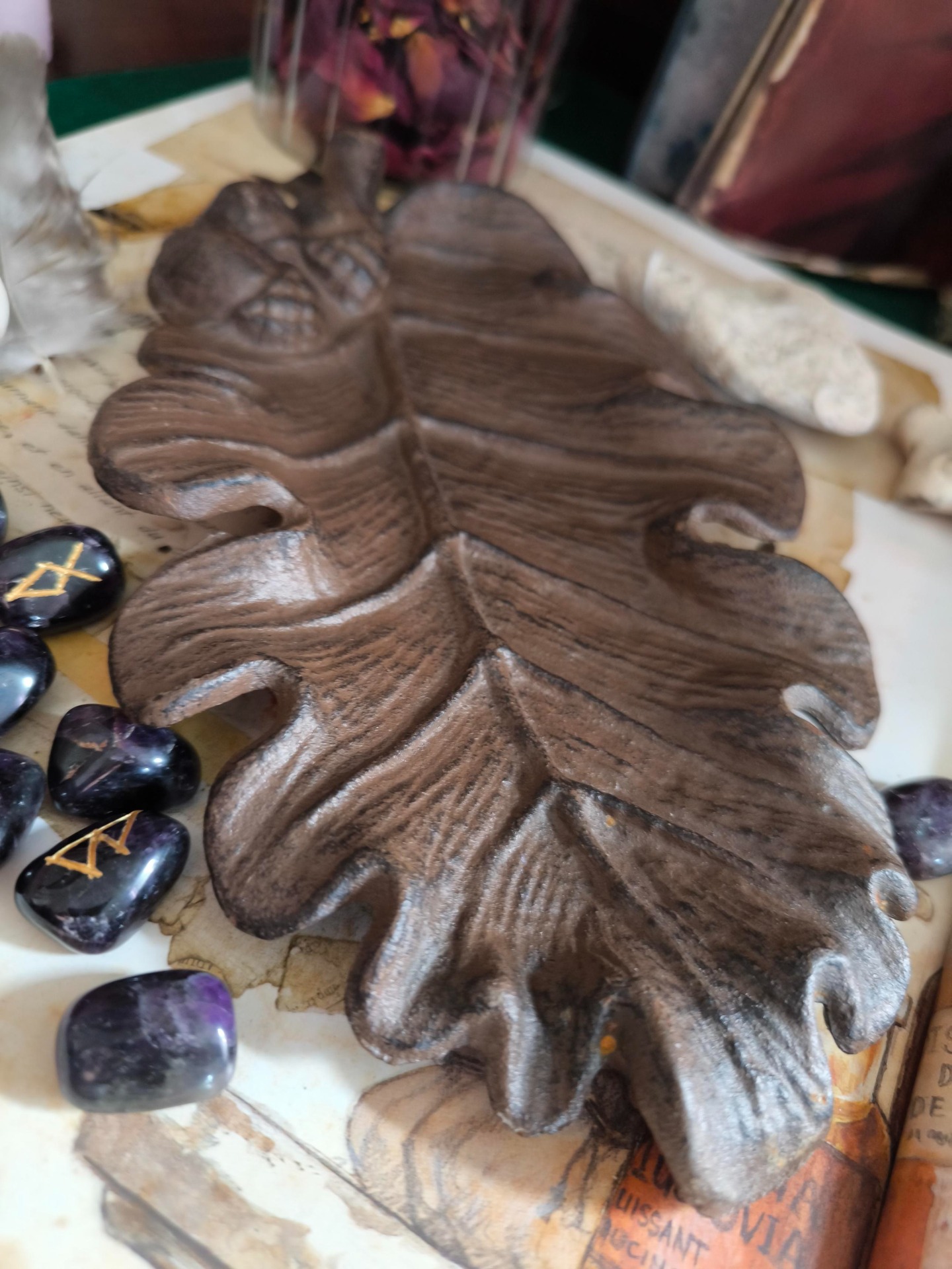Taillé en forme de feuille de chêne ornée de ses glands, ce plat lourd et solide incarne la force, la protection et la sagesse des anciens bois. Support d'offrandes, il devient un autel miniature où déposer fruits, fleurs, pierres ou herbes. Il relie directement aux esprits de la forêt, aux ancêtres et à la puissance enracinée de la Terre.