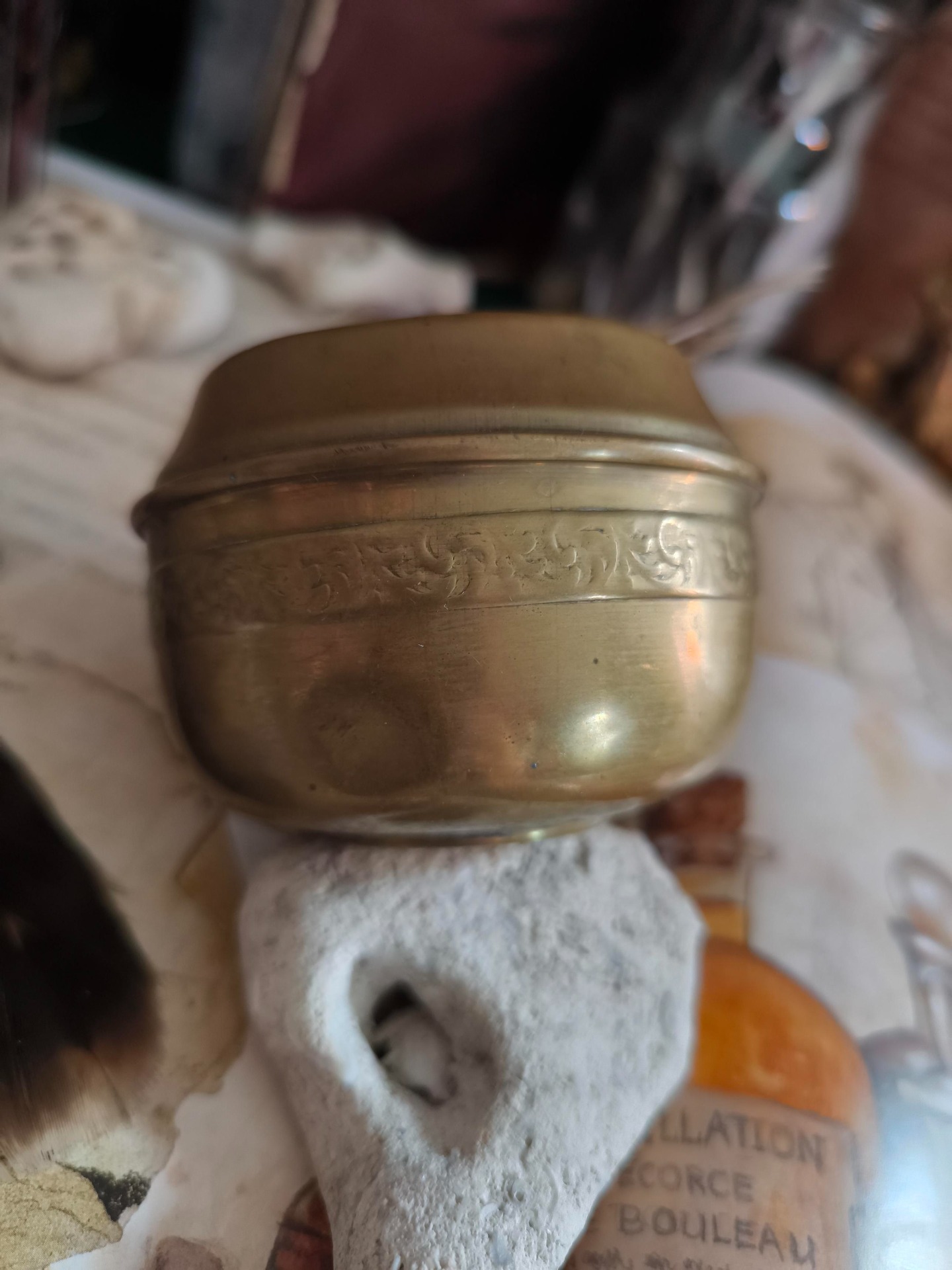 Petit et discret, ce pot de métal semble avoir été ciselé par les elfes eux-mêmes. On y dépose des herbes séchées, des cendres d'encens, ou des souhaits roulés en papier. Protecteur, il garde les secrets confiés dans son ventre de métal et les offre à la lune ou aux ancêtres.