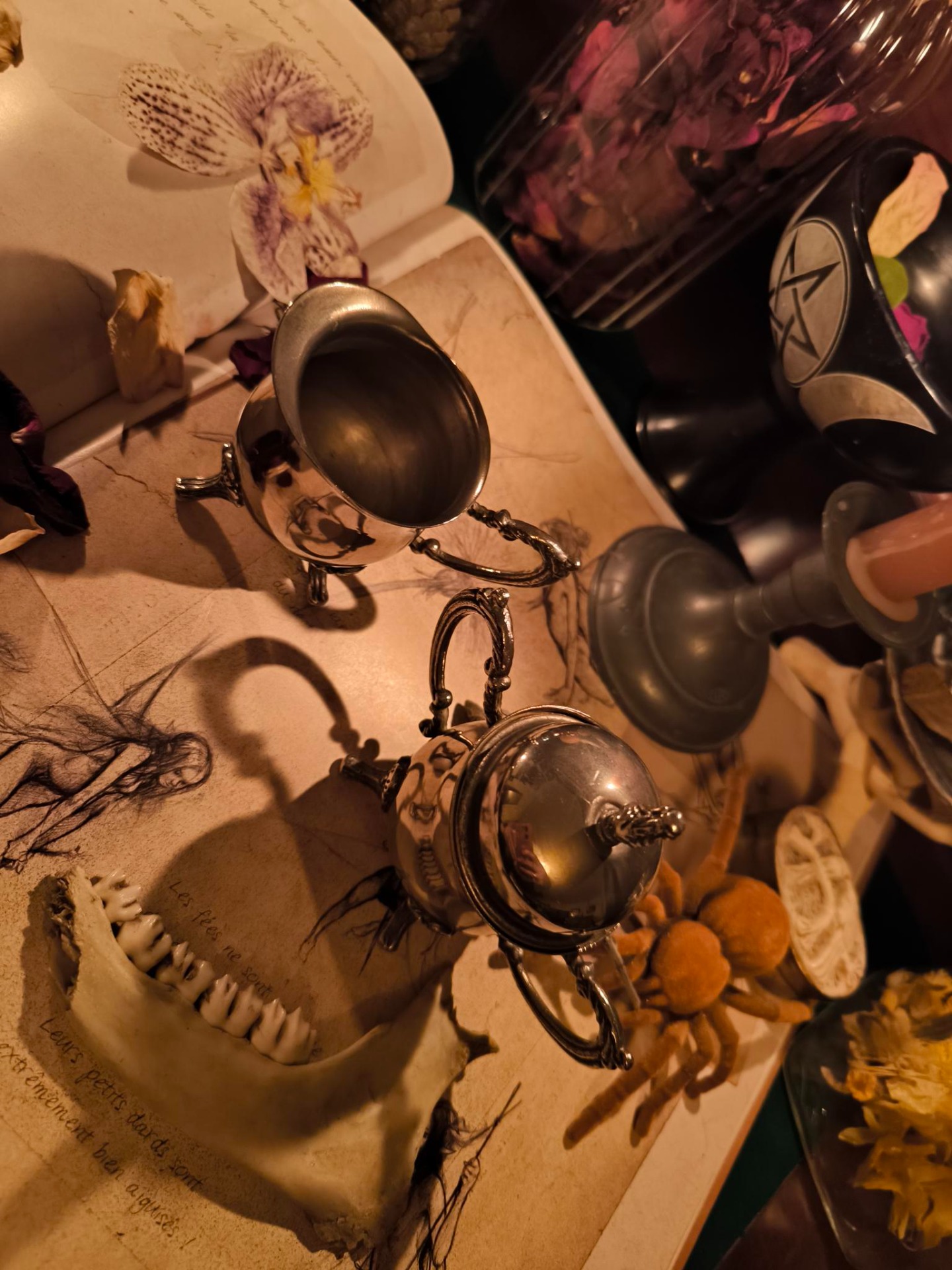 Le petit pichet accueille les élixirs sacrés, tandis que le pot à deux anses reçoit les eaux bénies ou les infusions de lune.