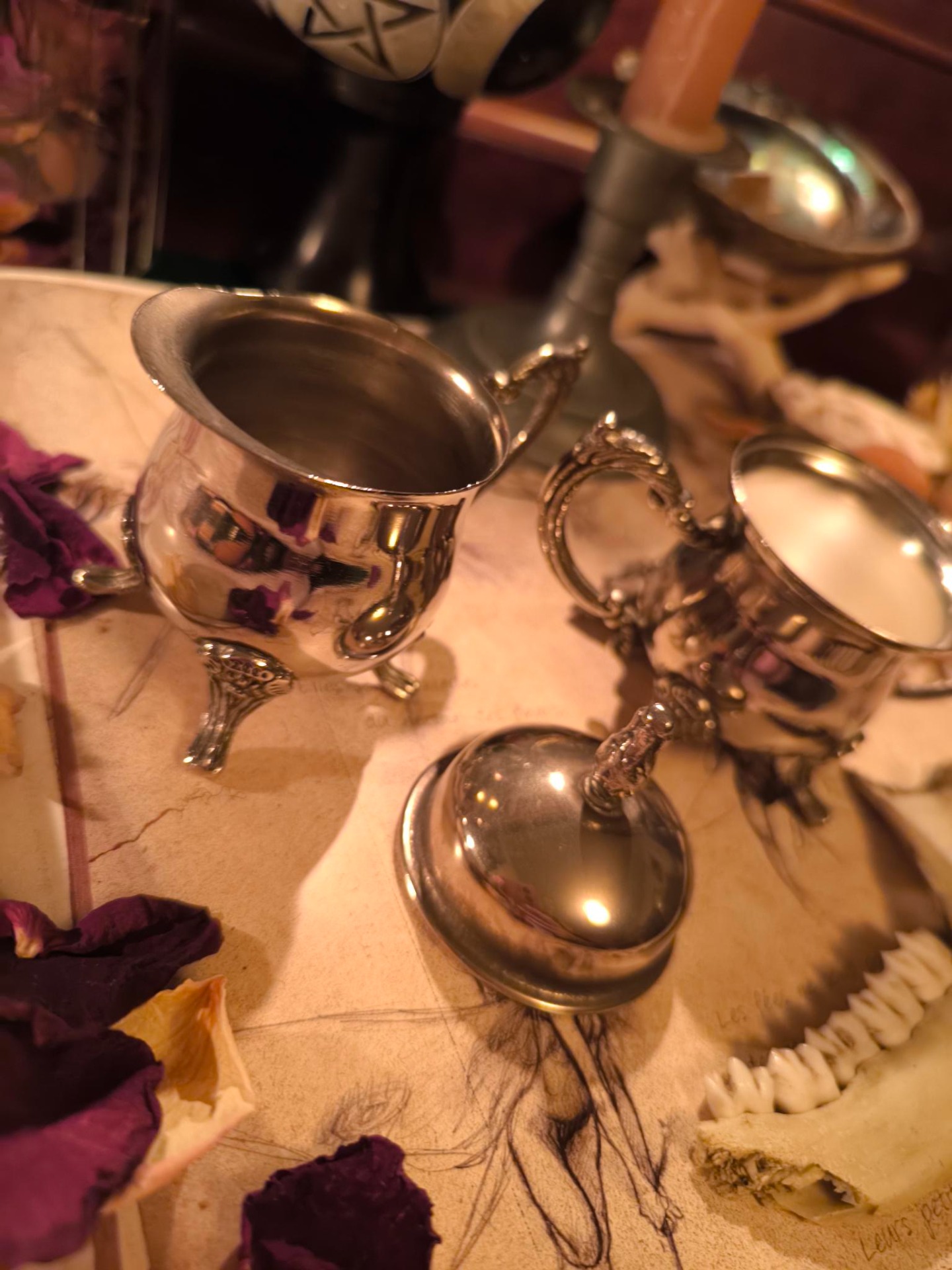Leur éclat d'argent, porté par trois pieds en forme de pattes de lion, évoque la force et la noblesse des offrandes d'autrefois.