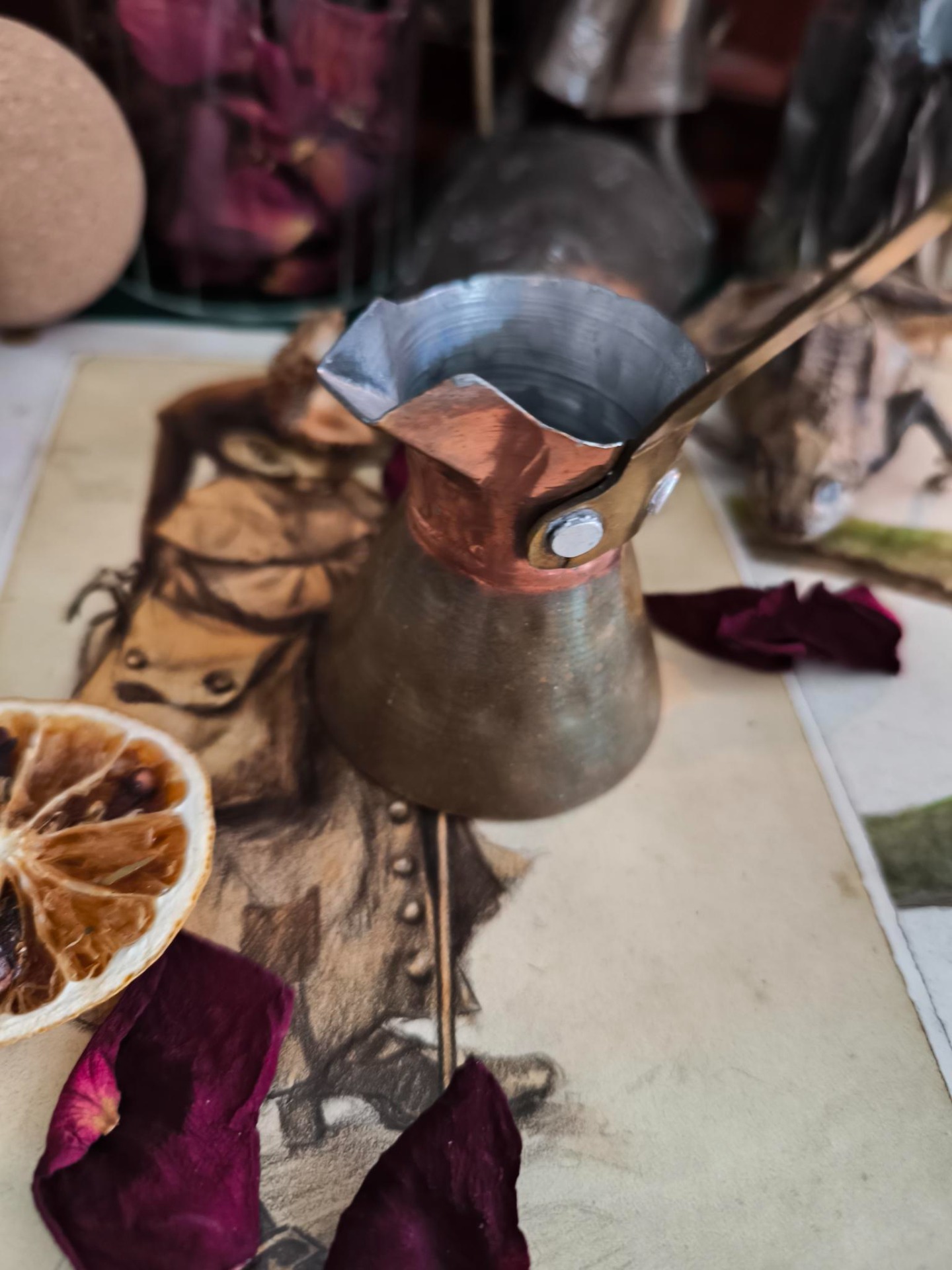 Le bec, légèrement irrégulier, donne l'impression qu'il a été martelé sous une lampe à huile, dans une ambiance d'herbes séchées et de secrets murmurés. Le cuivre, lui, capte la lumière comme s'il en gardait la mémoire.