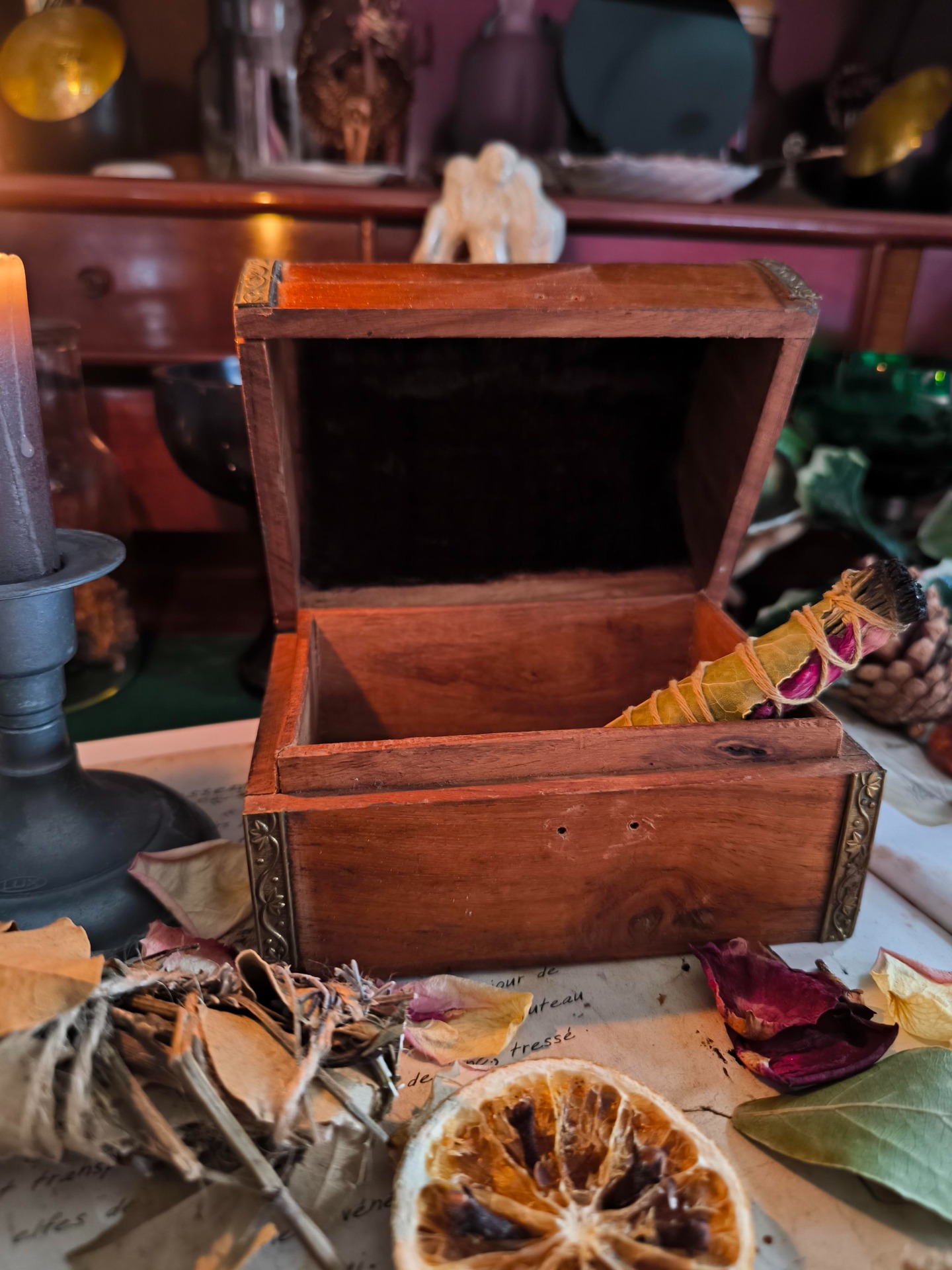 Ce coffret en bois porte sur son bord des gravures qui semblent être des mots elfiques, murmurés par un peuple invisible. Il garde l'aura des forêts et des contes, comme s'il avait traversé les âges pour protéger talismans, herbes ou runes sacrées. Plus qu'une simple boîte, il devient un messager entre les mondes, gardien des secrets murmurés dans la langue des anciens.