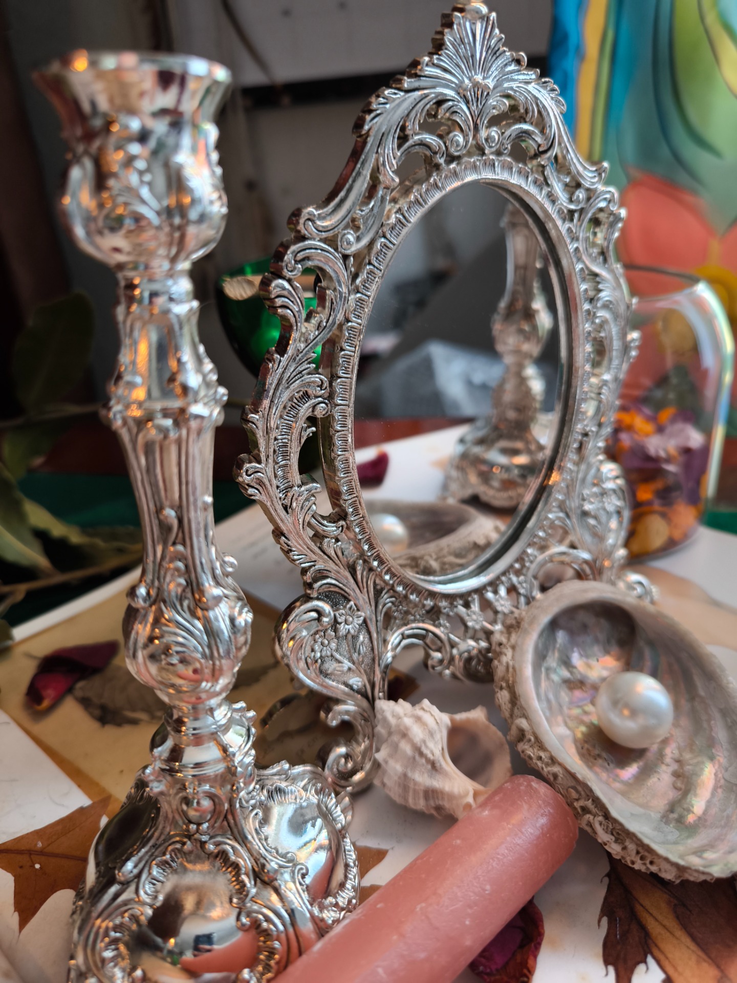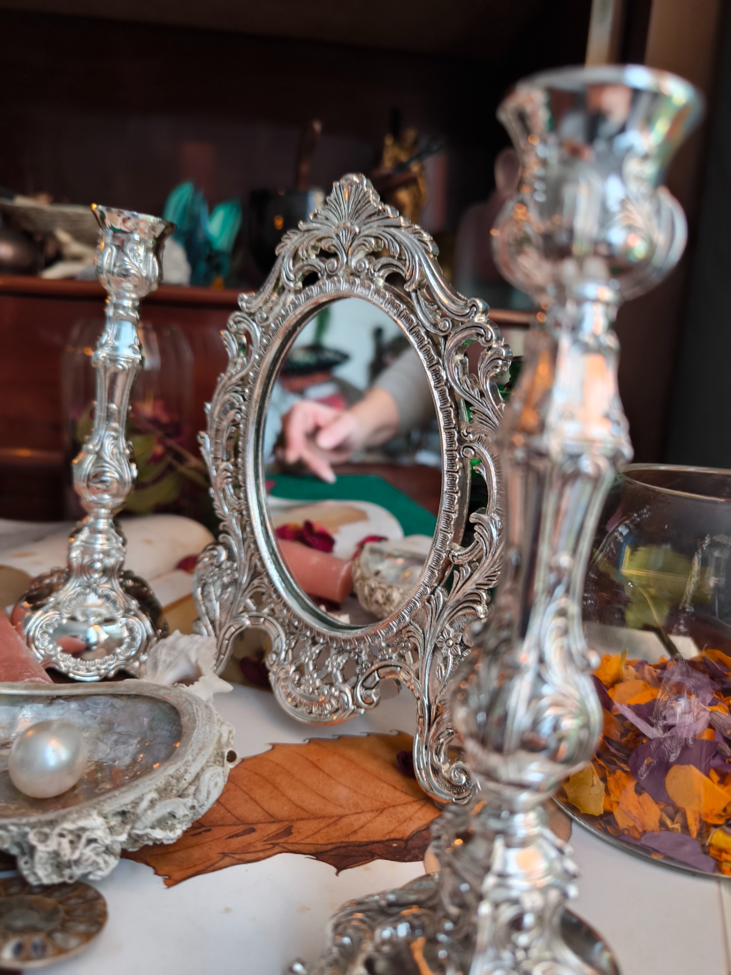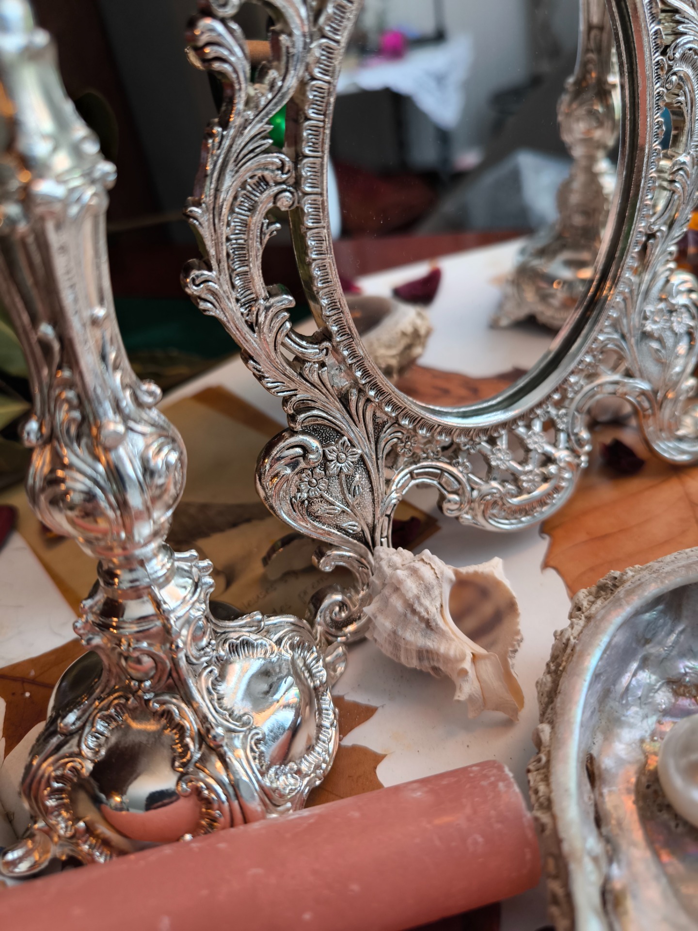 Le métal argenté, finement travaillé, capte la lumière des flammes et la renvoie doucement dans le miroir, créant un jeu de reflets presque magique.