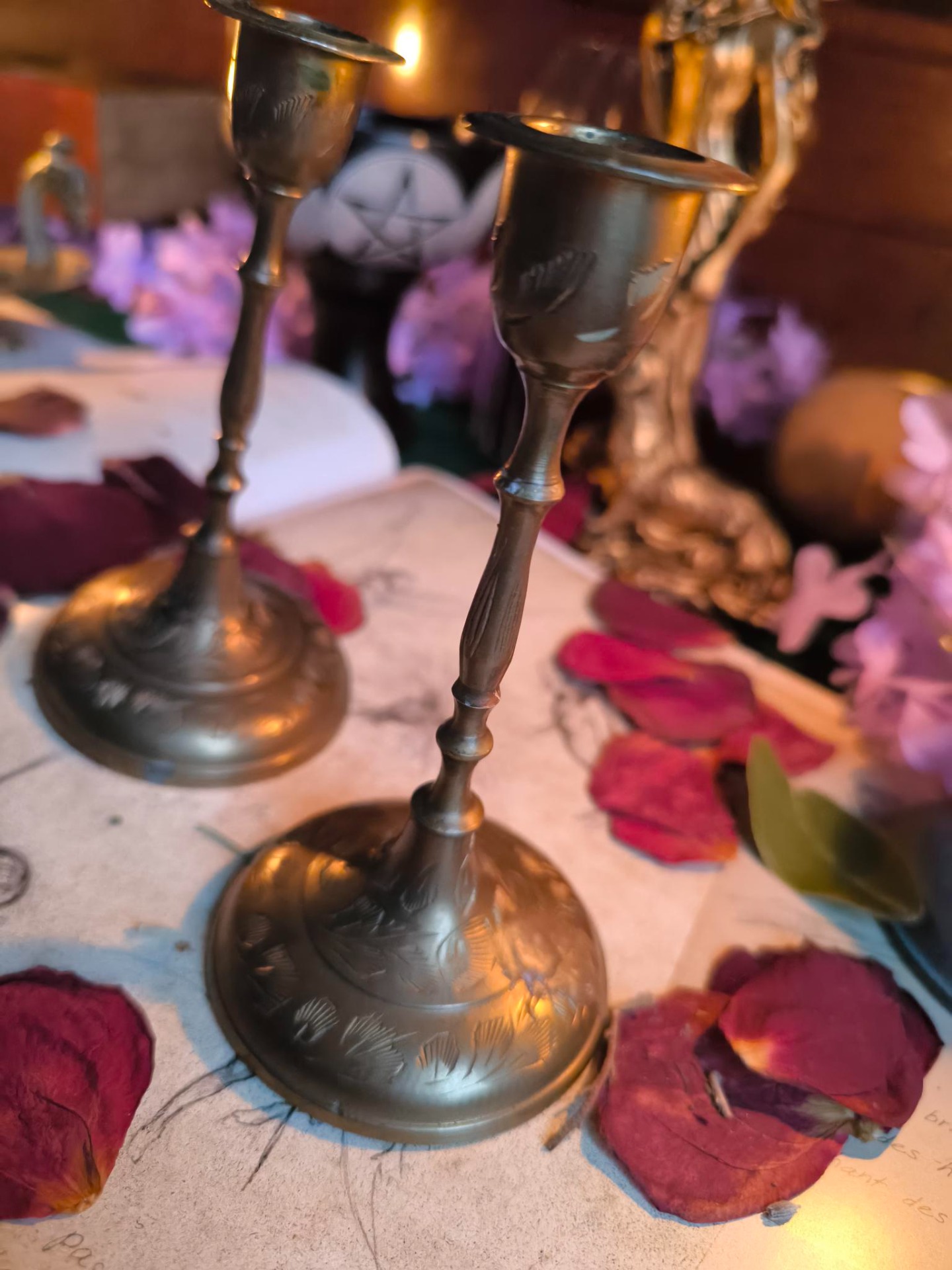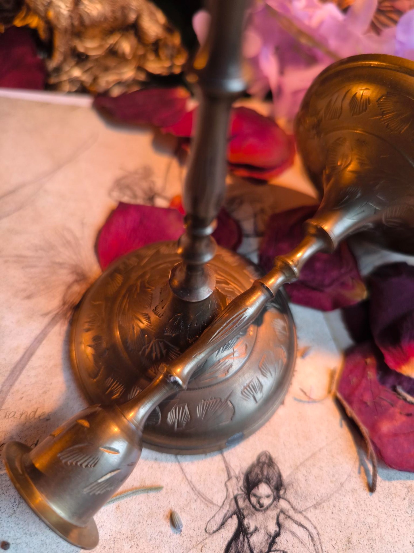 Ces deux petits chandeliers en laiton, délicatement gravés, semblent sortis d'un ancien sanctuaire.