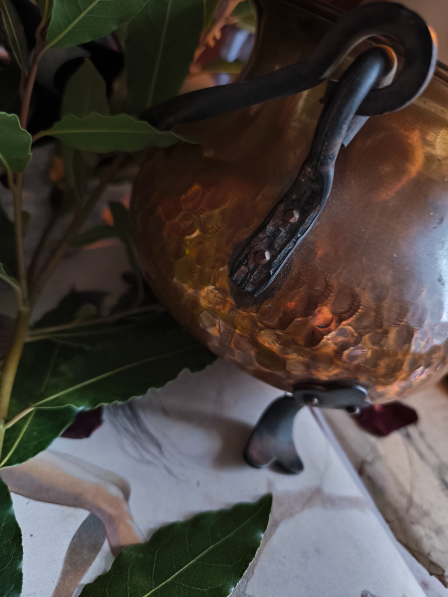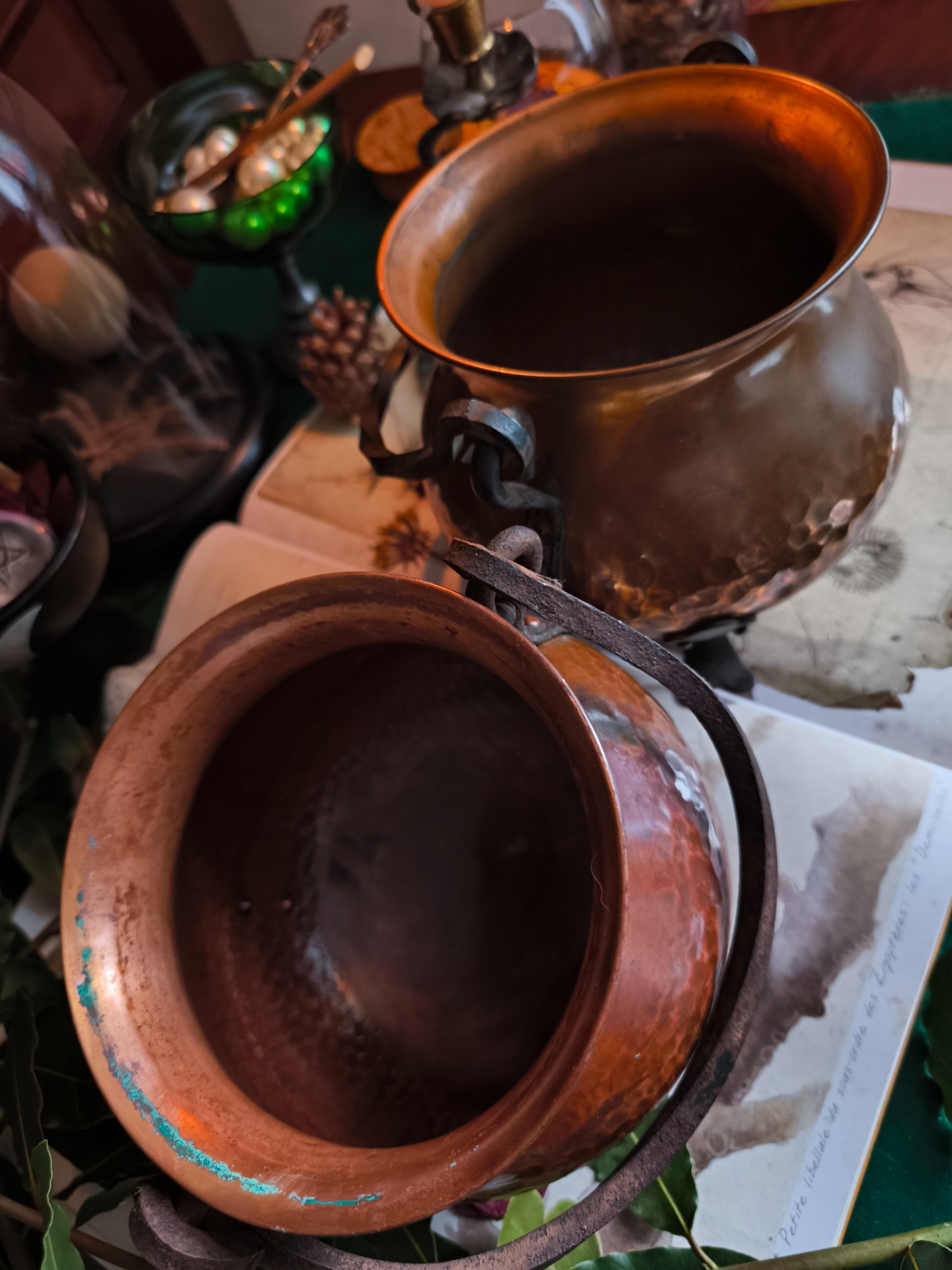 Le cuivre, marqué par le temps, porte la mémoire du feu, des infusions et des rituels murmurés à voix basse.