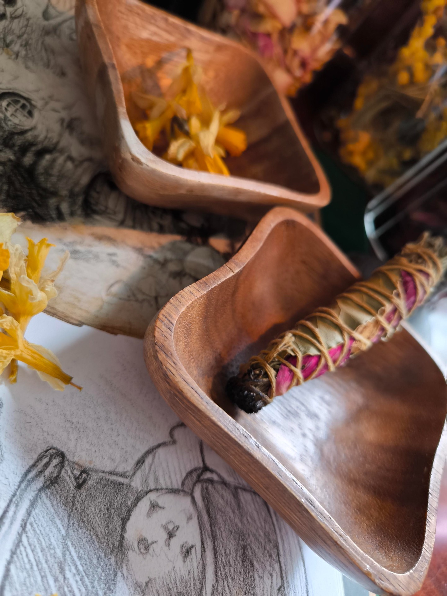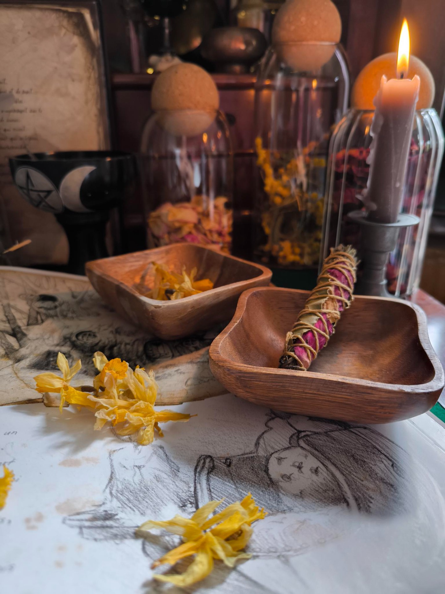 Deux petits bols façonnés dans le bois, simples et authentiques. L'un parfait, l'autre légèrement marqué par le temps, comme un duo qui rappelle que l'offrande est belle dans sa pureté comme dans ses cicatrices. Ils accueillent fleurs, herbes ou pierres et deviennent messagers entre vos mains et l'invisible.