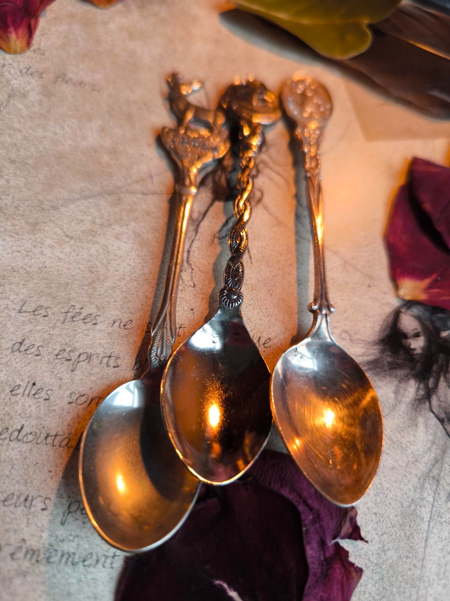 Chacune de ces petites cuillères semble avoir appartenu à une sorcière discrète ou à un alchimiste des bois.