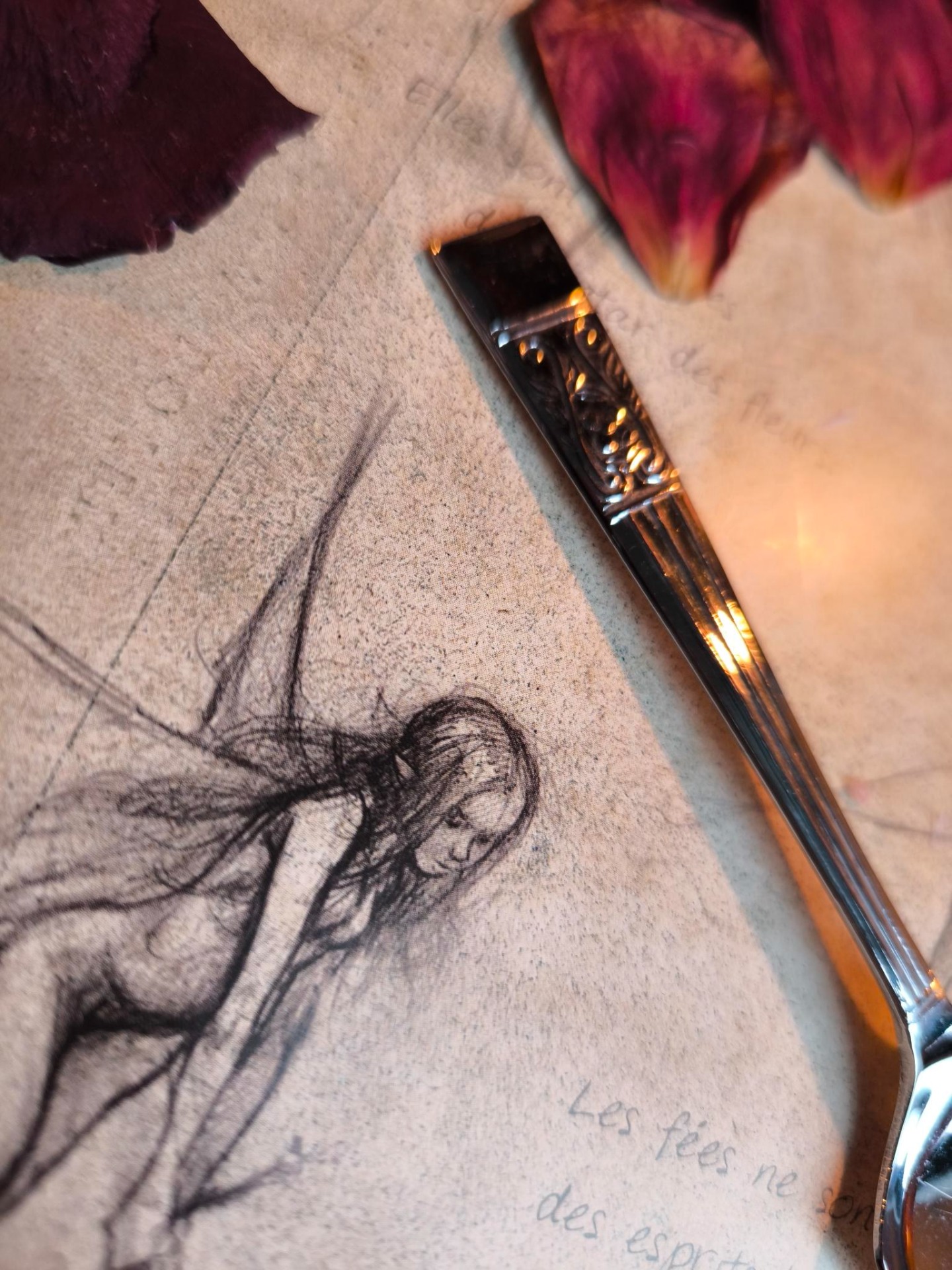 Elle glisse entre les pétales comme un éclat de lune, prête à servir dans un rituel doux, une infusion, un autel parfumé.