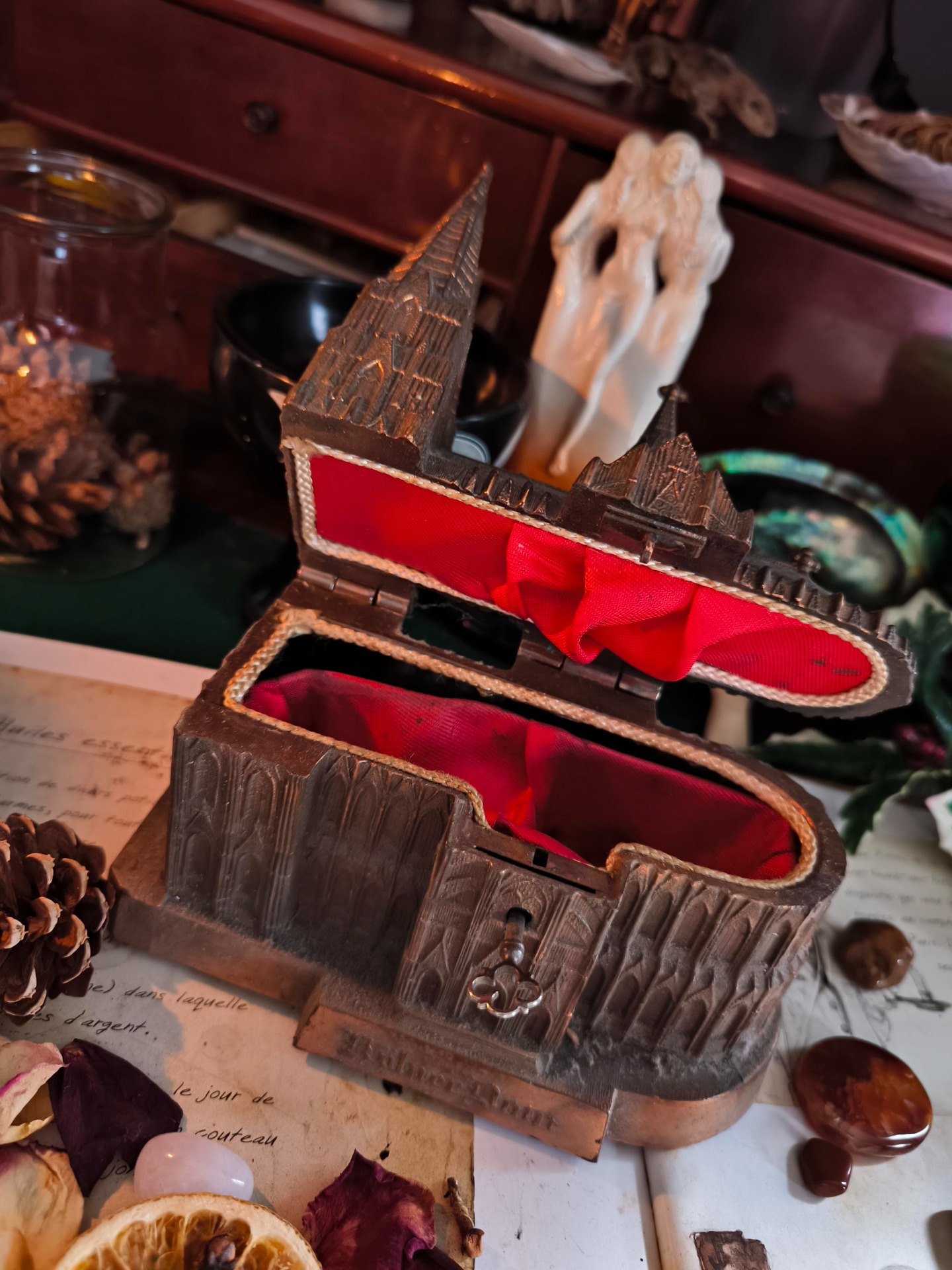 Façonnée en métal, cette boîte reprend les lignes majestueuses d’une cathédrale gothique. Ses flèches effilées et ses murs gravés semblent chuchoter les échos de siècles passés. Plus qu’un objet, c’est un petit sanctuaire où déposer vos trésors, vos lettres ou vos talismans, protégés comme dans une nef de pierre. Elle devient un écrin sacré, gardien des confidences et des mémoires silencieuses.