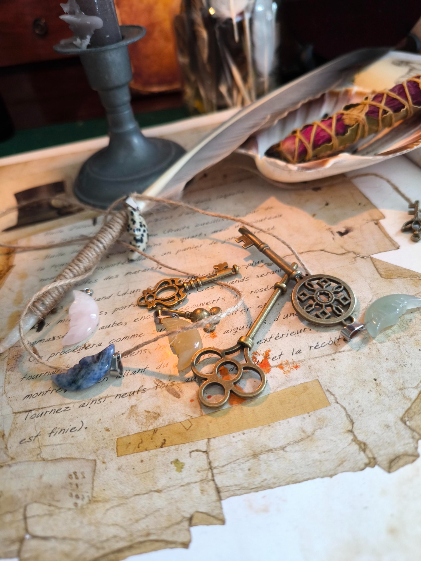 Chaque plume porte déjà un petit symbole – souvent une clé, gardienne des passages invisibles. L’autre extrémité reste volontairement libre, pour que la sorcière y tresse elle-même un fil, une marque, un secret : ainsi, l’objet devient sien, chargé de son empreinte.